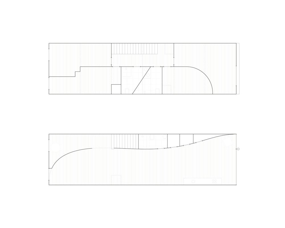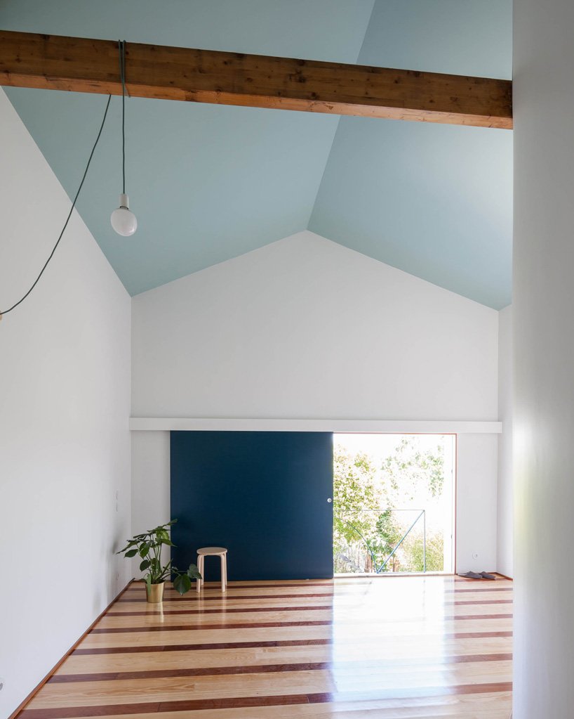 fala atelier has designed the ground level of ‘house in fontaínhas’ as a volatile, open plan space, characterized by two continuous white surfaces. conversely, a sequence of irregular spaces makes up the first floor, which is a composition of intricate rooms and rhythmic collisions of different geometries. the complexity is introduced to accommodate all the necessary programs, adapting to the narrow perimeter of the site. a set of equally distanced wooden beams supporting the roof causes inconvenient intersections.