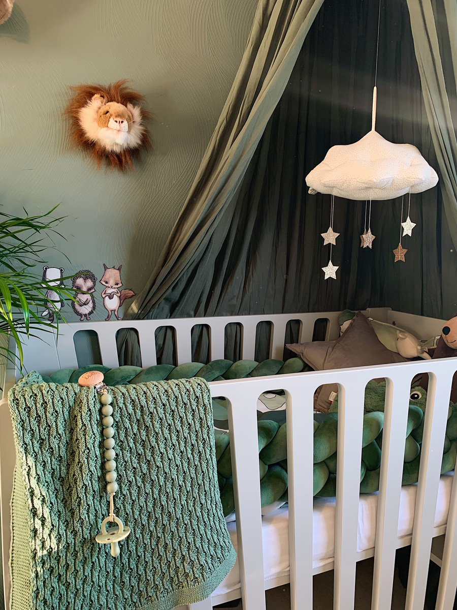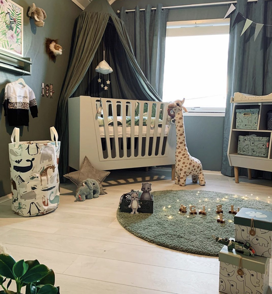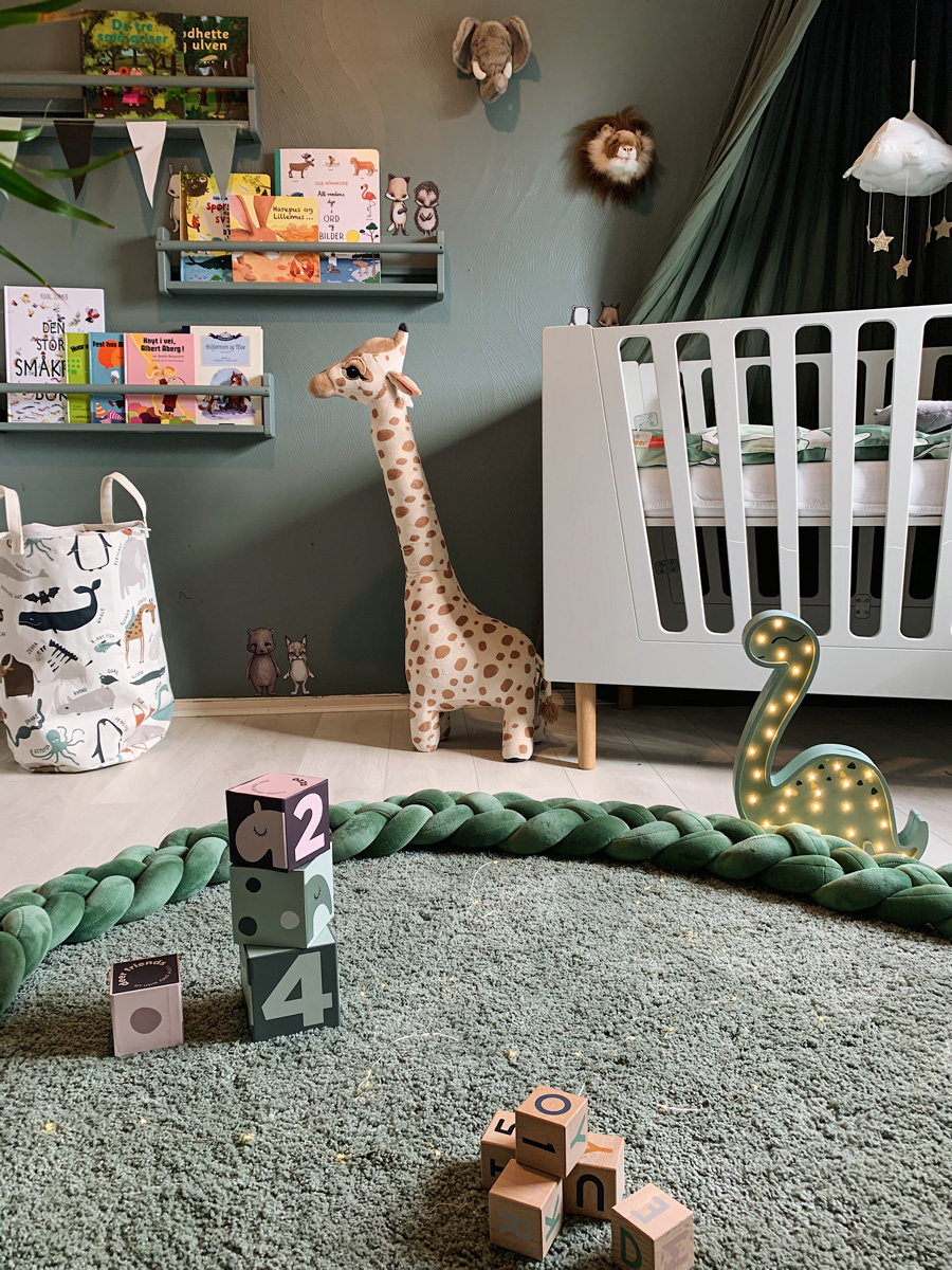 All the items are so perfectly chosen in this nursery, layered in just the right amount of texture and interest. The very first item Elin bought was the cute giraffe by H&M, standing next to the crib as a friendly guardian. Her other must-haves for the nursery were all the animal patterned items by Done by Deer and their green furniture that fitted the theme perfectly.