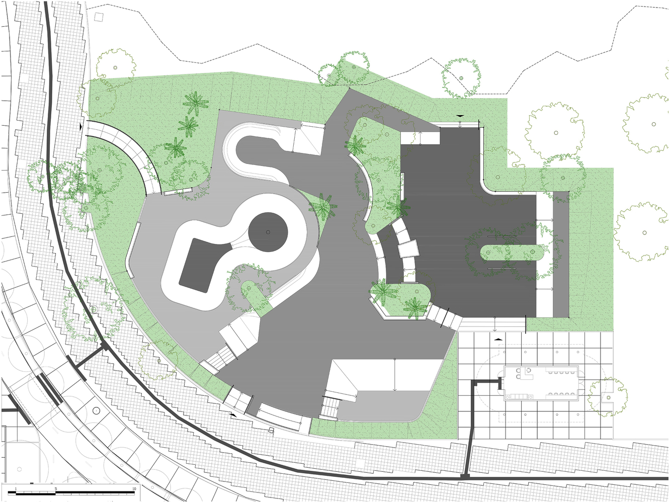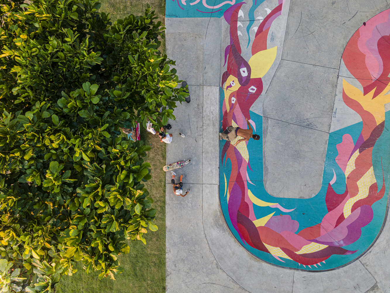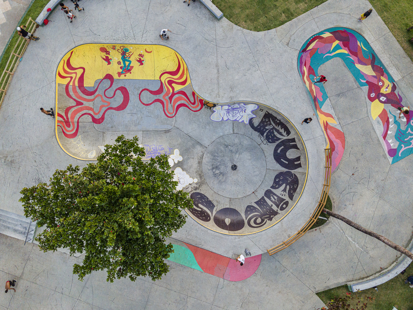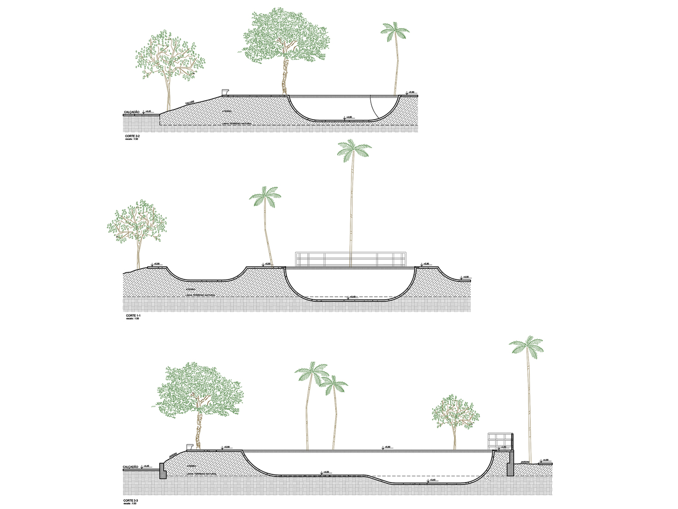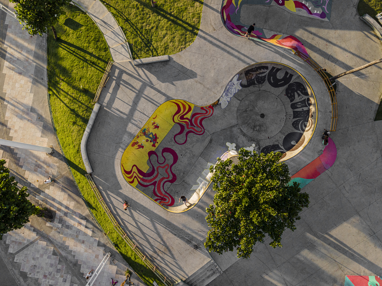 The track is divided into 2 spaces, the street plaza, and the bowl: The street plaza is the part where various obstacles simulate different urban elements for the practitioner to perform the maneuvers, having its design slightly modified and reinforced to allow a better performance of the athlete. The project sought to obey the topography of the terrain, subdividing the space into several levels connected by curved or straight transitions, which are interconnected and conducive to the circuit being made with less effort on the part of the athlete, in addition to contemplating the landscape value of the place. The bowl is the part of the rink intended for vertical skateboarding. It is a specific modality of skateboarding where athletes exhibit a more acrobatic performance. It is a place for more experienced athletes and where greater use of safety equipment is advised.