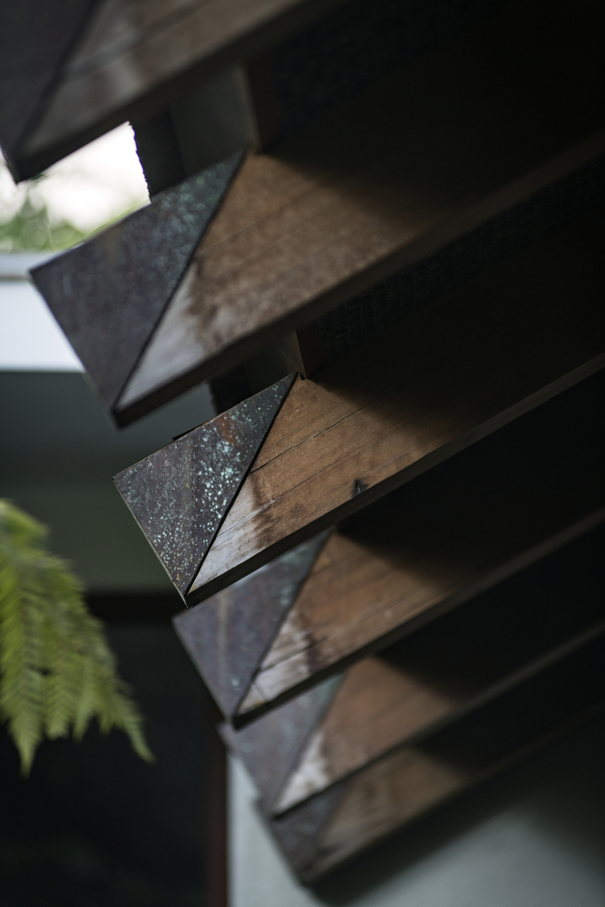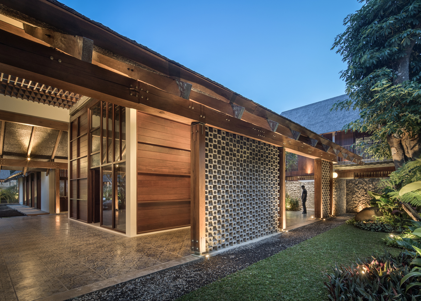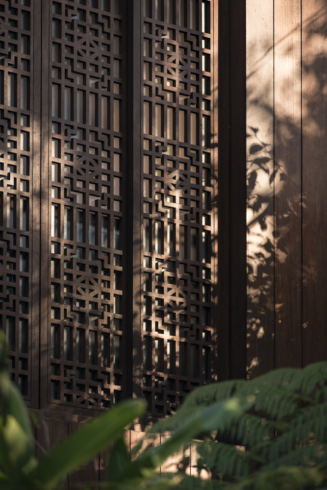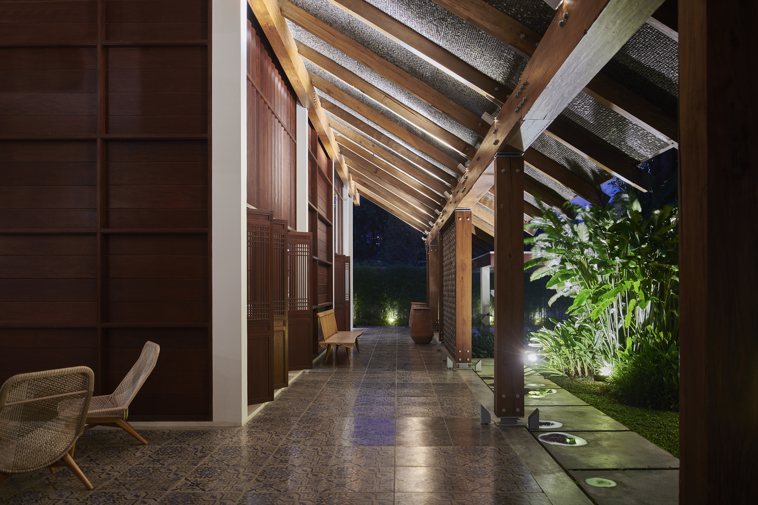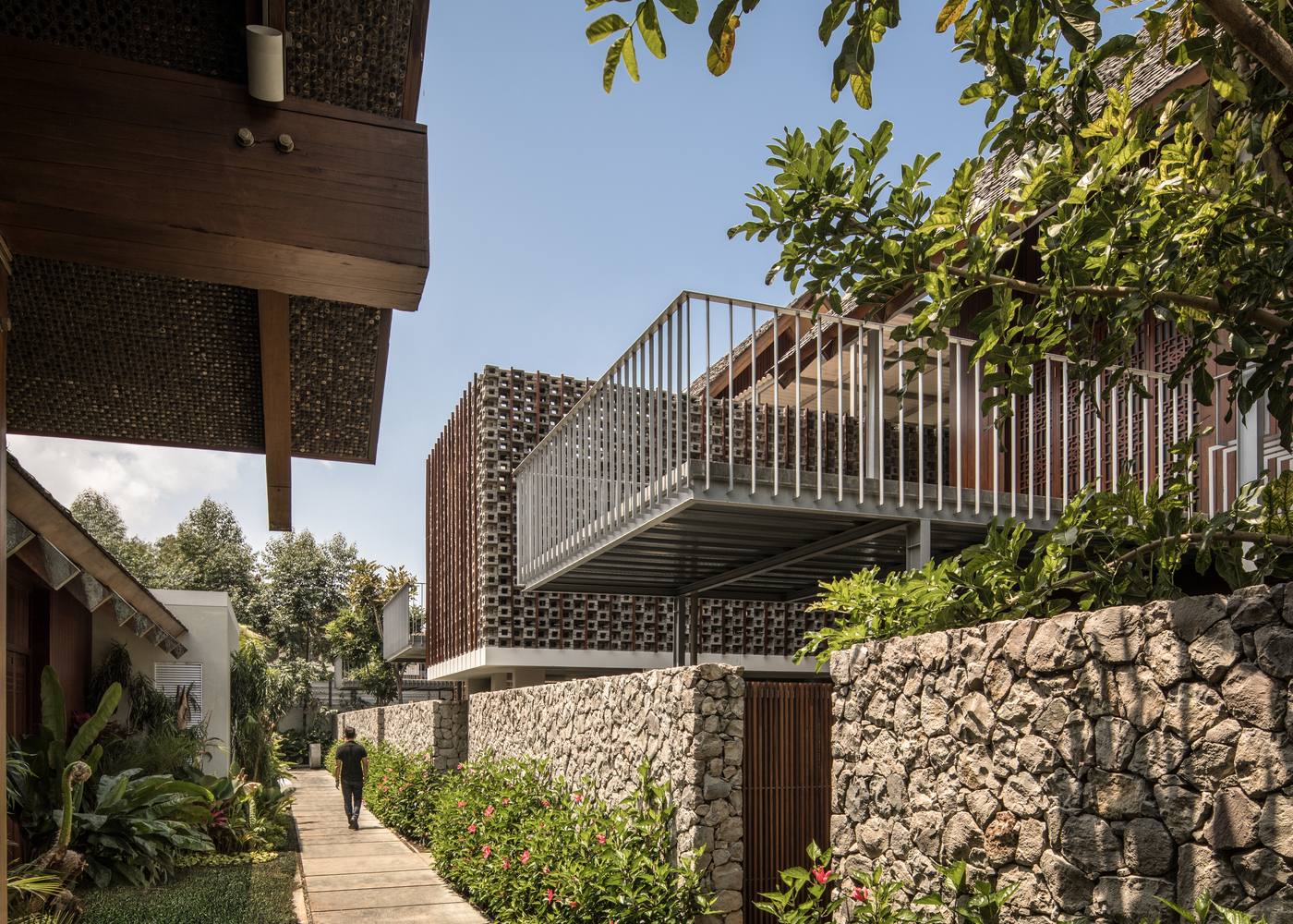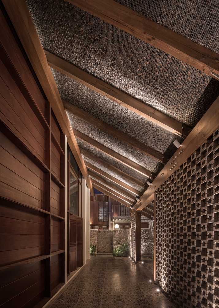 The various rooms and buildings on the property are connected by a series of corridors and footpaths which also helps to cool the property during the harsh sunny day while minimizing the use of air conditioning. To further help with the air circulation, wooden vertical slats and perforated concrete blocks are strategically placed throughout the property which also creates captivating silhouettes and shadows.