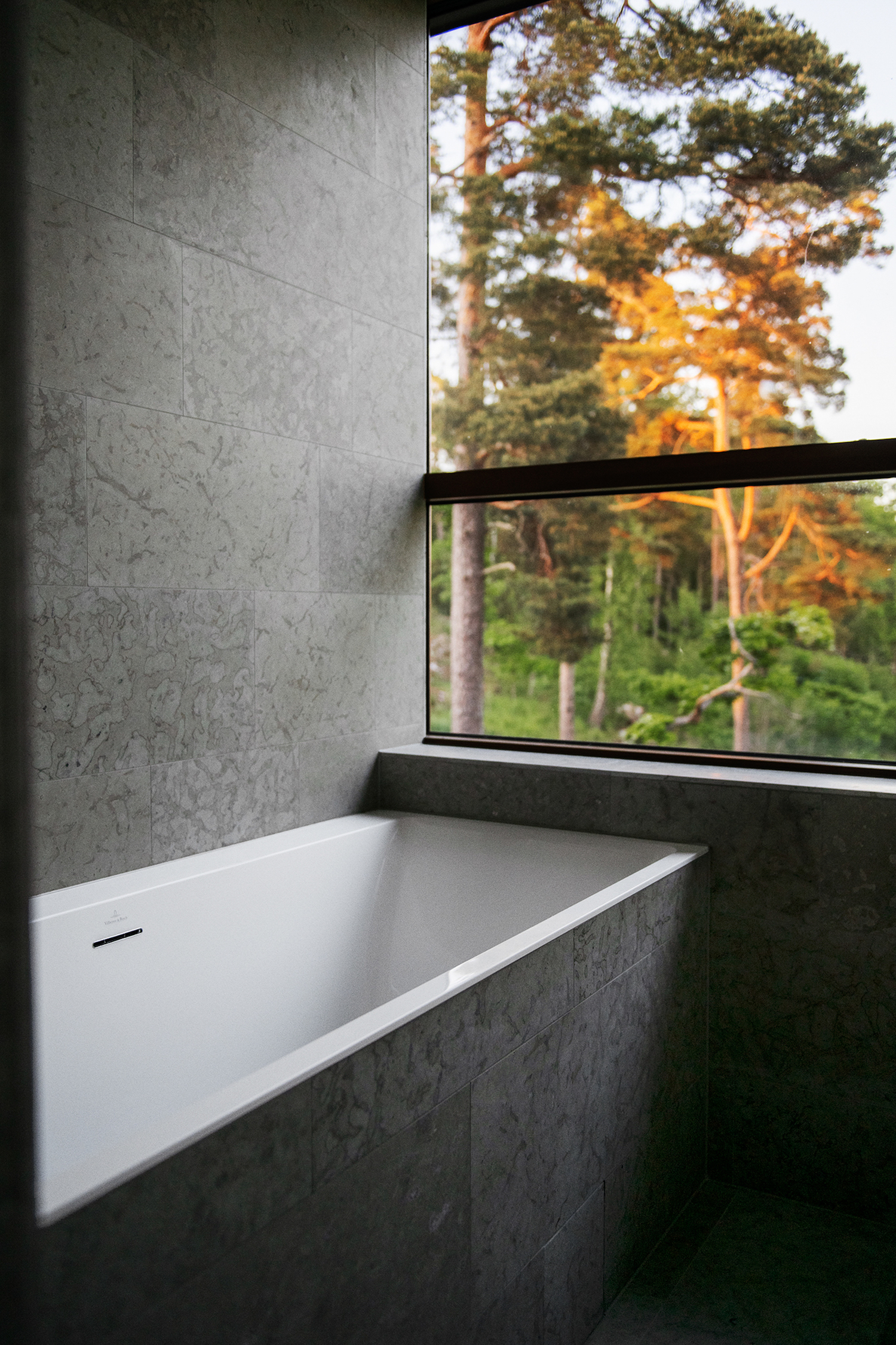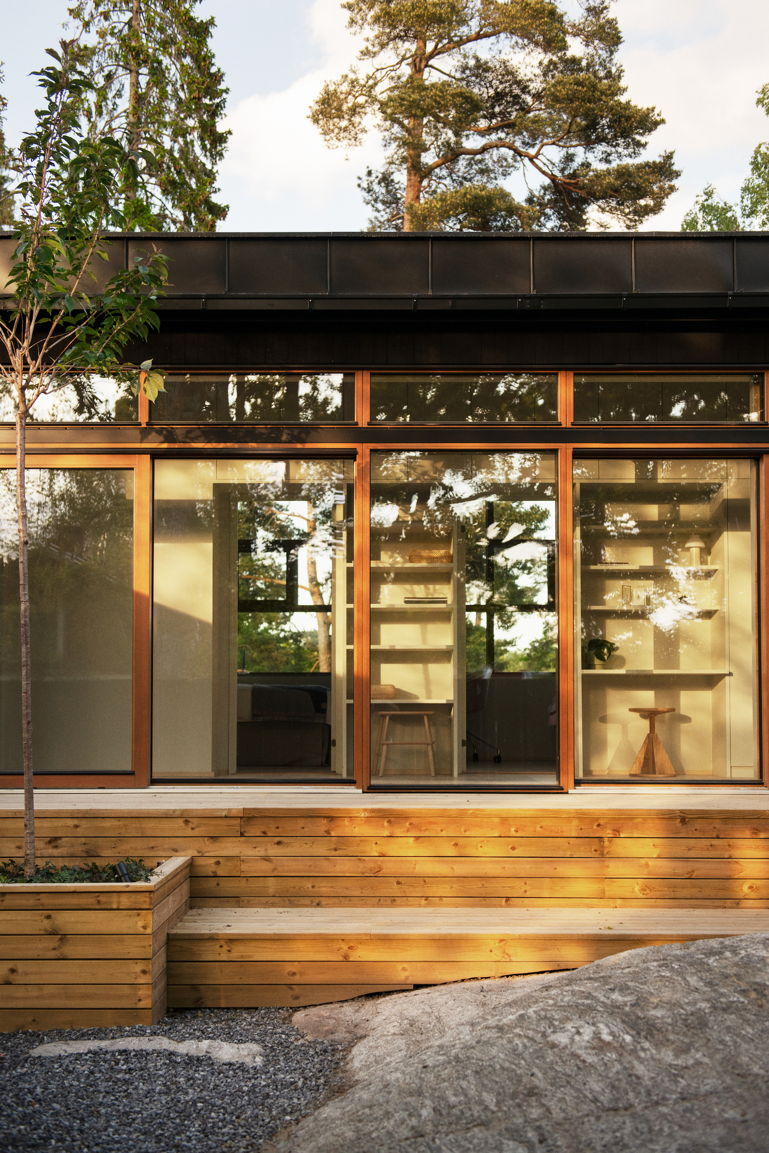 Villa Strömma is a minimal residence located in Strömma, Sweden, designed by AndrénFogelström. On a cliff in the archipelago, overlooking the water, the villa juts out among the treetops. The residence is entered from the higher level, a dramatic entrance via a span that spans a mountain crevasse. The place is characterized by mature trees that have been saved inside the house knot. A configuration of three house bodies gathers around a Japanese garden with raked gravel and rock outcroppings. The rooms are organized so that a long one houses private bedrooms while the kitchen and living room open up to both the view and the inner courtyard. The buildings are clad in standing black wooden paneling with black tin roofs. The main entrance consists of a connecting part that is completely clad in copper. Large wooden window sections characterize the architecture, as well as the slender steel columns that carry the cantilevered parts and the generous balcony out to the water.