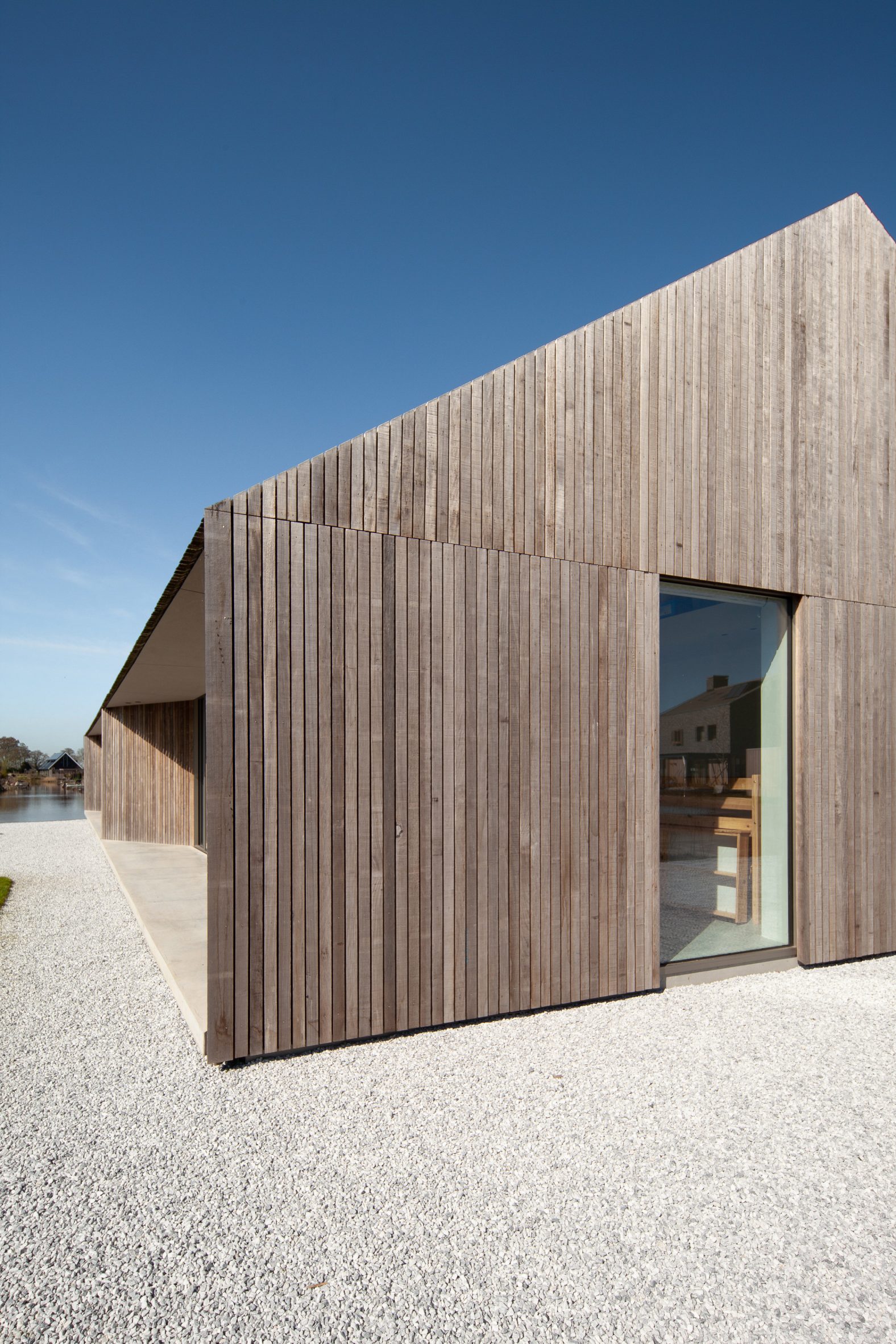 Vertical timber cladding wraps around the building and extends across walls that slope inwards on either side of the glazed elevation, framing views of the nearby water.