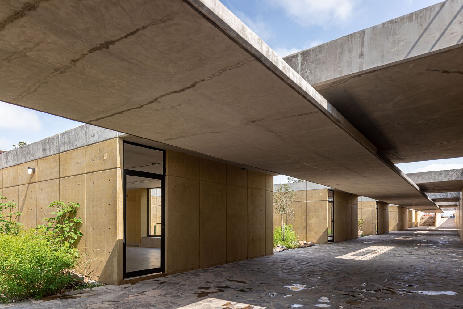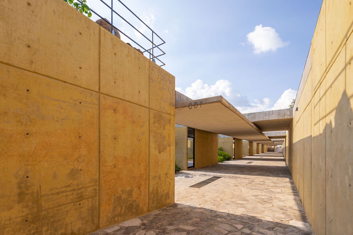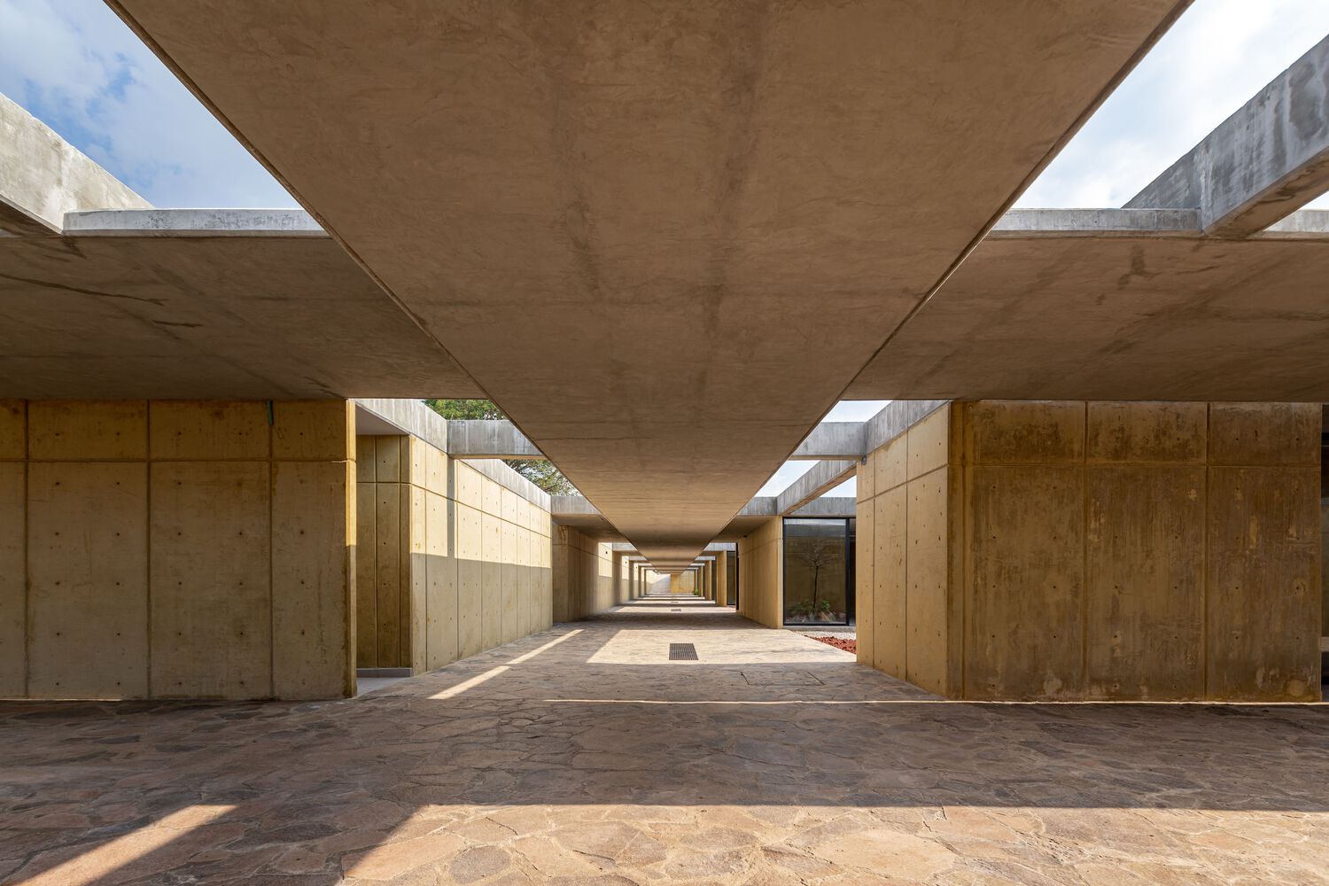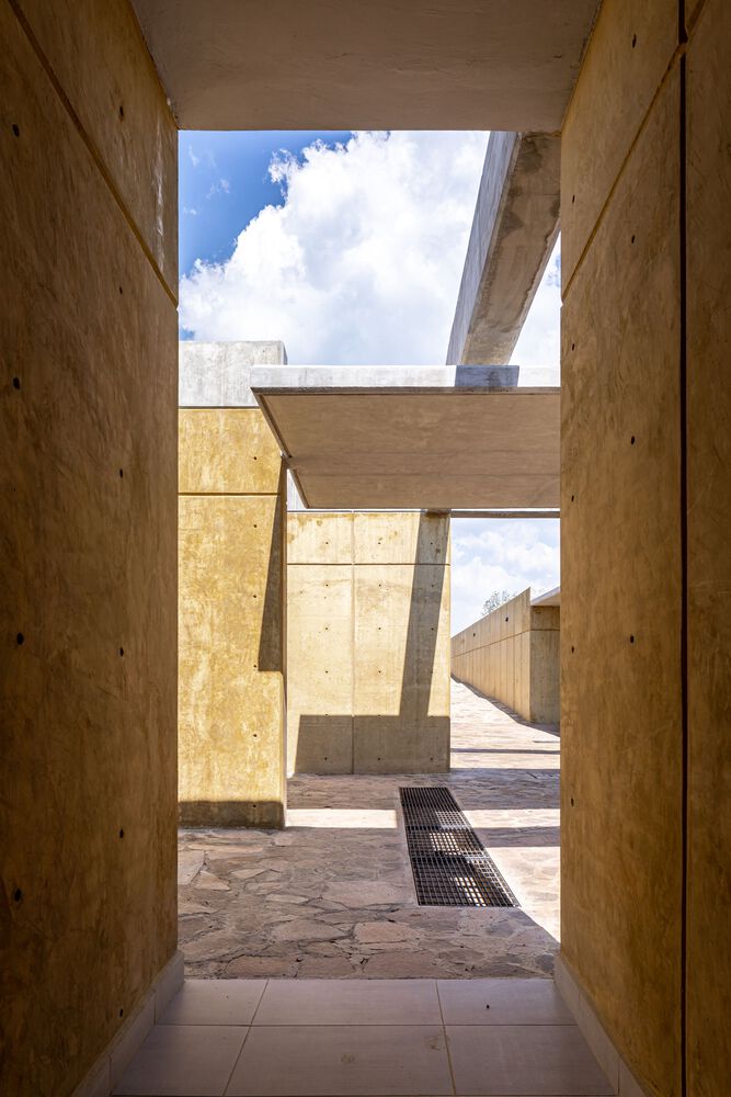 The idea was that the building would not contradict the aim of being noninvasive, an approach of great importance for the company since, being an industrial building, the opposite usually happens. The built element emerges on the ground, leading to the generating of a crack where the built spaces of the program are developed. We wanted visitors to perceive a trace of pre-Hispanic heritage in their journey between stairways and terraces that descend little by little. The visitor will arrive at the site and as they travel along they will encounter the place while gradually becoming contained within it. We sought to make courtyards by drilling into the ground, this led to the workshops feeling as if they were part of the land from the beginning. Large plates and patios were generated and embroidered with uninterrupted slabs, accompanying the path of voids through the play of horizontal surfaces. The pre Hispanic sensation became more present through the routes, tectonics, sound and emptiness.