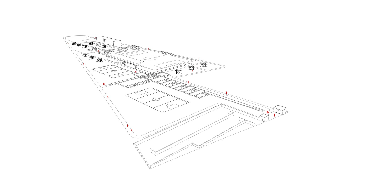 Part of the challenge was finding the ideal location for a program of this magnitude since it was essential to have a large area for the fields. We proposed to locate it at the end of the plant since in order for it to have a direct connection to the road, as well as an internal connection with the plant. The favourable conditions of the lot were also taken into account in the program., it was easy to place the courts, thanks to the steep nature of the terrain that was a former crop field.