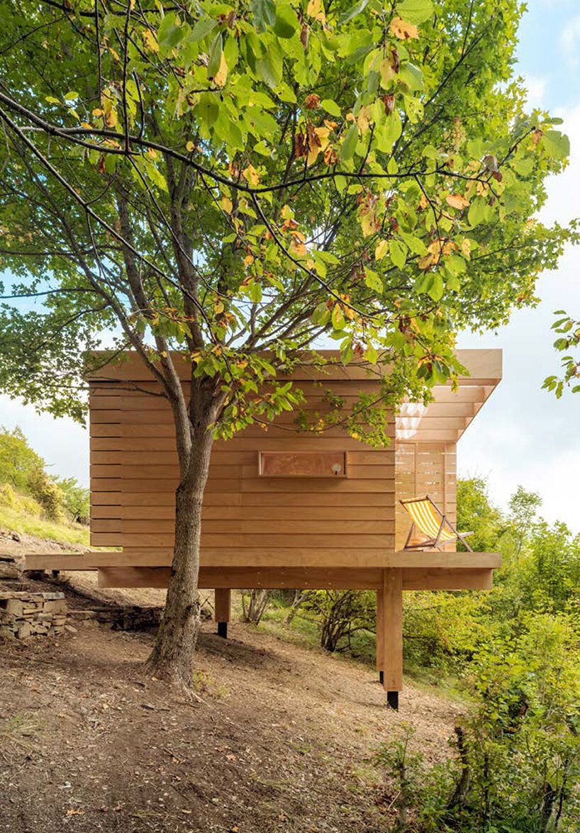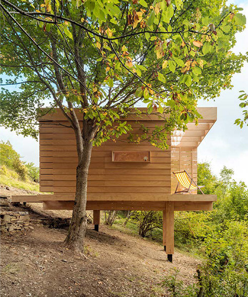 Italian architecture firm llabb has completed Hermitage, a 12 sqm wooden cabin designed as a space for contemplation and introspection. Located in Italy’s Trebbia Valley in the heart of the Apennines, the structure is dry-sited and off-grid, built by the team during a 15 day construction workshop. Elaborating on modernist themes and drawing inspiration from Japanese teahouses and Scandinavian huts, the cabin is raised off the ground and incoporates a fully glazed wall offering expansive views of the surrounding forest. The resulting structure can be used as a studio, retreat, tea room, or guest house.