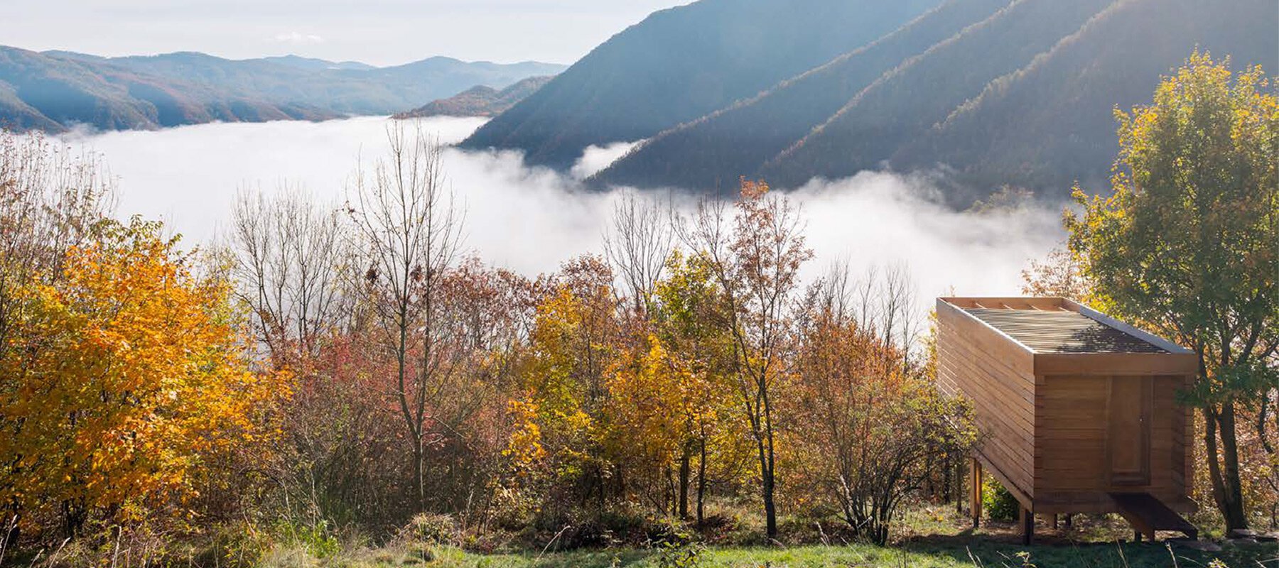 자연을 즐기는 또한가지 방법. 이탈리아 트레비아 계곡에 위치한 자그만한 오두막은 12제곱미터의 크기로 소담스런 평면을 보여준다. 아무것도 없이 침대와 테이블만 덩그러니 놓여 있다. 외부 조망을 관망하는 쪽에는 작은 데크와 의자가 자리한다. 이유는 분명하다. 절제된 공간을 통해 아무것도 하지 않으며, 자연과 친숙해 지기 위해서이다. 오로지 사색과 명상에 집중한다.