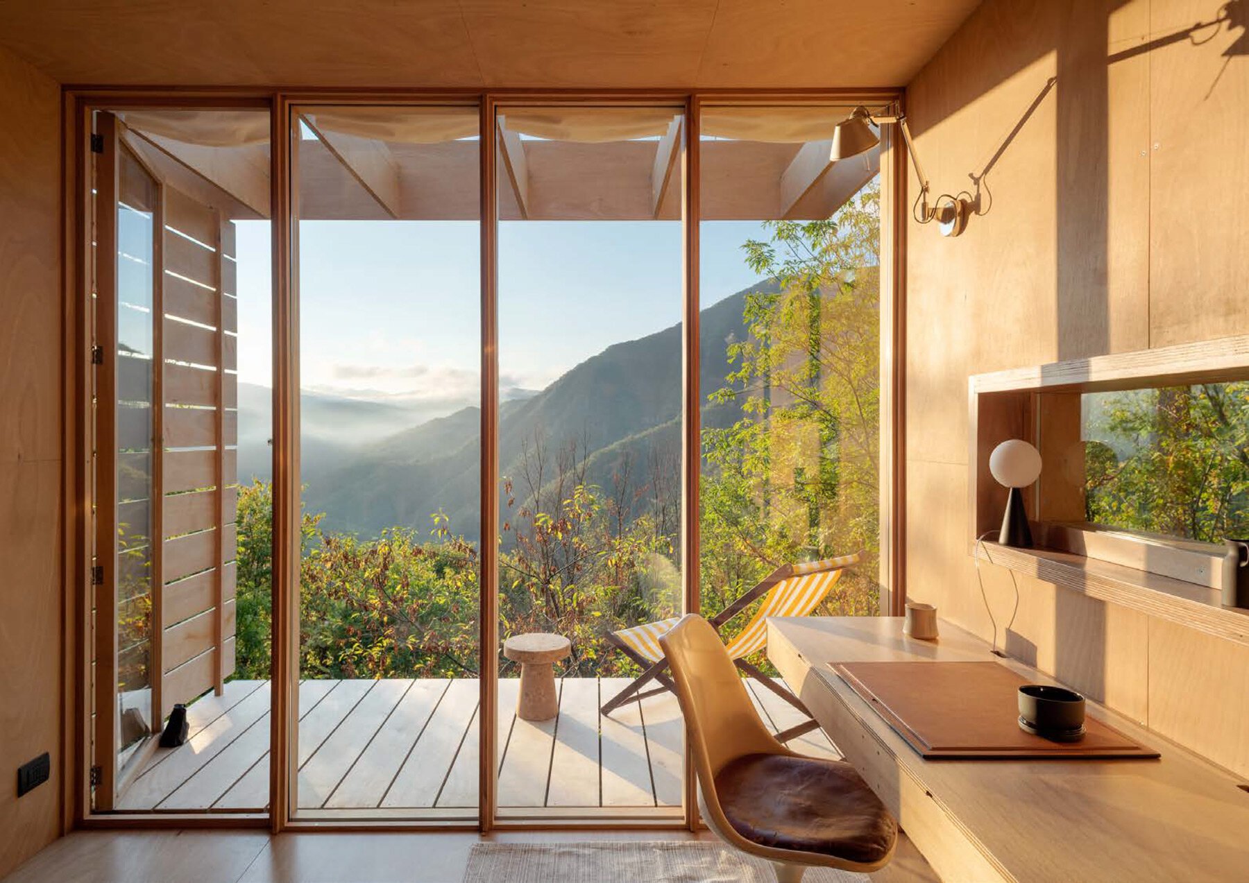 The structure has the shape of a rectangular cantilevered volume perpendicular to the steep slope. It is located facing northwest, with an entrance door characterized by a pronounced boarding, accessible by a footpath. The walls that delimit the hut, enclosing it on three sides, are covered with horizontally arranged plywood panels. In the southeast, the hut has a fully glazed wall that opens to the valley. Here, the interior space merges into a terrace separated by four floor-to-ceiling glass panels, one of which can be opened. The glazing follows the modularity of the brise sole, which overhangs the terrace and in turn continues the roof structure.