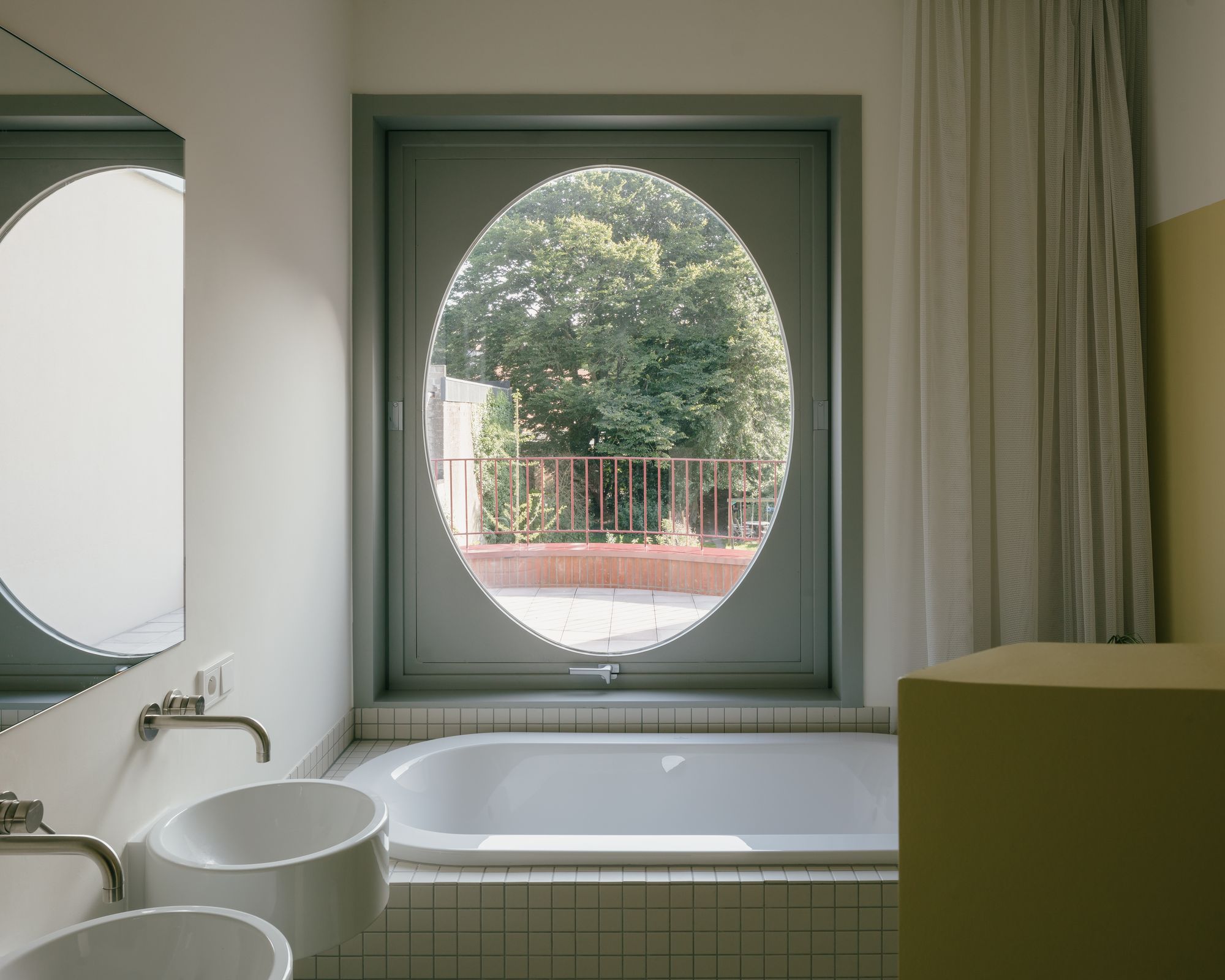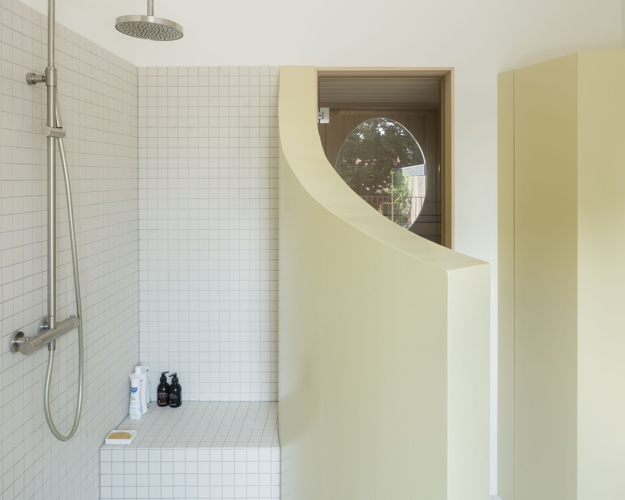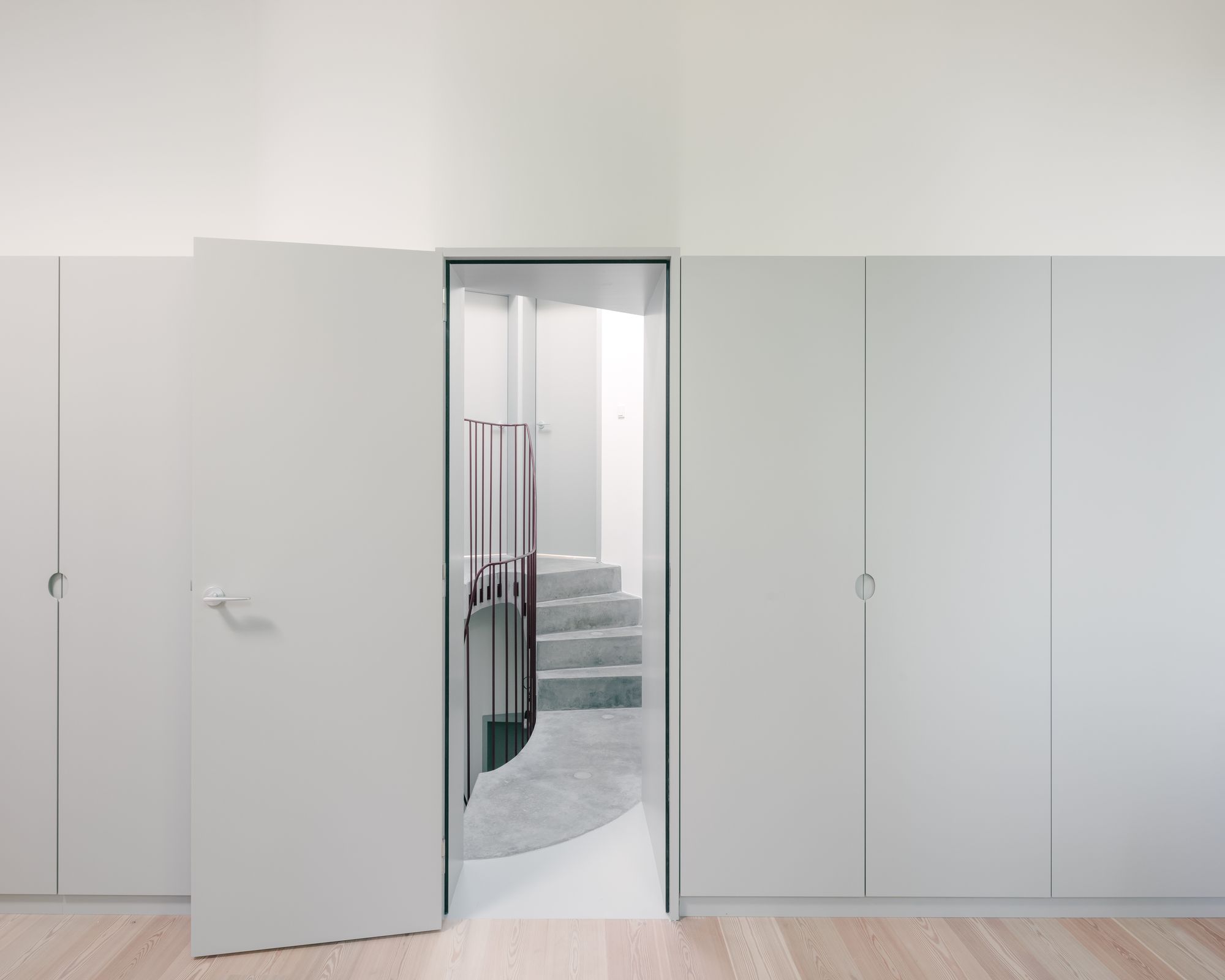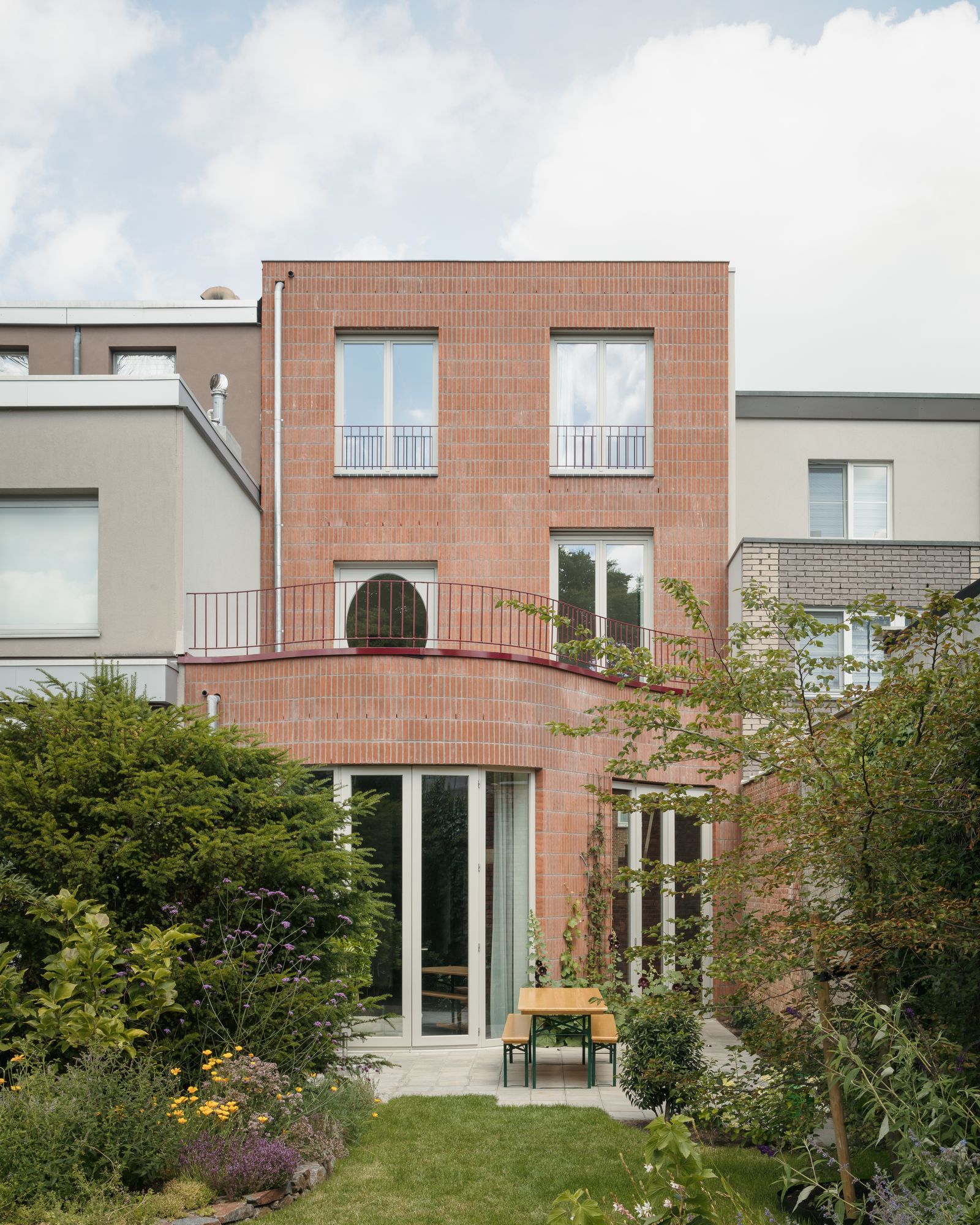 Saint Benedict is a minimal house located in Mortsel, Belgium, designed by Poot Architecture. A lot in the row is built on for the first time. In a street with mostly monotonous houses from the 50s and 60s, the rare bay windows are the only inspiring elements. The design is an interpretation of the typical aspects: the neutral red brick is used in a vertical tile bond, the bay window is executed as a round shape. The plan is organized around the central oval staircase: the living space is spread over two levels for different moments in the day: working at home, reading, playing,… A double-height kitchen on the street side gives the house a large dimension and ensures the connection between the different living areas. In the sleeping quarters and an extra study, on the other hand, the emphasis is on seclusion and silence.