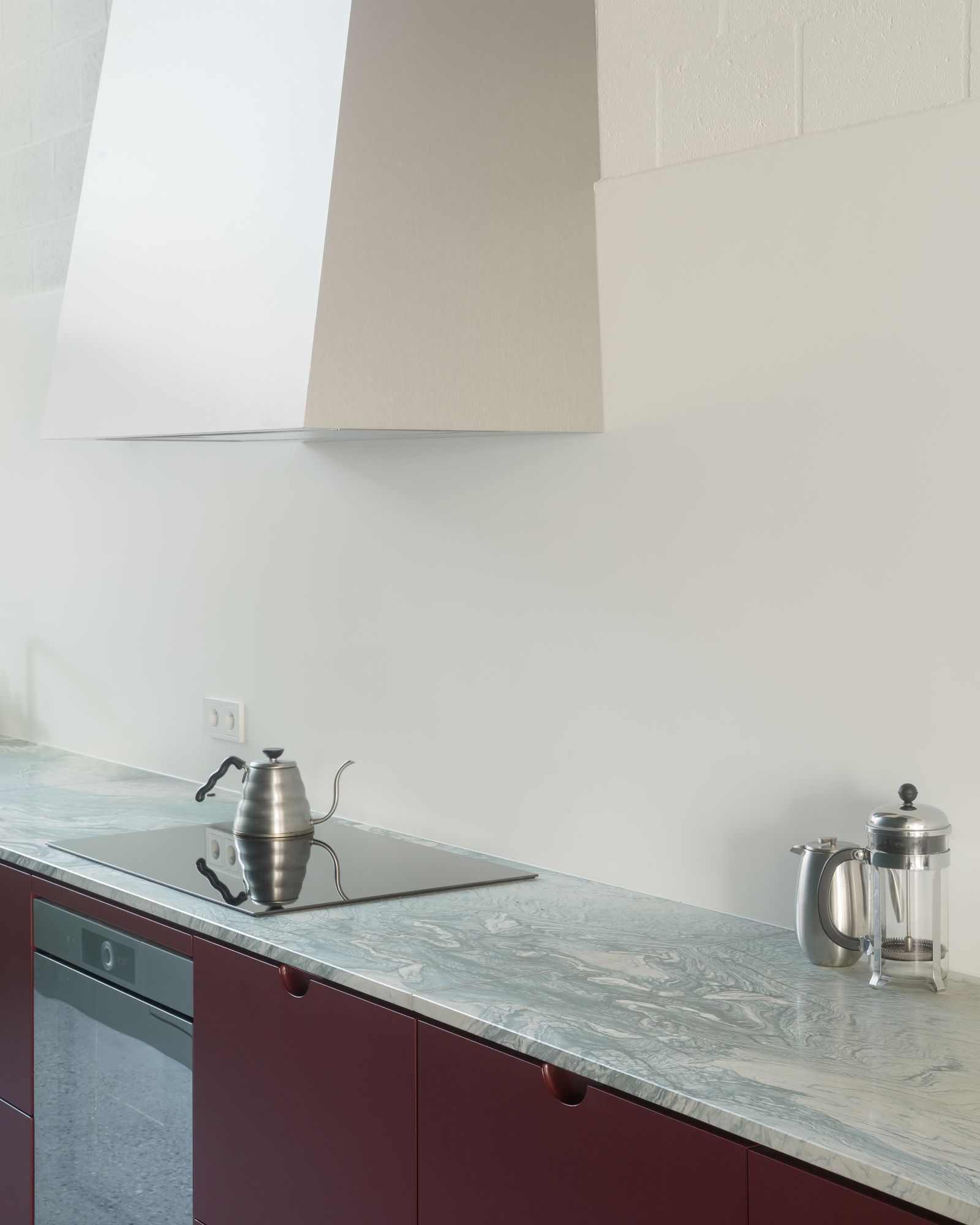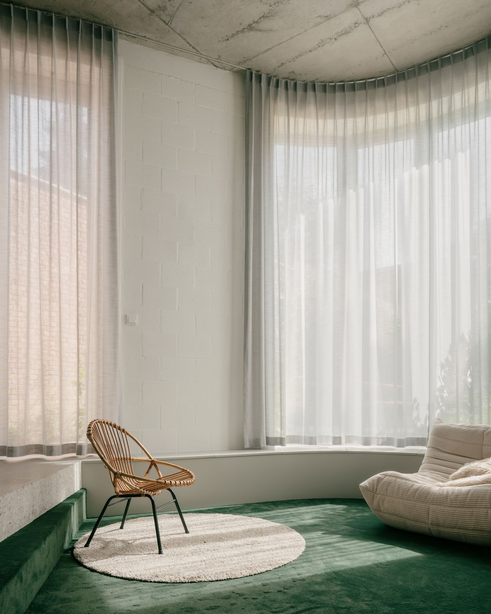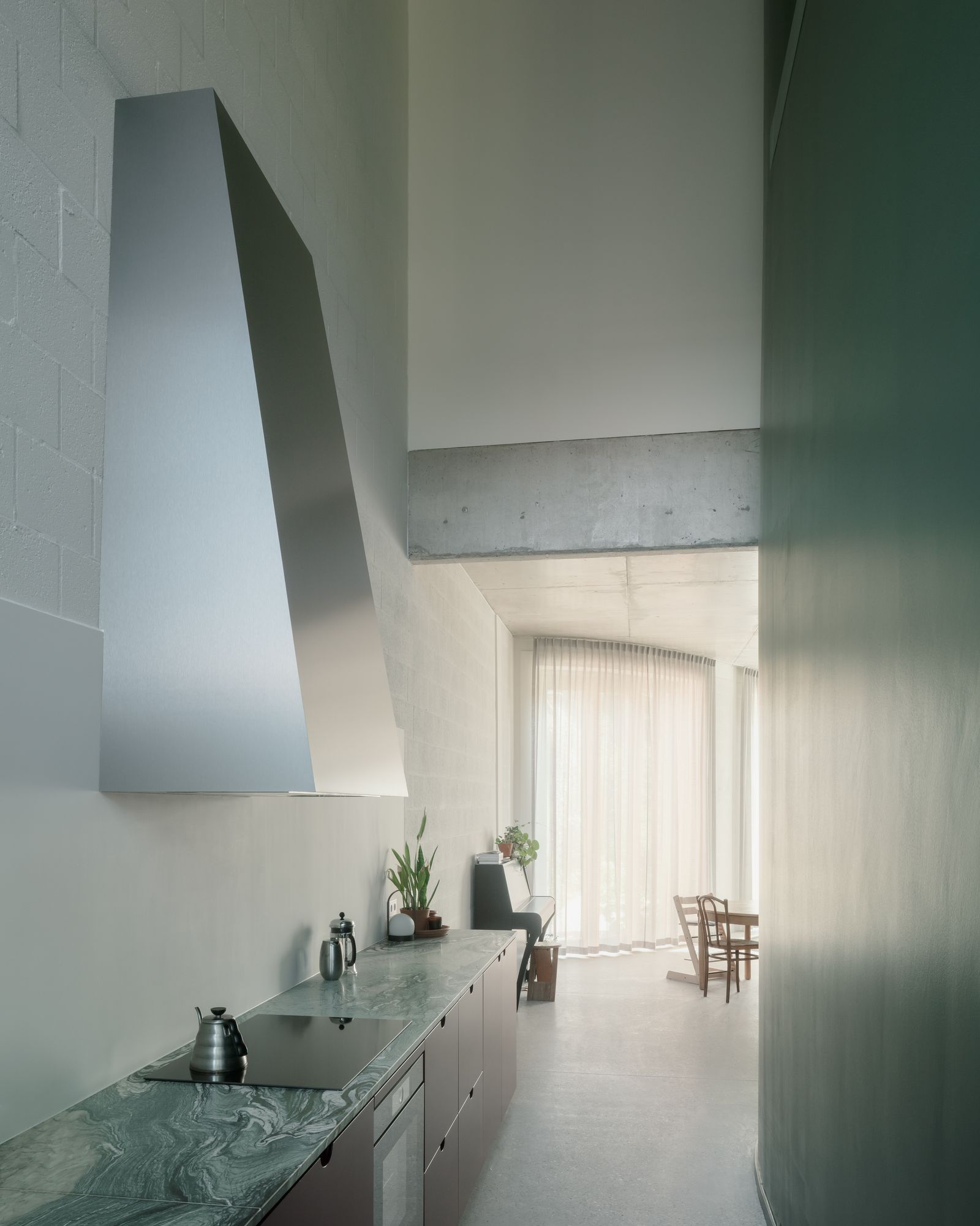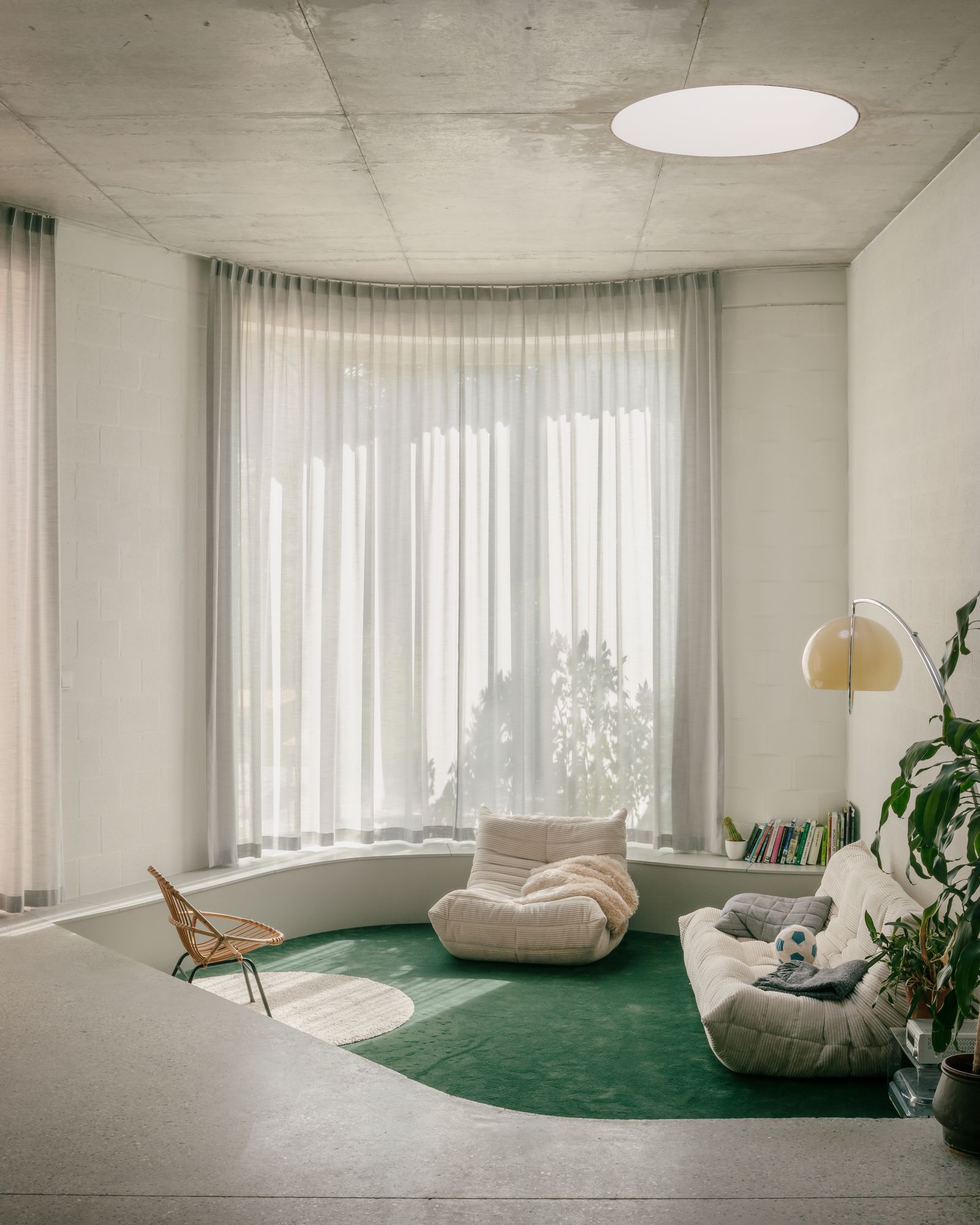 Saint Benedict is a minimal house located in Mortsel, Belgium, designed by Poot Architecture. A lot in the row is built on for the first time. In a street with mostly monotonous houses from the 50s and 60s, the rare bay windows are the only inspiring elements. The design is an interpretation of the typical aspects: the neutral red brick is used in a vertical tile bond, the bay window is executed as a round shape. The plan is organized around the central oval staircase: the living space is spread over two levels for different moments in the day: working at home, reading, playing,… A double-height kitchen on the street side gives the house a large dimension and ensures the connection between the different living areas. In the sleeping quarters and an extra study, on the other hand, the emphasis is on seclusion and silence.