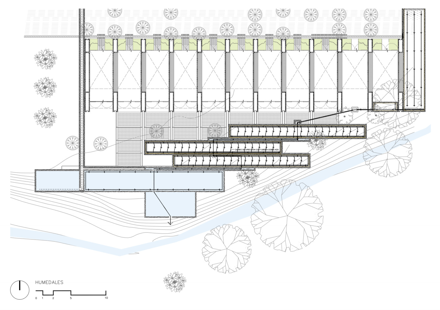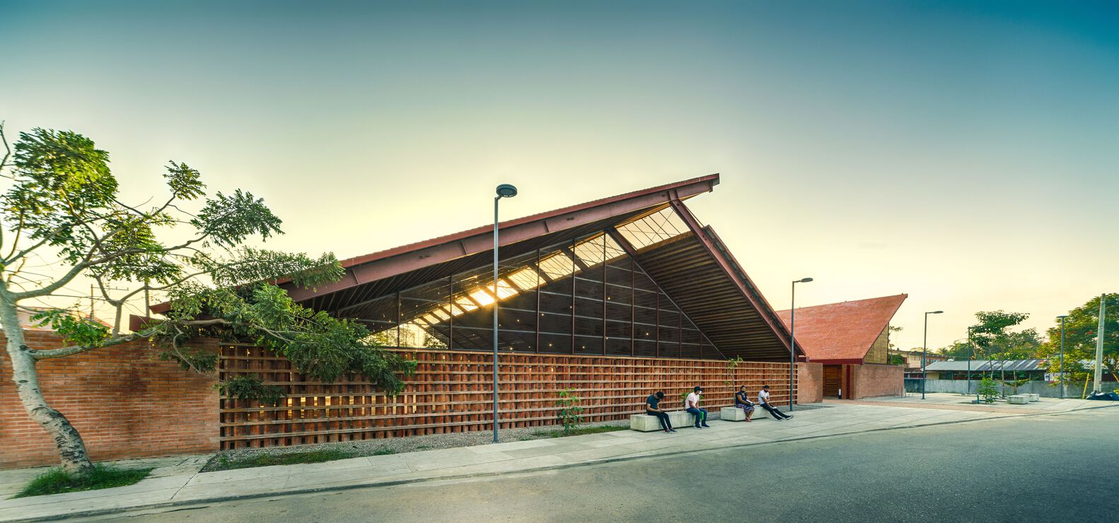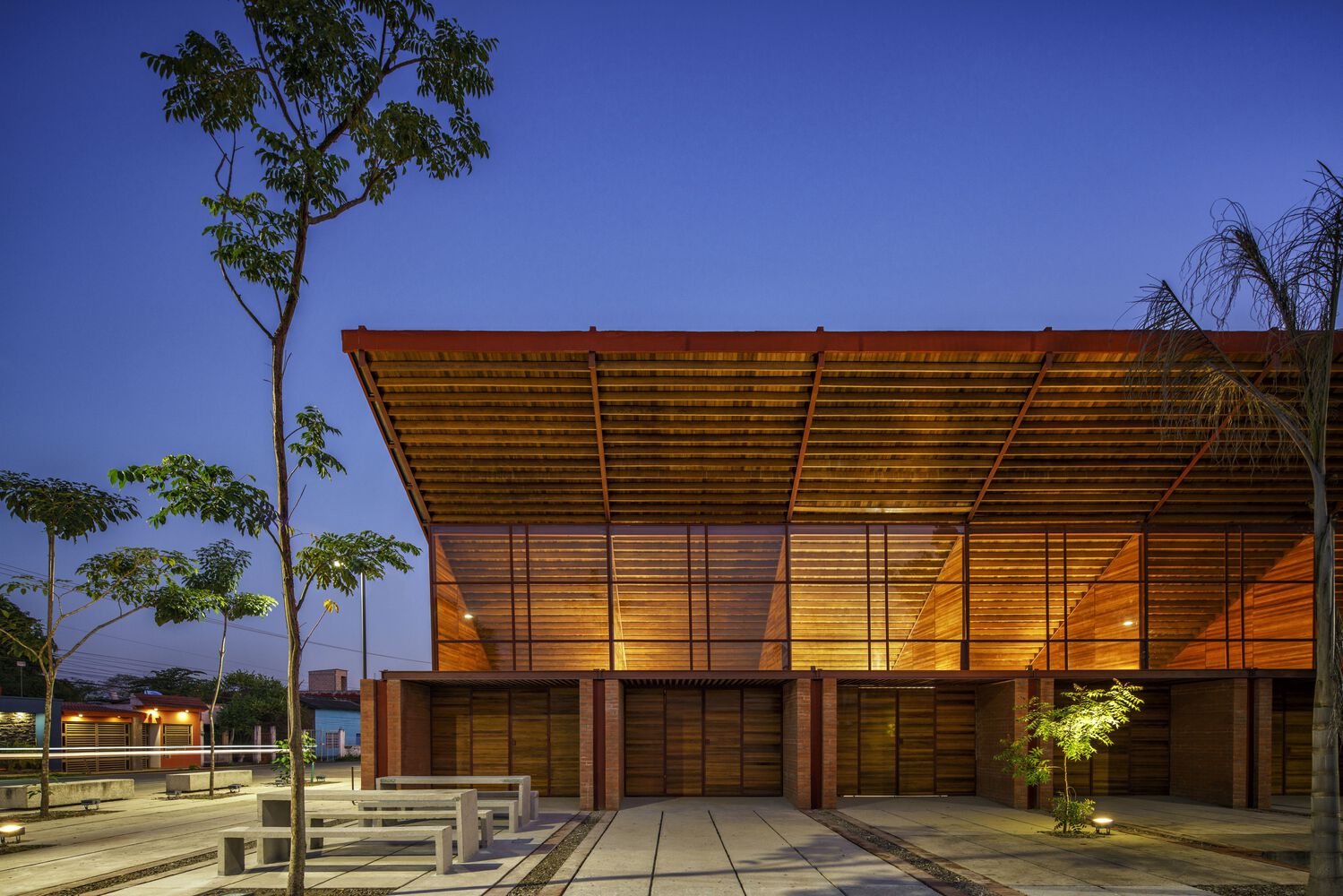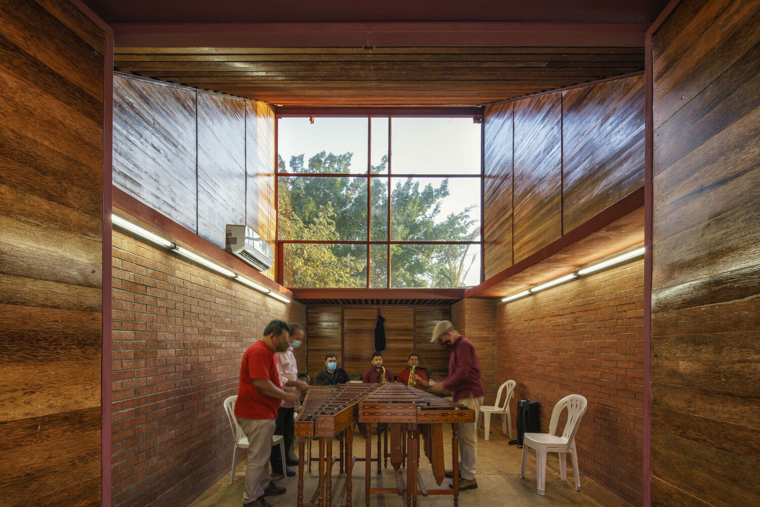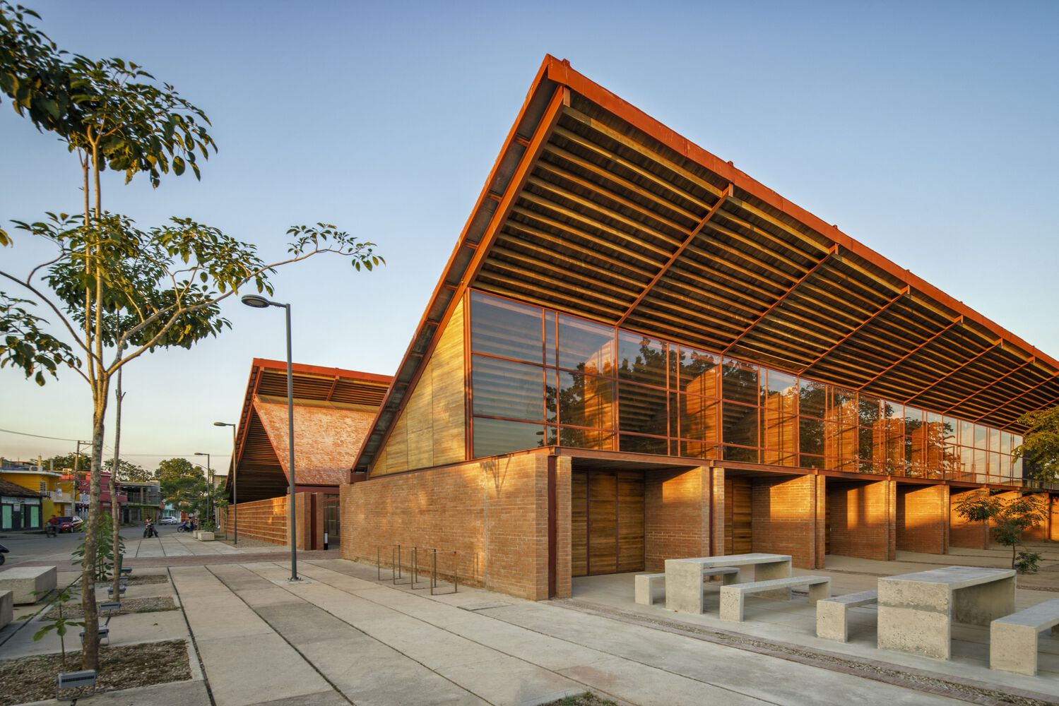 Mirroring the Community Center, conformed by a public boulevard between both buildings, the new music school faces a polluted creek. The walls are aligned to the rhythm of the pre existing structure of the Community Center in such a way that when all its doors are opened it is possible to look through the entire complex in a cross direction. The Music School is made up of eight classrooms, a cafeteria, restrooms, and management offices, thanks to the slope of its roof, each of these spaces has double height and an upper terrace from where you can observe the treetops. The complex is the first building in Nacajuca that discharges clean water into the rivers, through a system that culminates in a series of treatment wetlands. Our intention is to demonstrate how another approach to the river is possible.