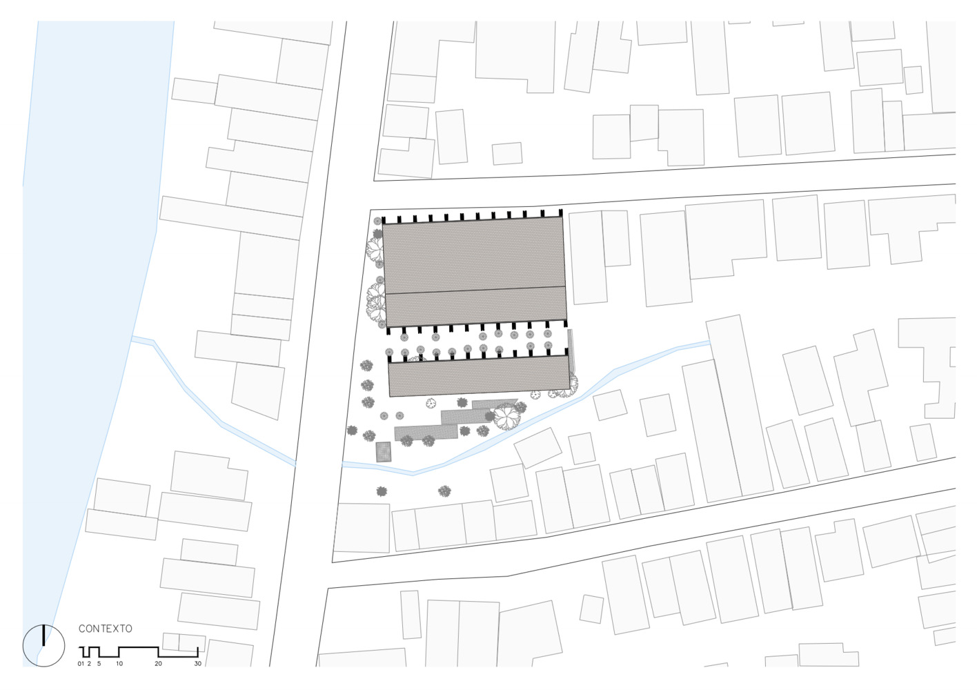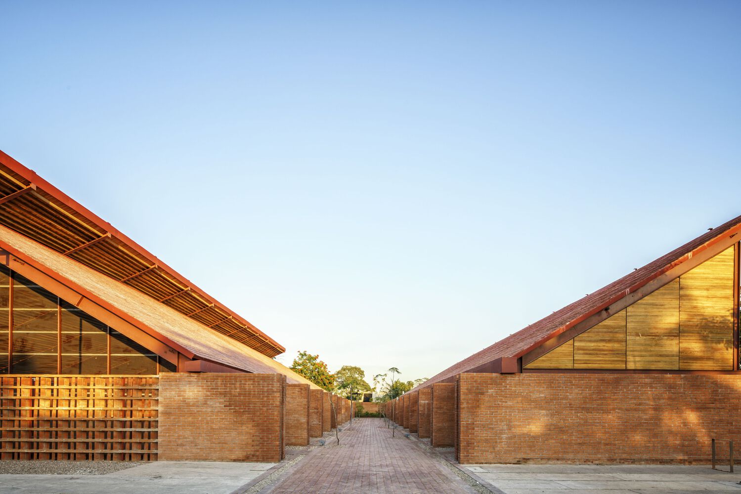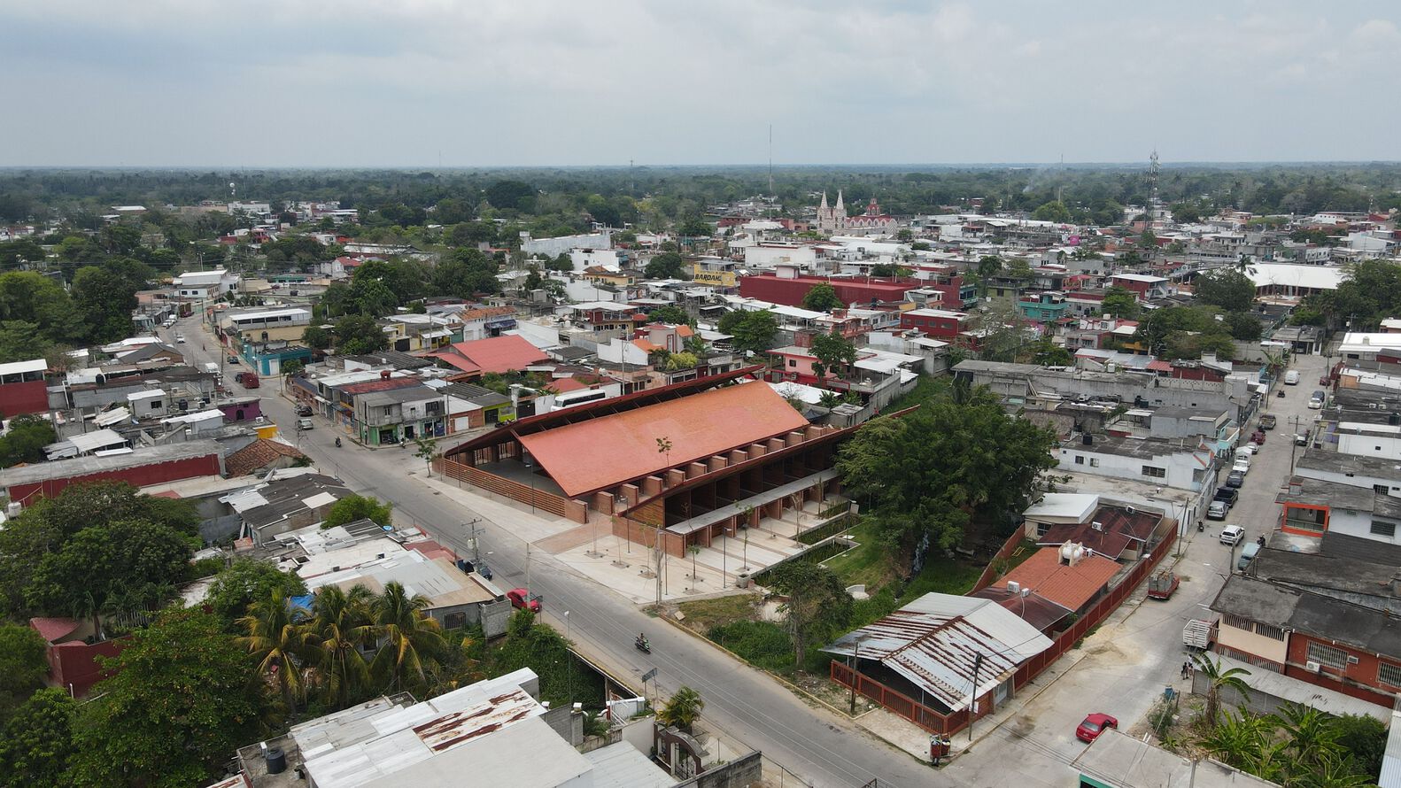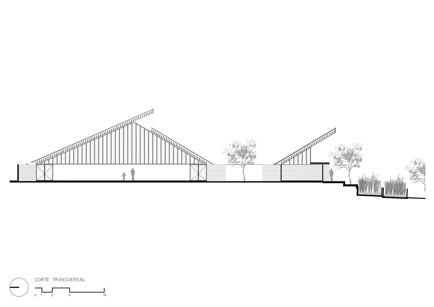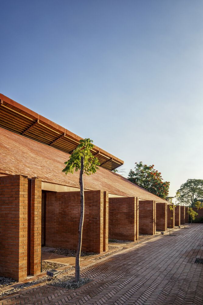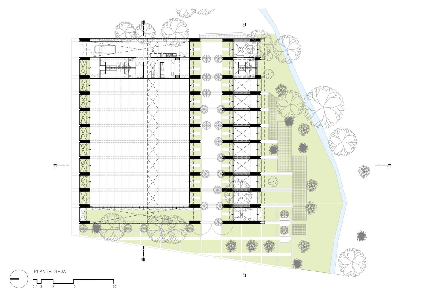 Mirroring the Community Center, conformed by a public boulevard between both buildings, the new music school faces a polluted creek. The walls are aligned to the rhythm of the pre existing structure of the Community Center in such a way that when all its doors are opened it is possible to look through the entire complex in a cross direction. The Music School is made up of eight classrooms, a cafeteria, restrooms, and management offices, thanks to the slope of its roof, each of these spaces has double height and an upper terrace from where you can observe the treetops. The complex is the first building in Nacajuca that discharges clean water into the rivers, through a system that culminates in a series of treatment wetlands. Our intention is to demonstrate how another approach to the river is possible.