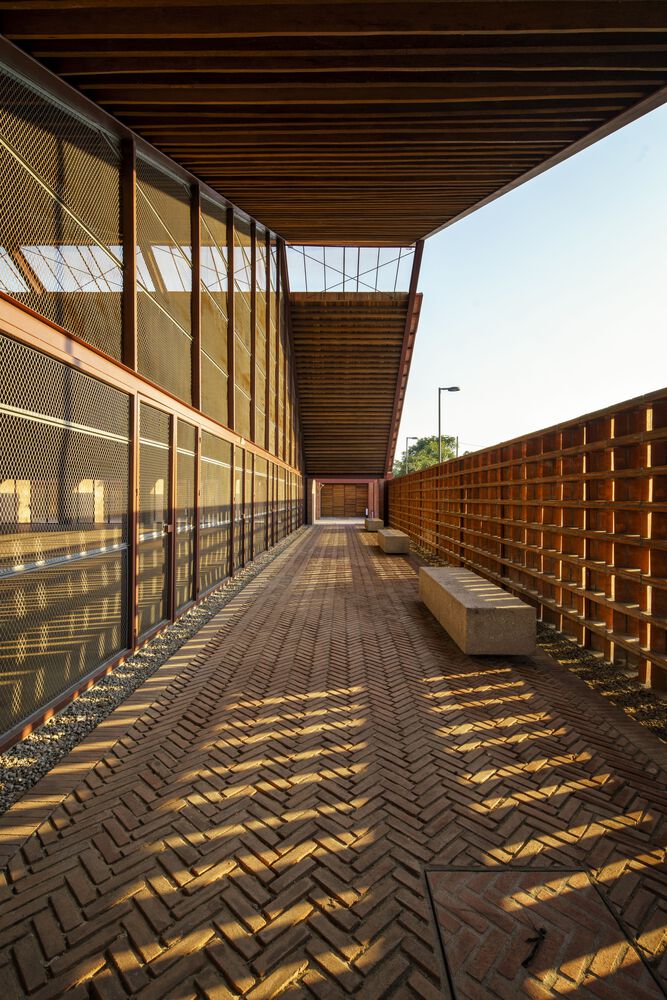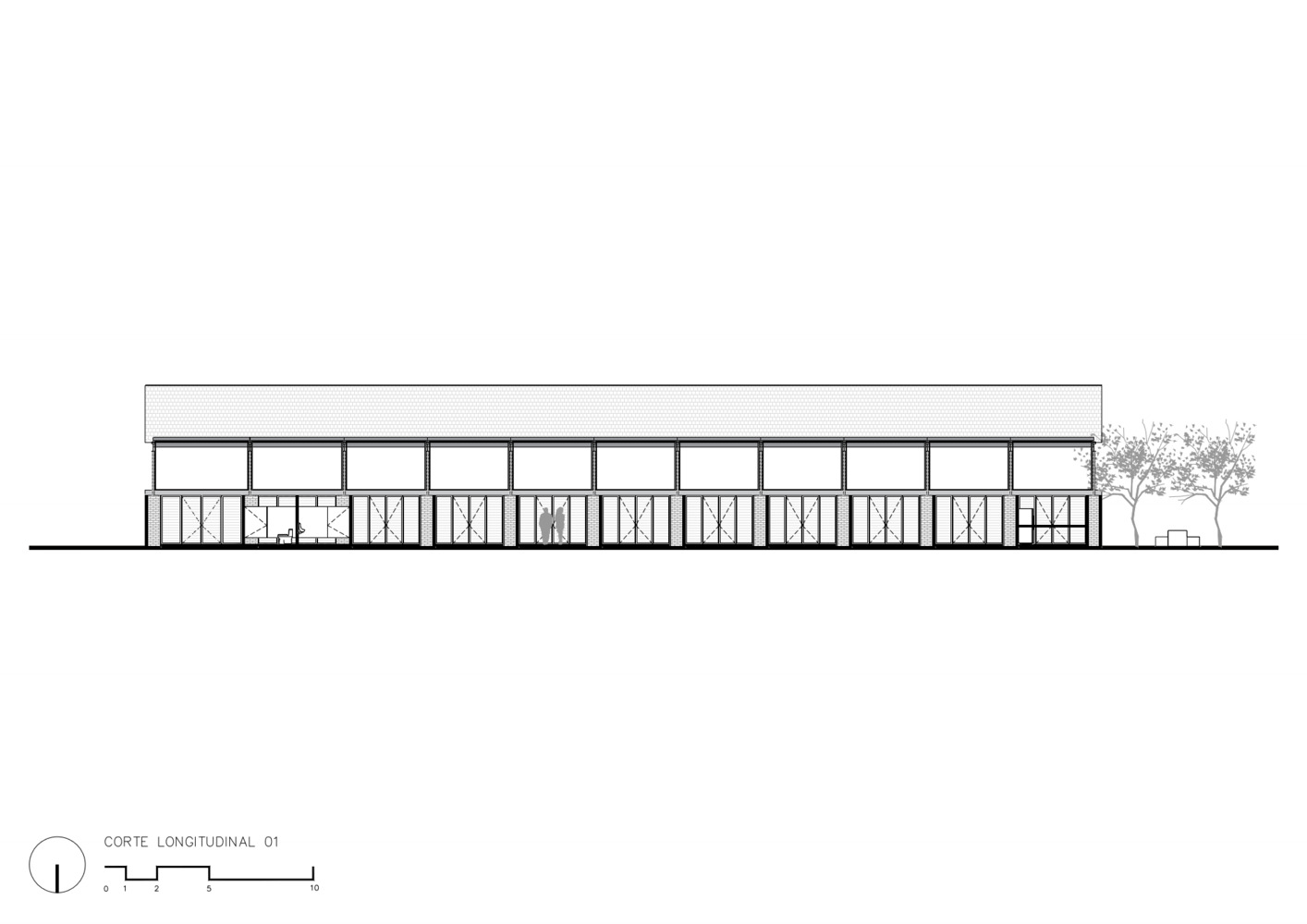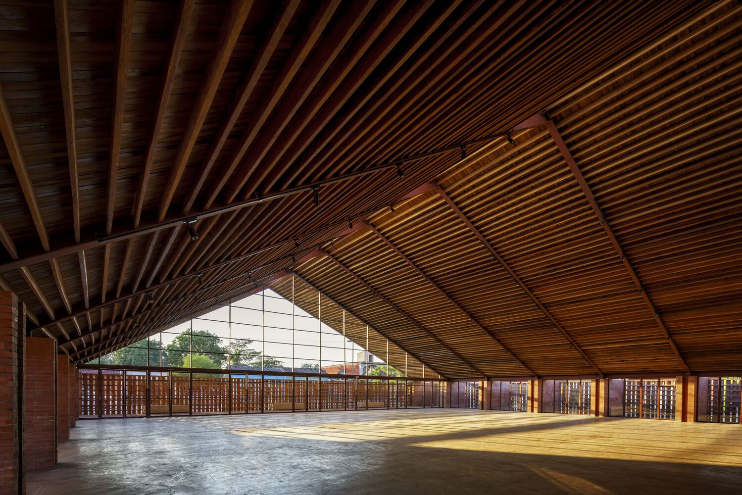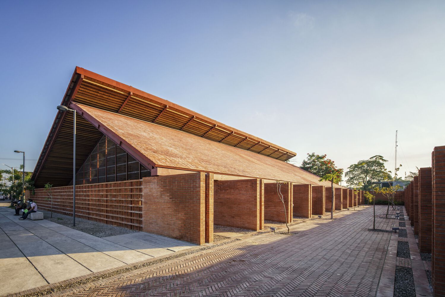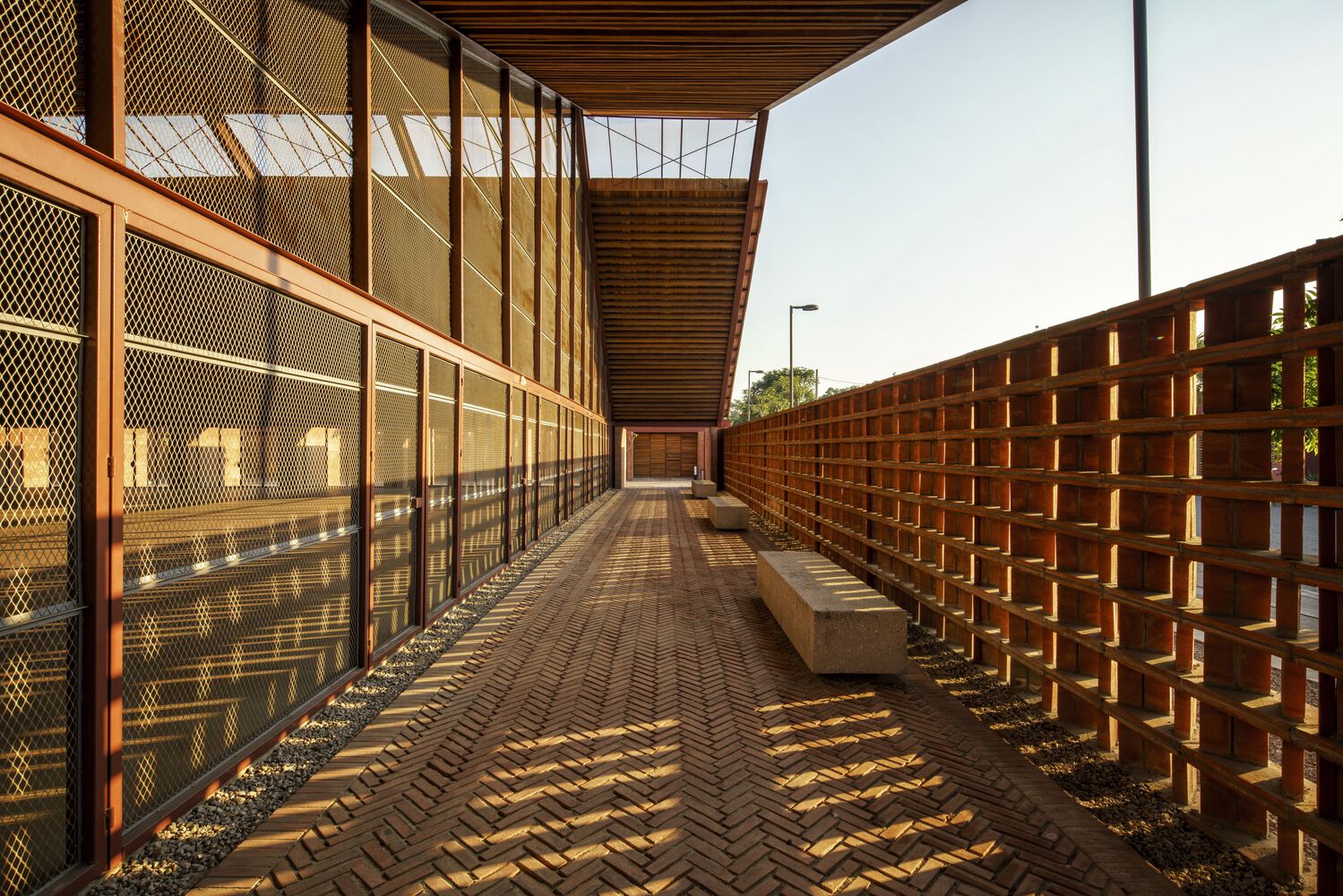 Mirroring the Community Center, conformed by a public boulevard between both buildings, the new music school faces a polluted creek. The walls are aligned to the rhythm of the pre existing structure of the Community Center in such a way that when all its doors are opened it is possible to look through the entire complex in a cross direction. The Music School is made up of eight classrooms, a cafeteria, restrooms, and management offices, thanks to the slope of its roof, each of these spaces has double height and an upper terrace from where you can observe the treetops. The complex is the first building in Nacajuca that discharges clean water into the rivers, through a system that culminates in a series of treatment wetlands. Our intention is to demonstrate how another approach to the river is possible.