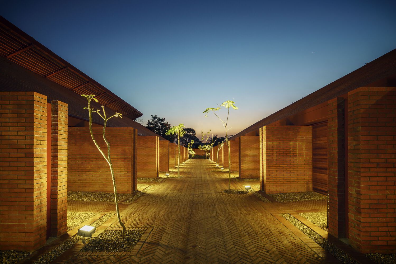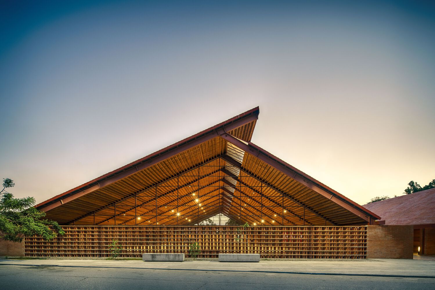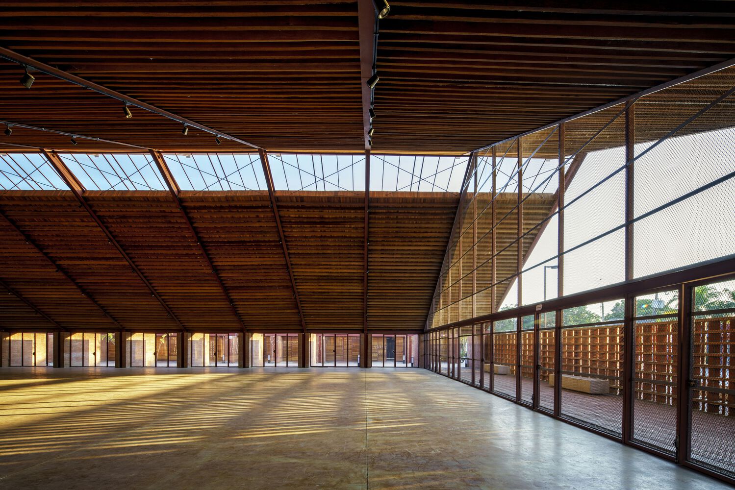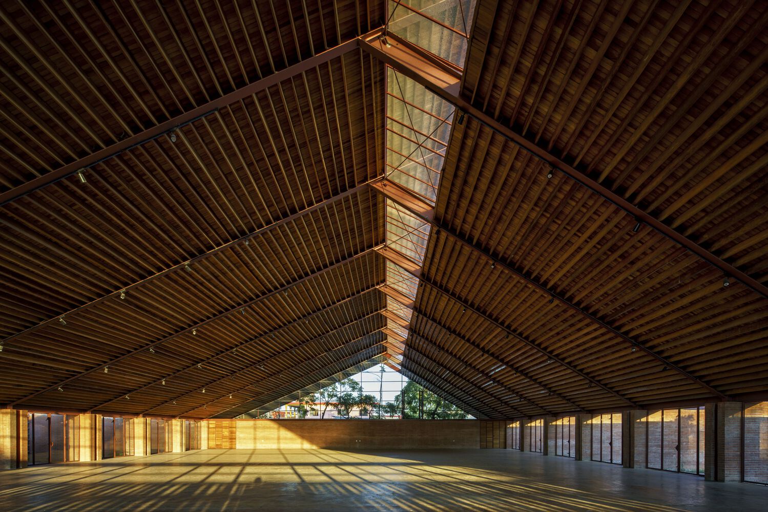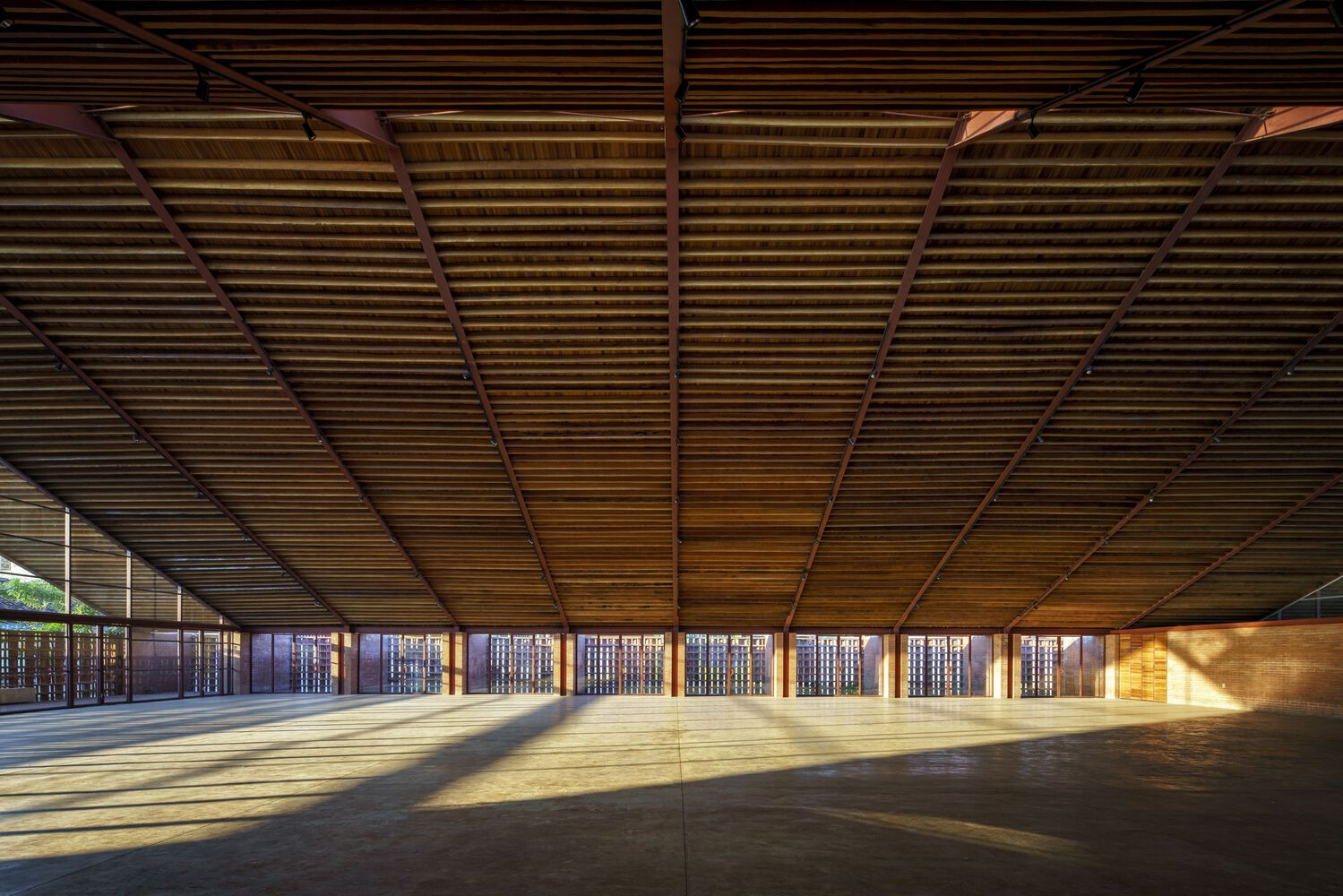Mirroring the Community Center, conformed by a public boulevard between both buildings, the new music school faces a polluted creek. The walls are aligned to the rhythm of the pre existing structure of the Community Center in such a way that when all its doors are opened it is possible to look through the entire complex in a cross direction. The Music School is made up of eight classrooms, a cafeteria, restrooms, and management offices, thanks to the slope of its roof, each of these spaces has double height and an upper terrace from where you can observe the treetops. The complex is the first building in Nacajuca that discharges clean water into the rivers, through a system that culminates in a series of treatment wetlands. Our intention is to demonstrate how another approach to the river is possible.