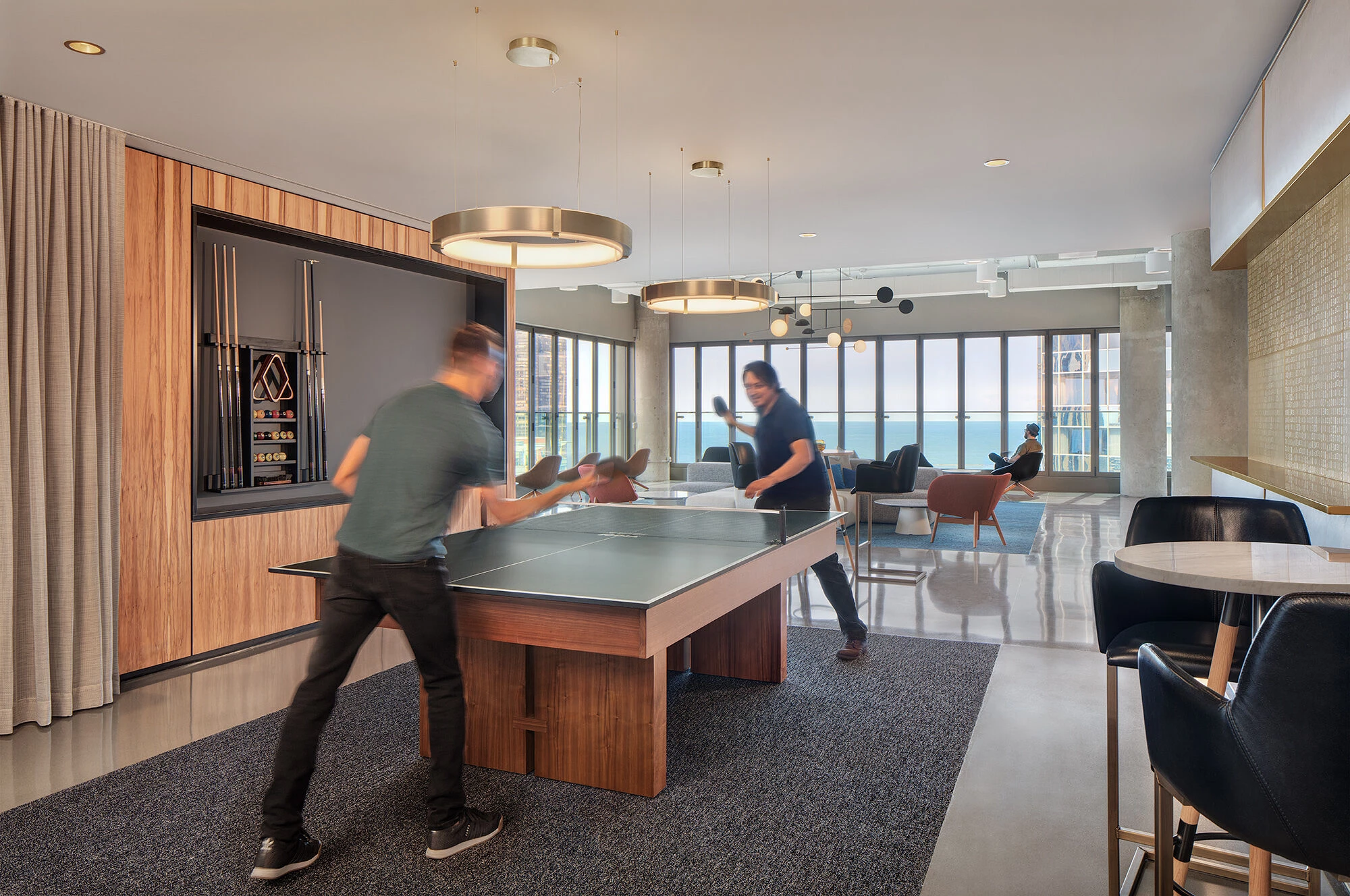 The design for the tenant lounge was conceived as a modern interpretation of a 1970’s vibe, borrowing cues from the era in which the building was designed and merging them with more sophisticated and clean lines. Designed with a distinct hospitality feel, the lounge features a volumetric brass fireplace, mirrored screening elements, mobile like lighting fixtures, and bright graphic flooring to form spaces that are both vibrant and inviting. A large bar anchors the space and is surrounded by a variety of lounge seating, making it perfect as a day-time retreat or for after-hours events. A small, cozy alcove with banquet seating provides a quieter space on the floor. Finally, a game room offers an interchangeable ping pong and billiards table along with shuffleboard.