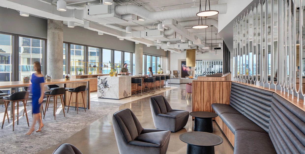 SCB was engaged as the interior designer for the repositioning of 303 East Wacker, an office tower located on the Chicago River. The designers were challenged to transform a mechanical space on the 30th floor into a new tenant floor and amenity lounge. New floor-to ceiling windows were added to the space, opening it up to the expansive views of the Chicago skyline, Navy Pier and Lake Michigan. Along the northeast corner, the windows become operable, allowing the space to transform into an outdoor terrace in warmer months.