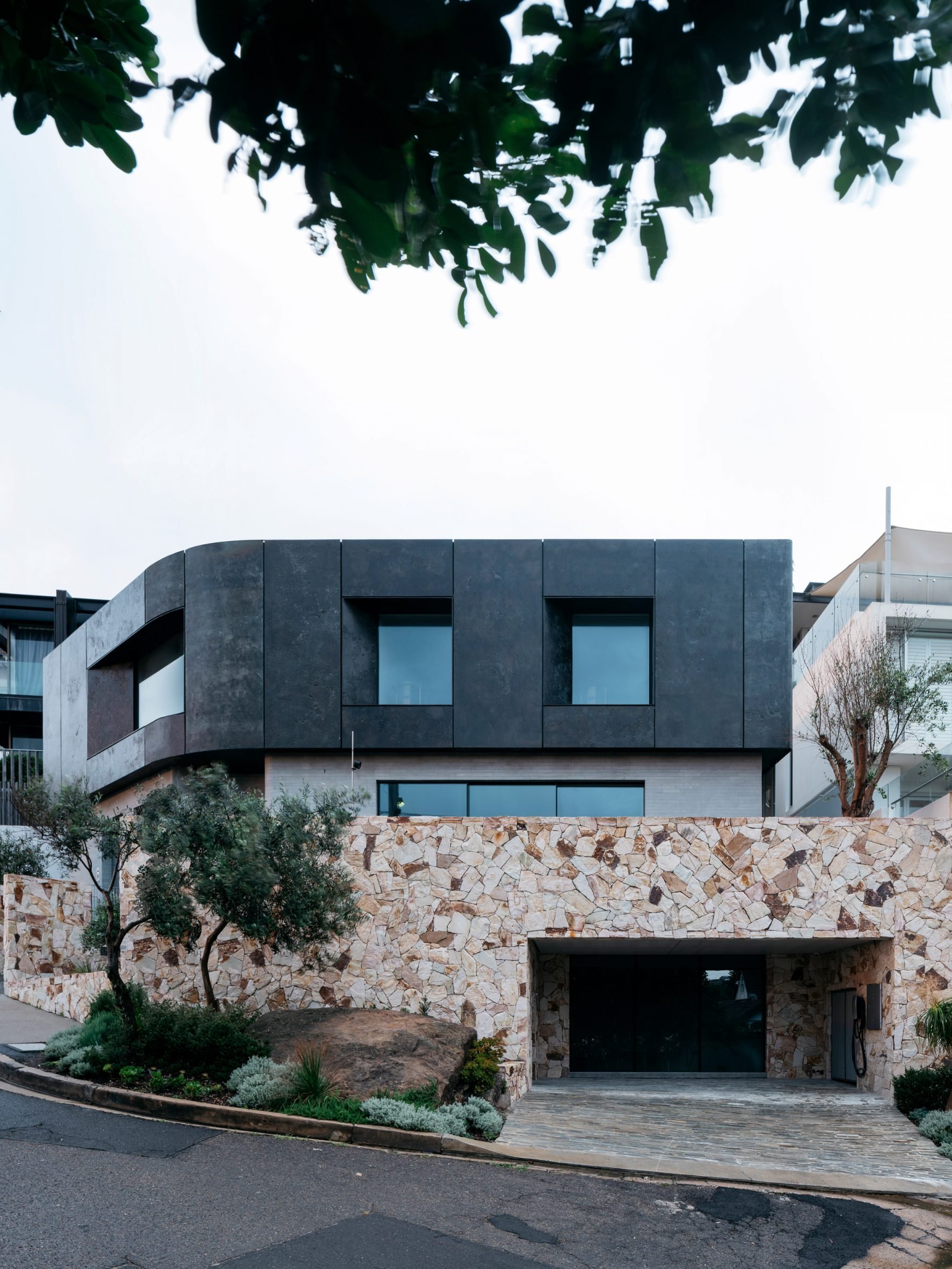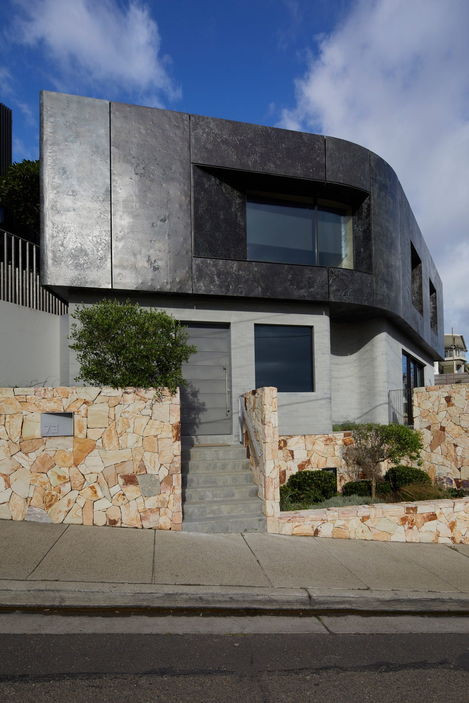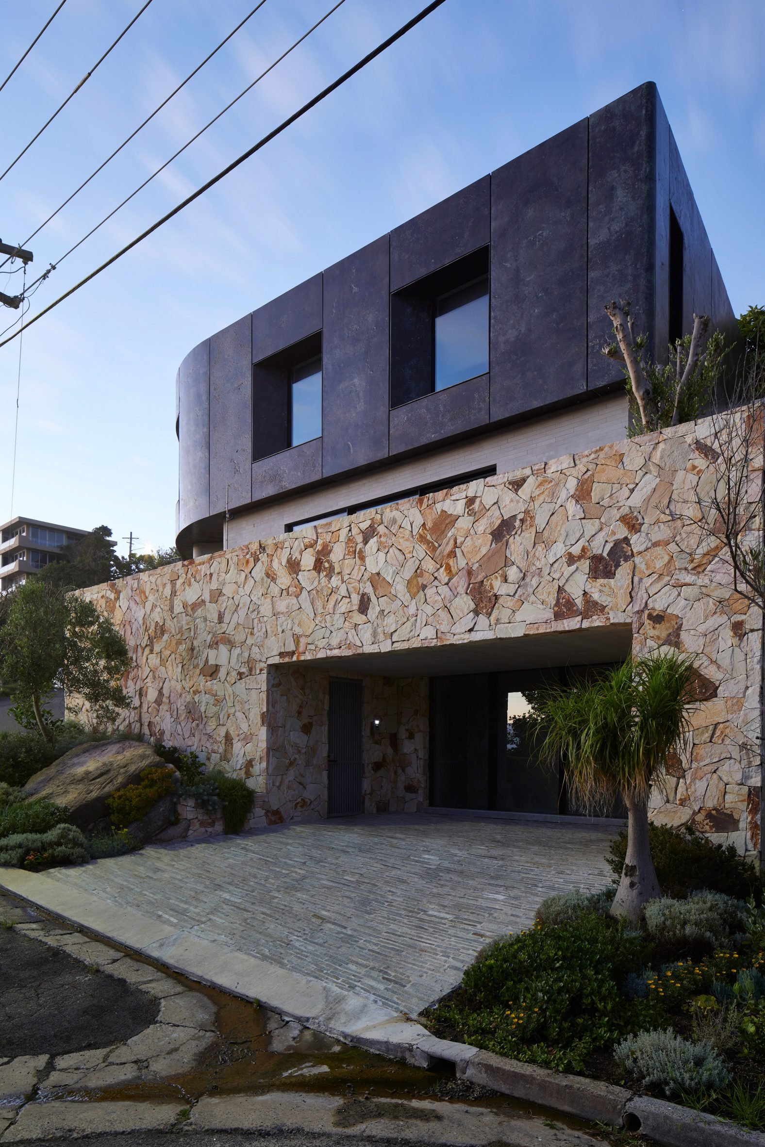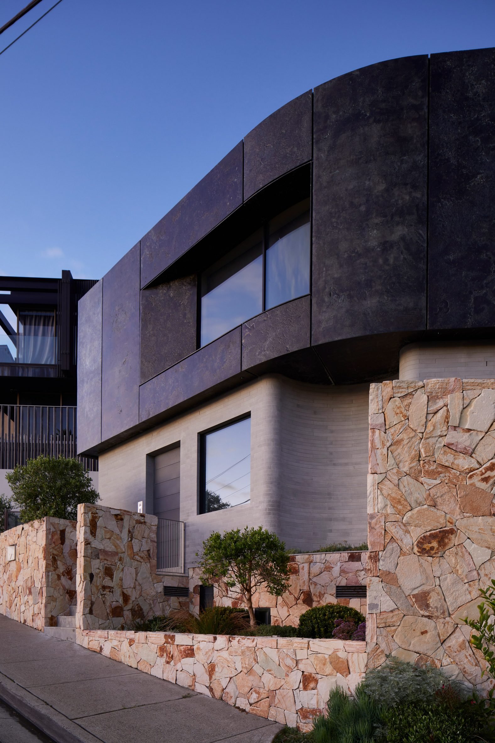 A curved bronze facade sits atop a sandstone podium at this home renovation in Sydney, Australia, designed by local architecture studio Atelier Andy Carson.