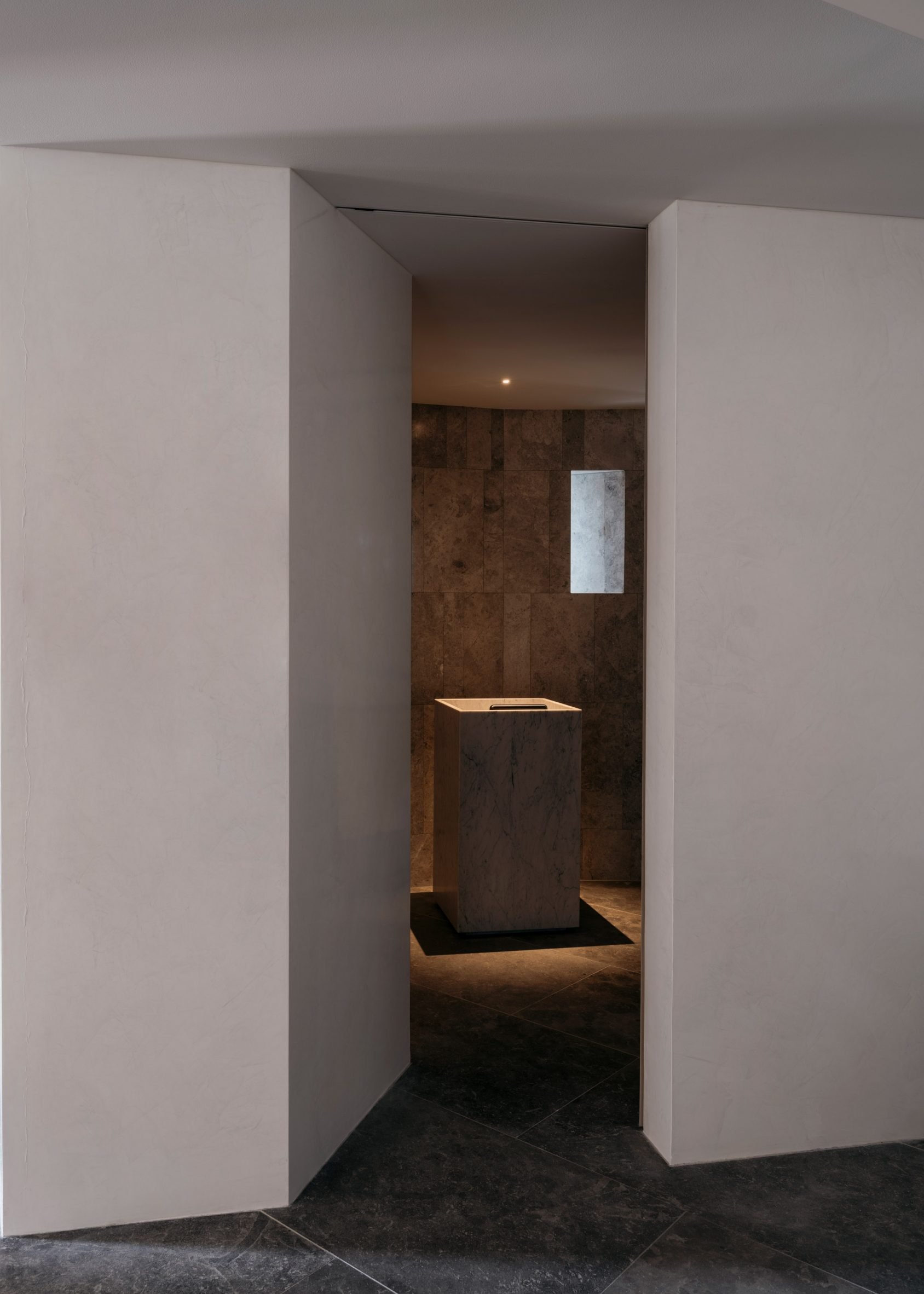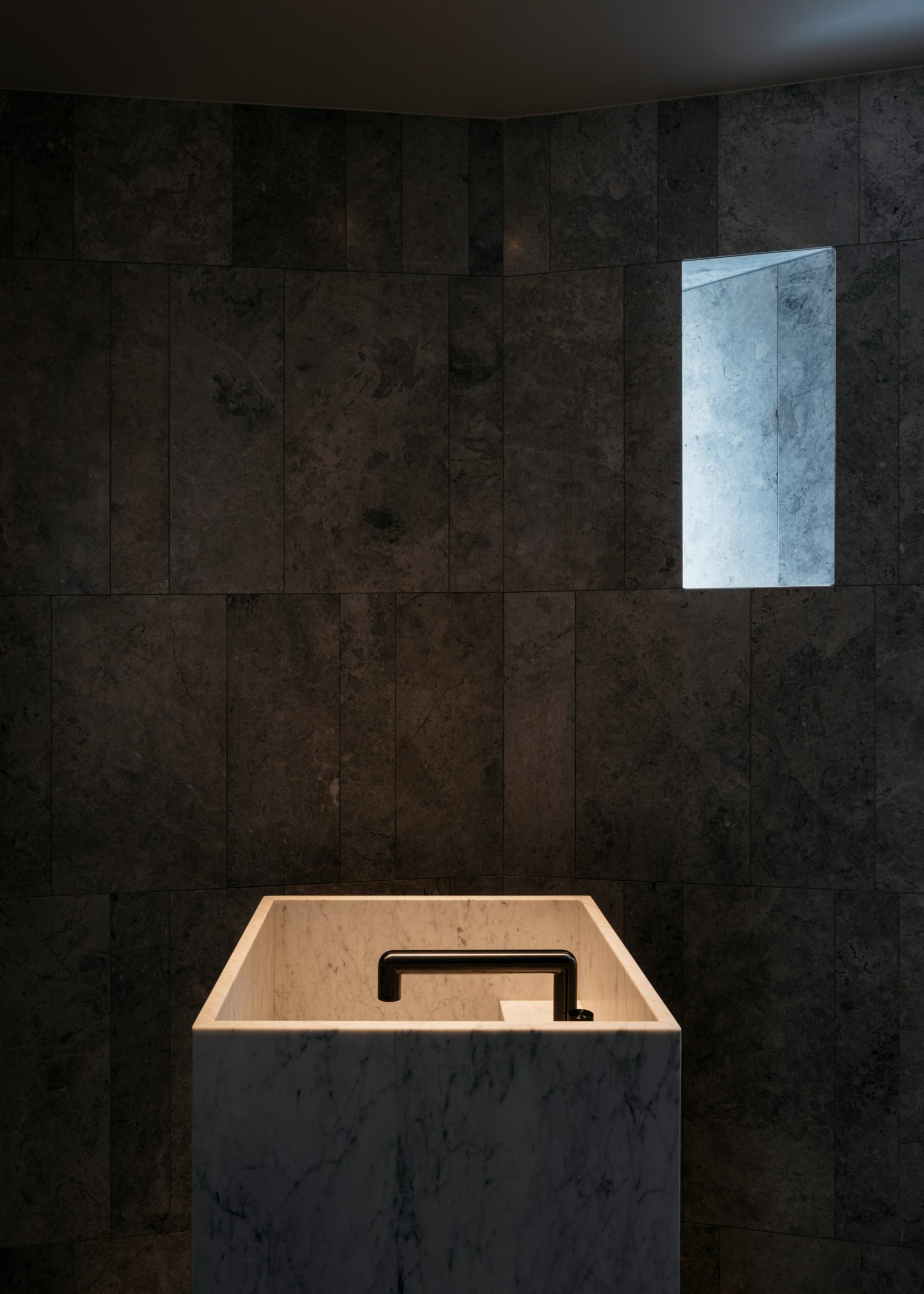 Above, the ground floor is wrapped by thin grey bricks and contains a single large living, dining and kitchen area which opens onto a courtyard raised atop the stone base through sliding glass doors.