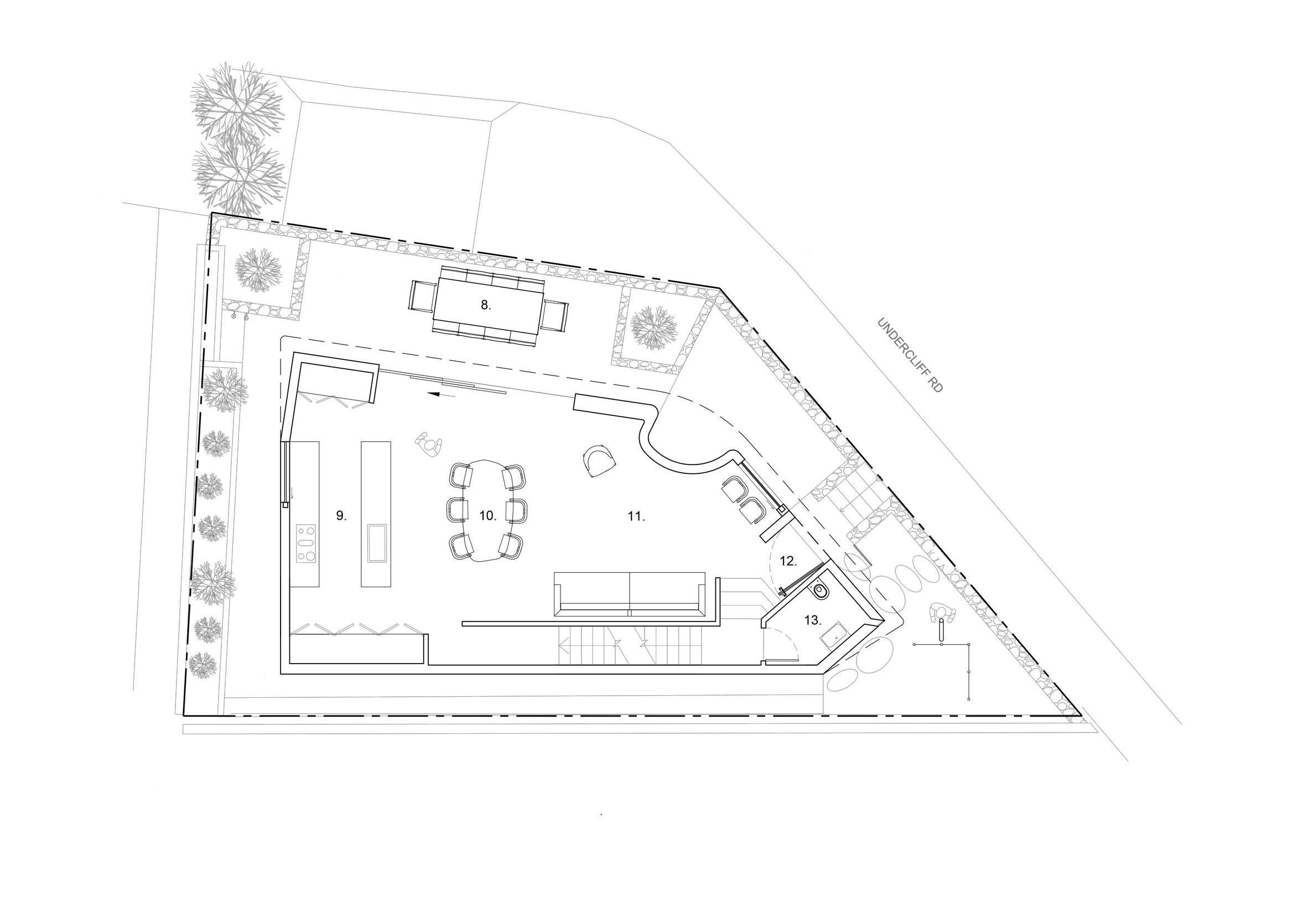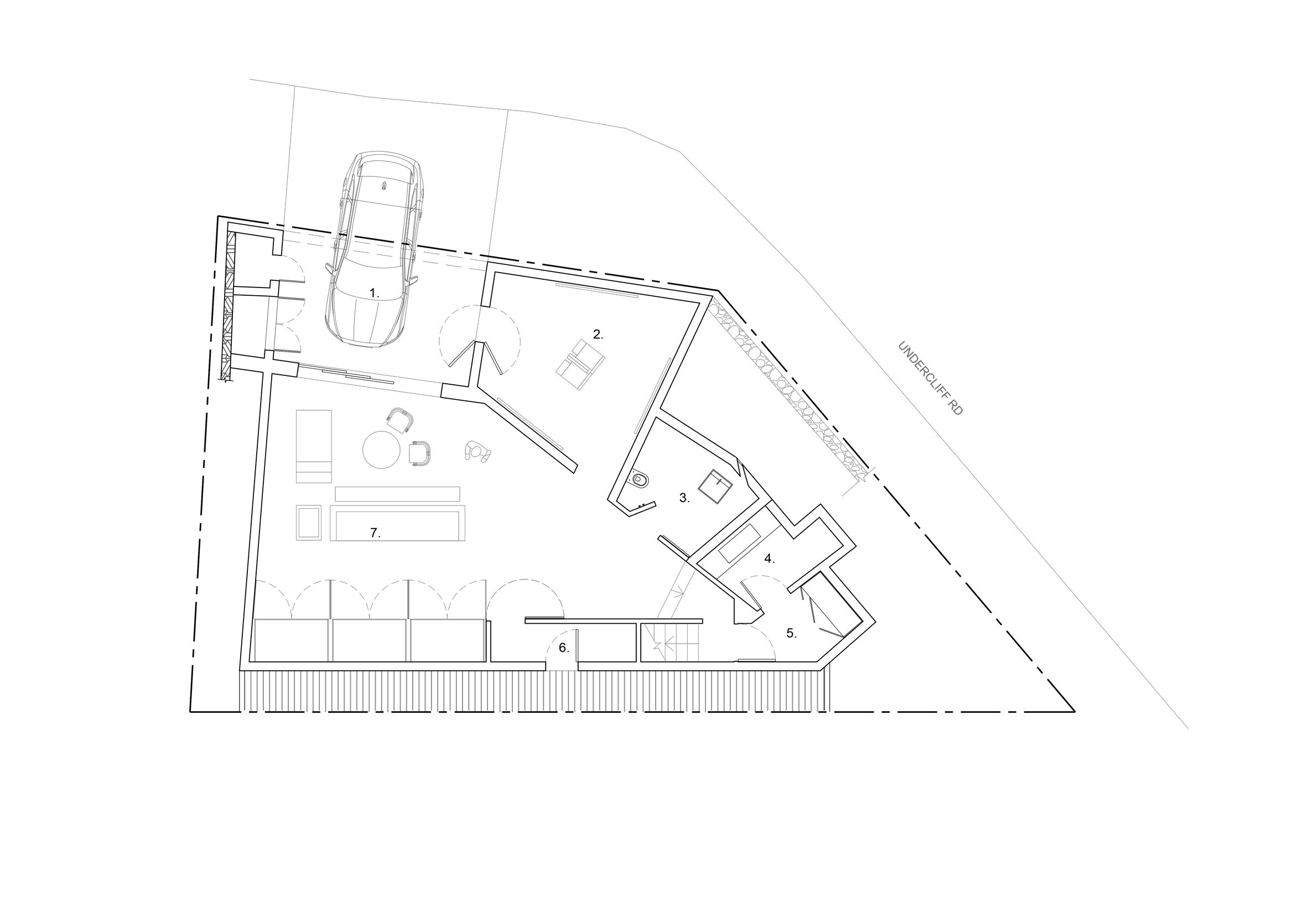 Matopos' sandstone base creates a buffer between the home and the street, providing space for a garage and planters wrapping a more intimate lounge space on the lower ground floor.
