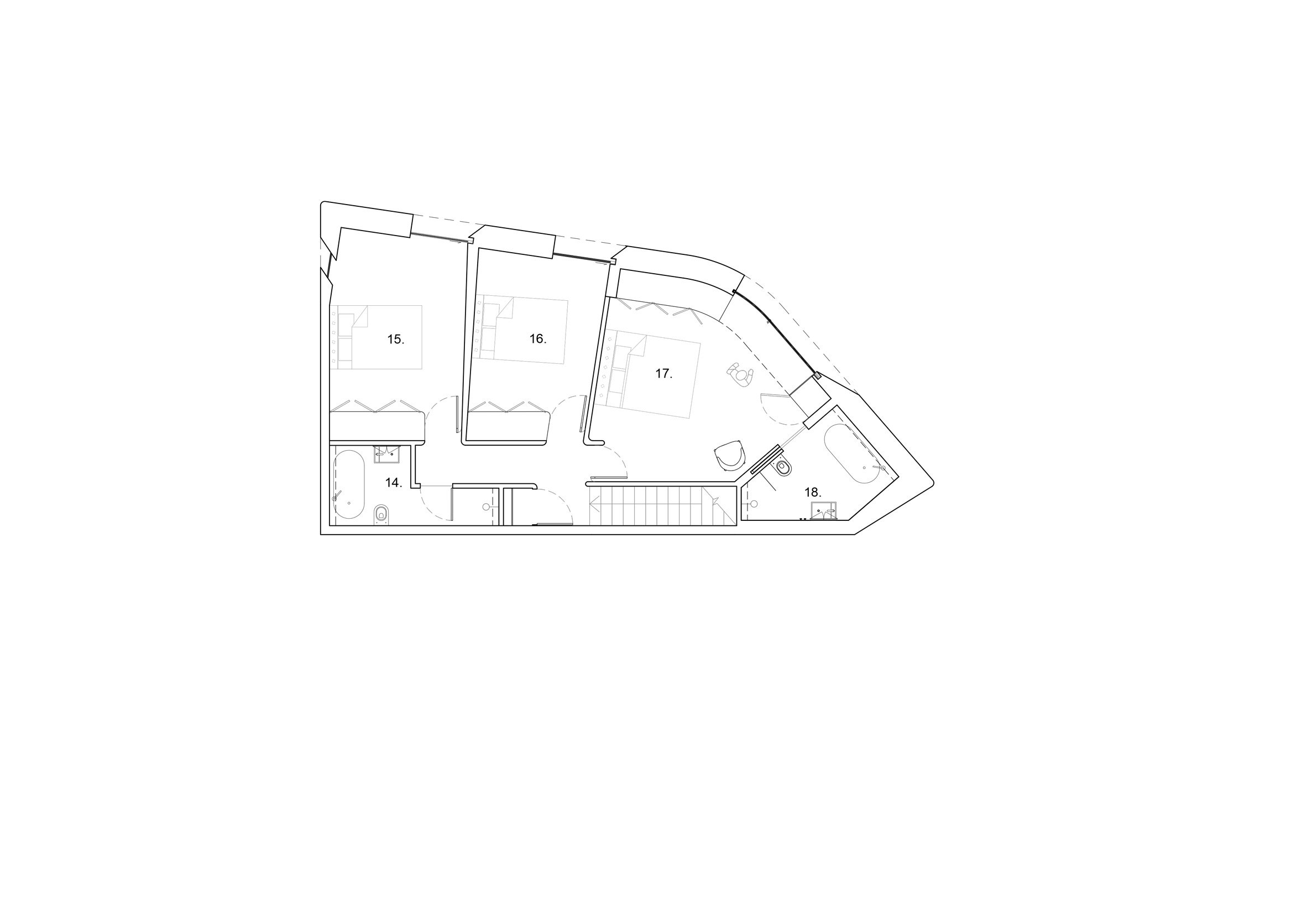 On the bronze clad first floor, three bedrooms are arranged along the gently curving northeastern edge of the home, giving each a view out towards the sea.