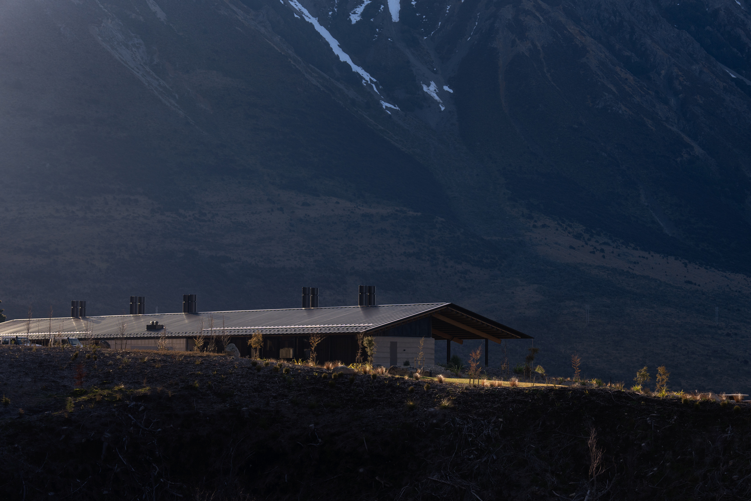 Flanked by mountains, nestled into limestone rock formations, and looking across Lake Pearson to a perfectly symmetrical view of Sugarloaf Mountain is Flockhill Homestead, designed by Warren and Mahoney. Elevated within a valley alone in the landscape, the Homestead is settled within 36,000 acres on a high country station. Flock Hill Station itself derives its name from these rock formations. Our design celebrates and references the early habitation of the landscape by adopting an architecture that consists of heavy masonry elements embedded in the landscape.