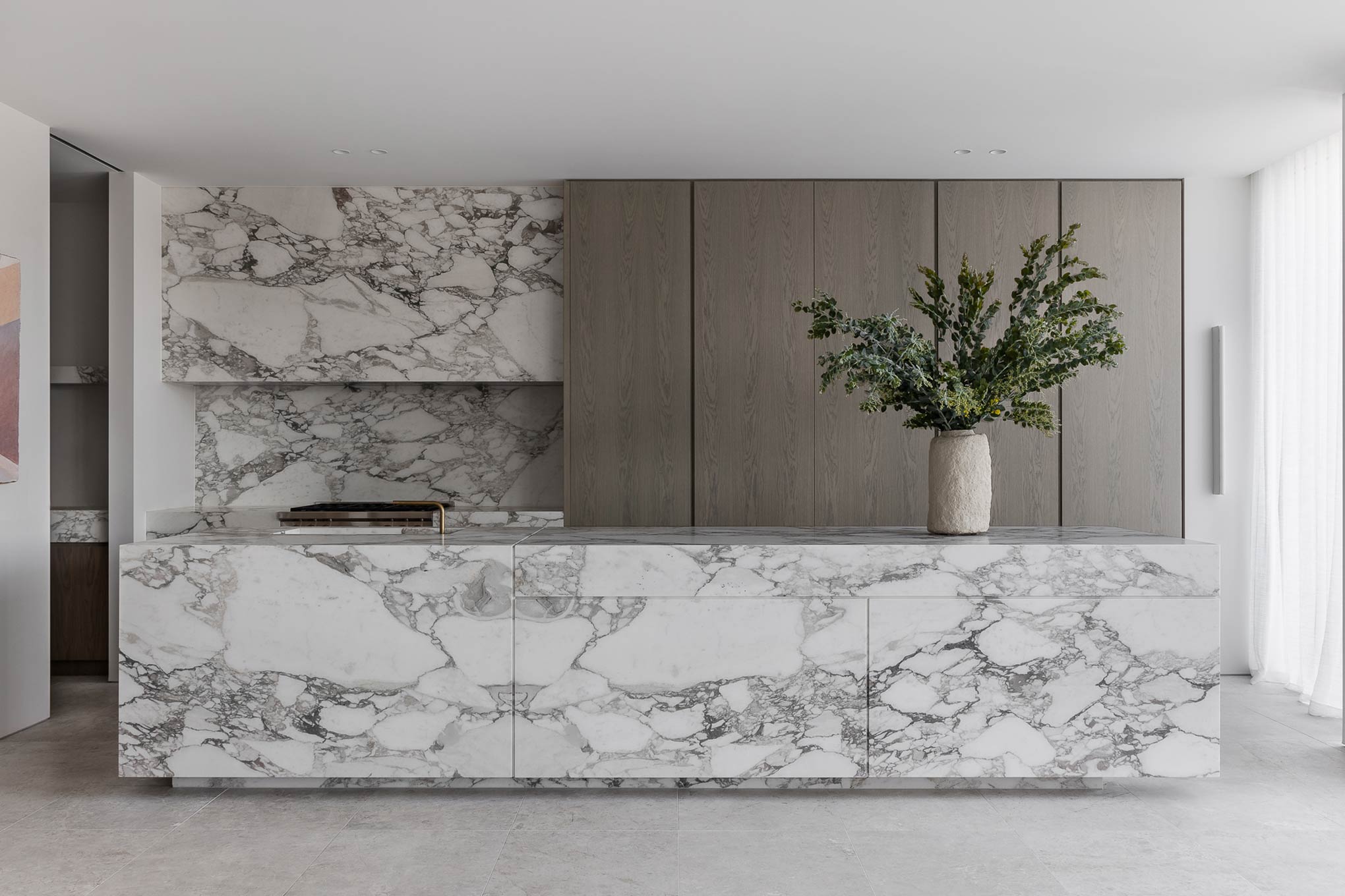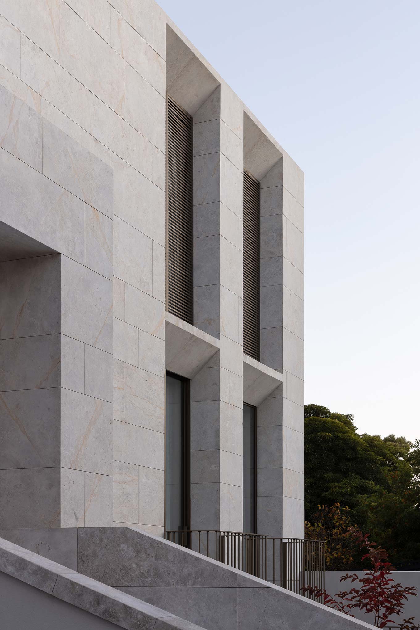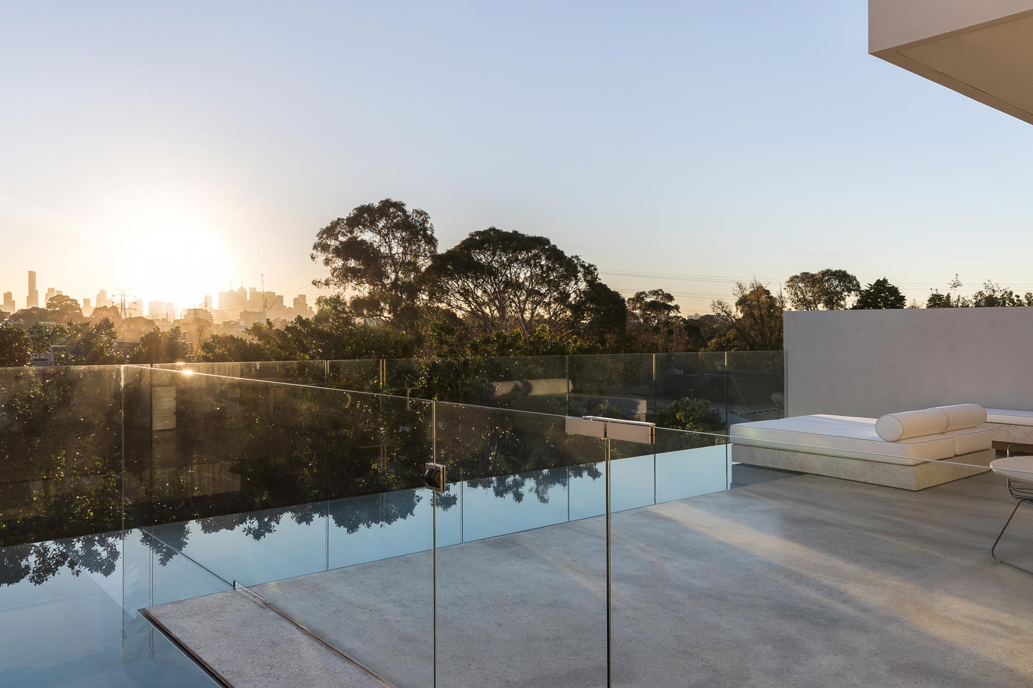 Entry to the home is granted through a gatehouse from the street, where a walled garden creates a sense of privacy and seclusion. The home’s entry floor level is intentionally raised to generate a sense of ‘stepping up’ to a lookout. The acid etched marble of the front façade flows into the interior, intuitively drawing movement through the home’s central spine, across the outdoor terrace and infinity-edge pool, where panoramic views across the city are spectacularly revealed.