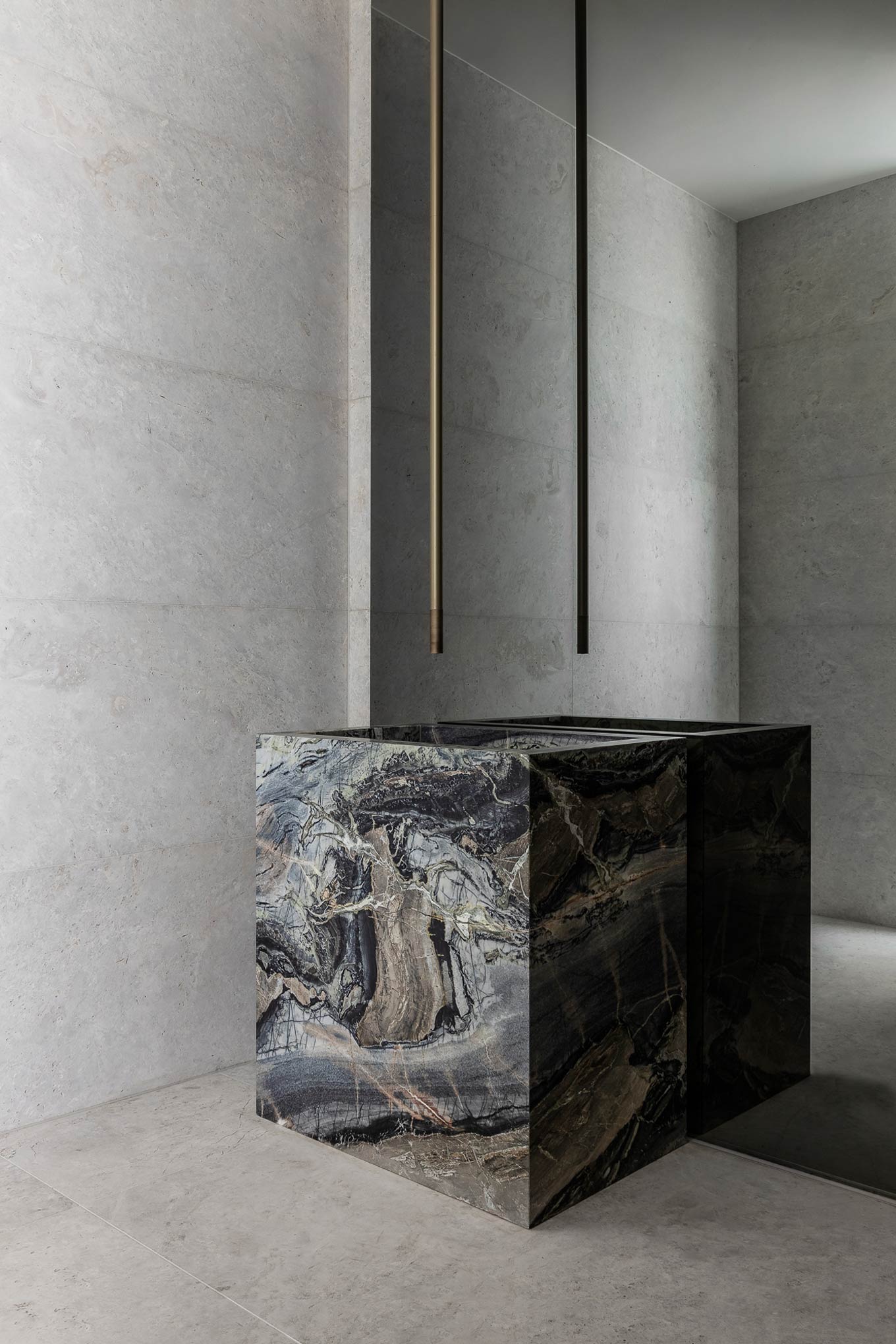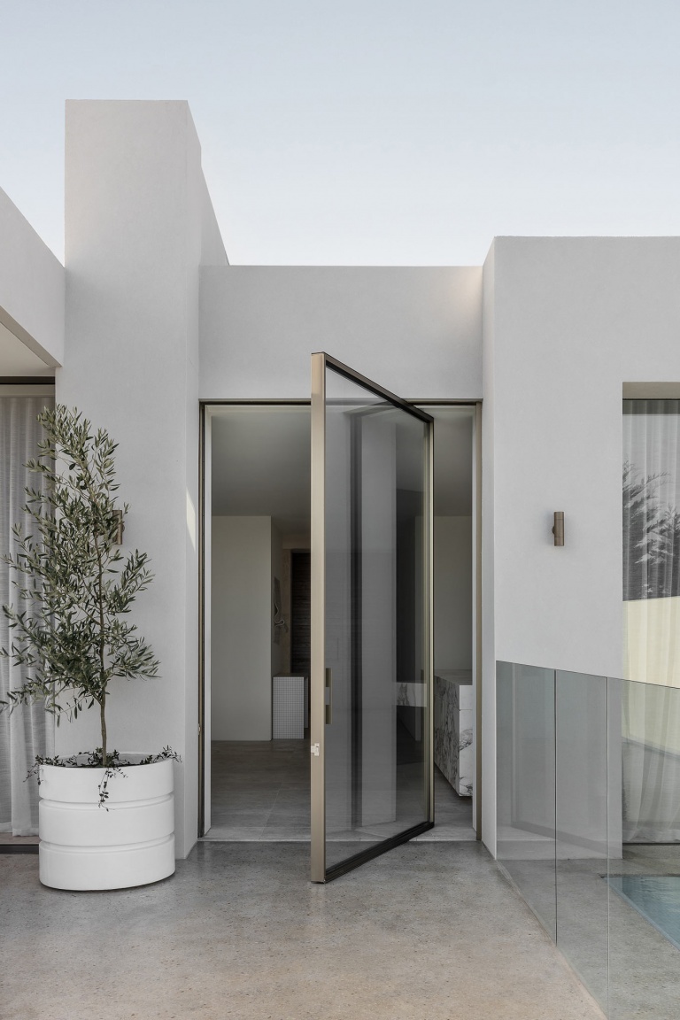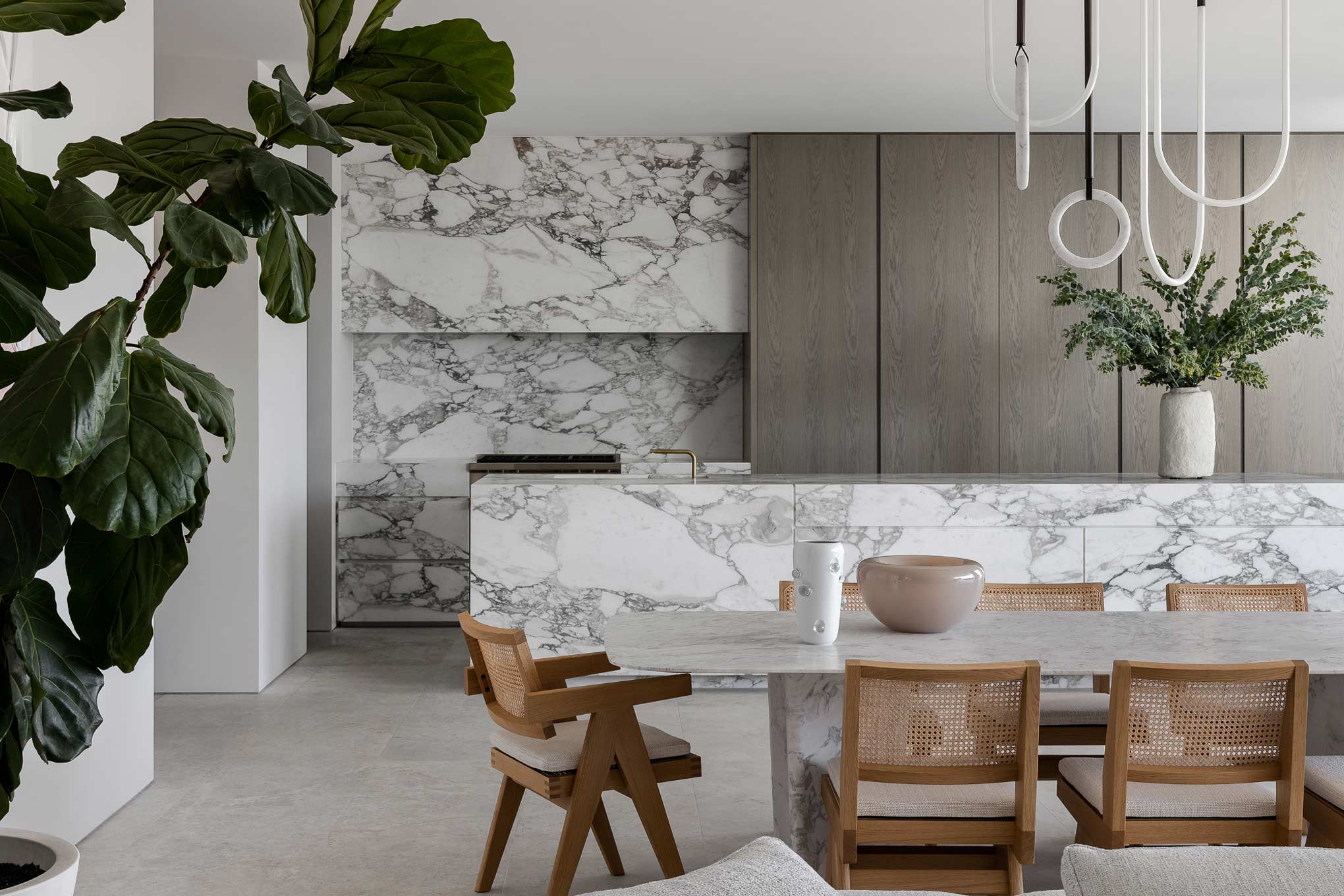 Entry to the home is granted through a gatehouse from the street, where a walled garden creates a sense of privacy and seclusion. The home’s entry floor level is intentionally raised to generate a sense of ‘stepping up’ to a lookout. The acid etched marble of the front façade flows into the interior, intuitively drawing movement through the home’s central spine, across the outdoor terrace and infinity-edge pool, where panoramic views across the city are spectacularly revealed.