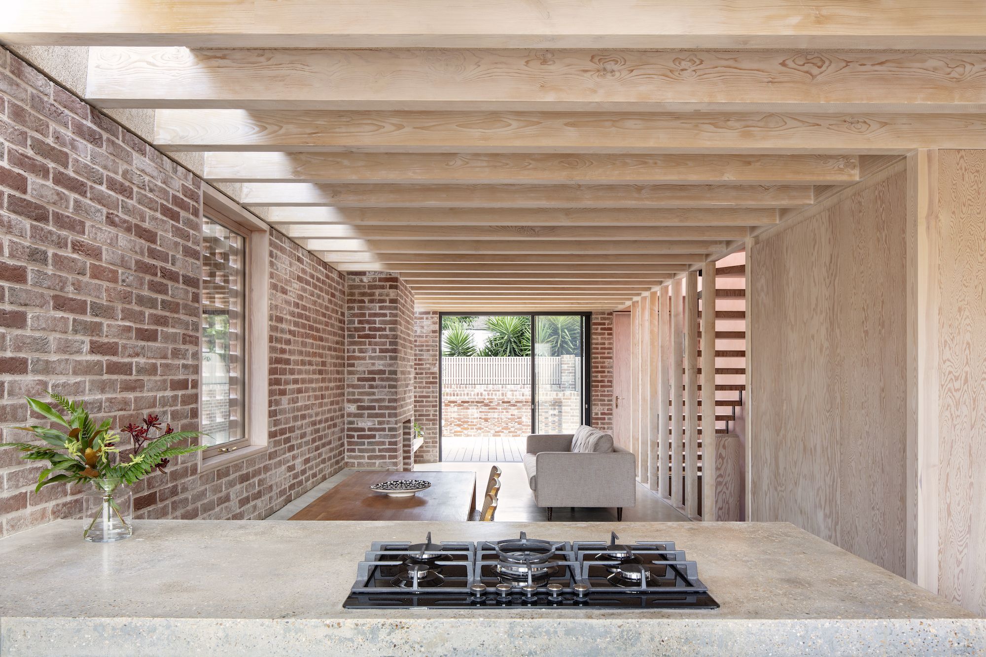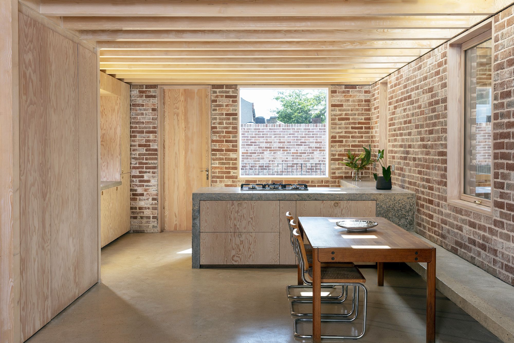 Leyton House is a minimal residence located in London, United Kingdom, designed by McMahon Architecture. Leyton House was created to take full use of its urban infill location. The design, which consists of two separate blocks: a monolithic stone plinth and an intricately detailed timber structure above, is characterised by its elemental nature. Two courtyards are constructed around a full length basement below, allowing light to enter the entire design. A sculptural brick chimney that creates a focal point for the bottom floor’s open layout completes the minimalist design. An surprising richness of space and quiet is created with the help of internally exposed architecture and a warm, natural material palette.