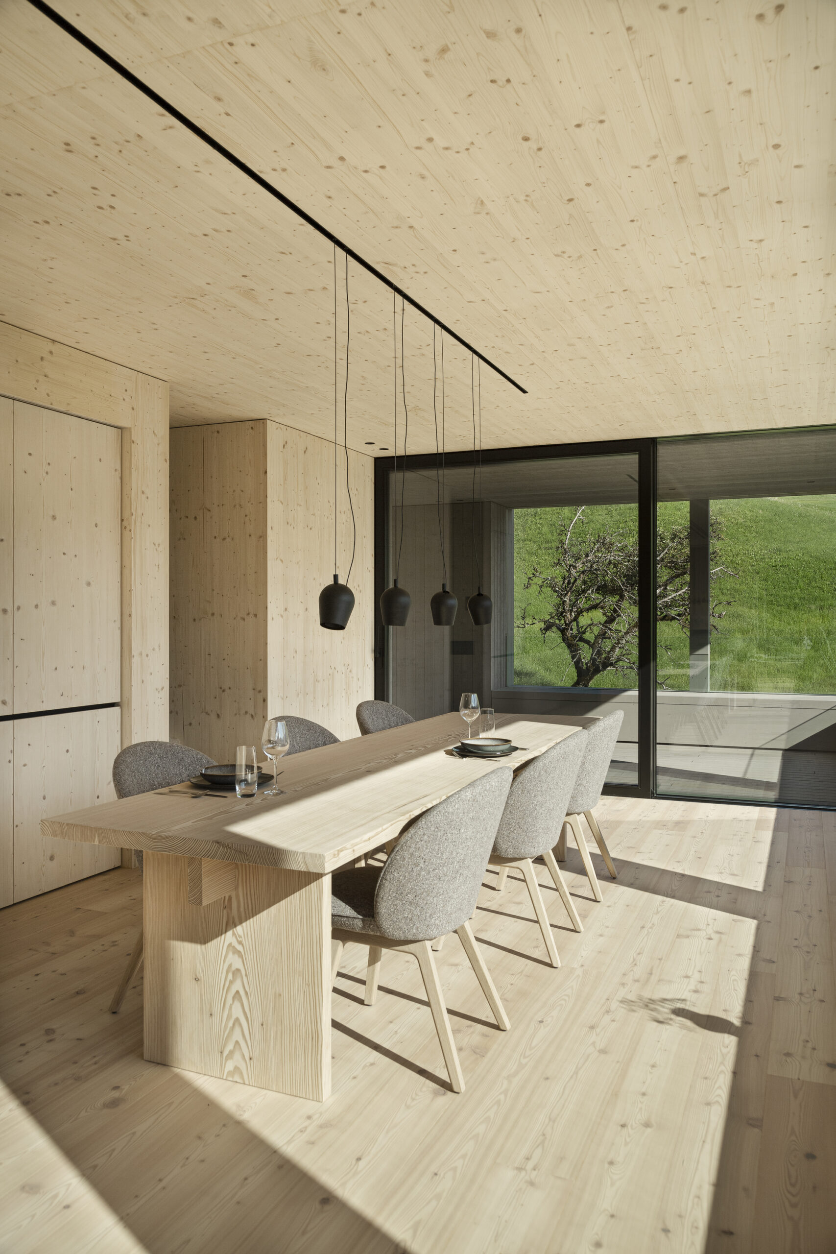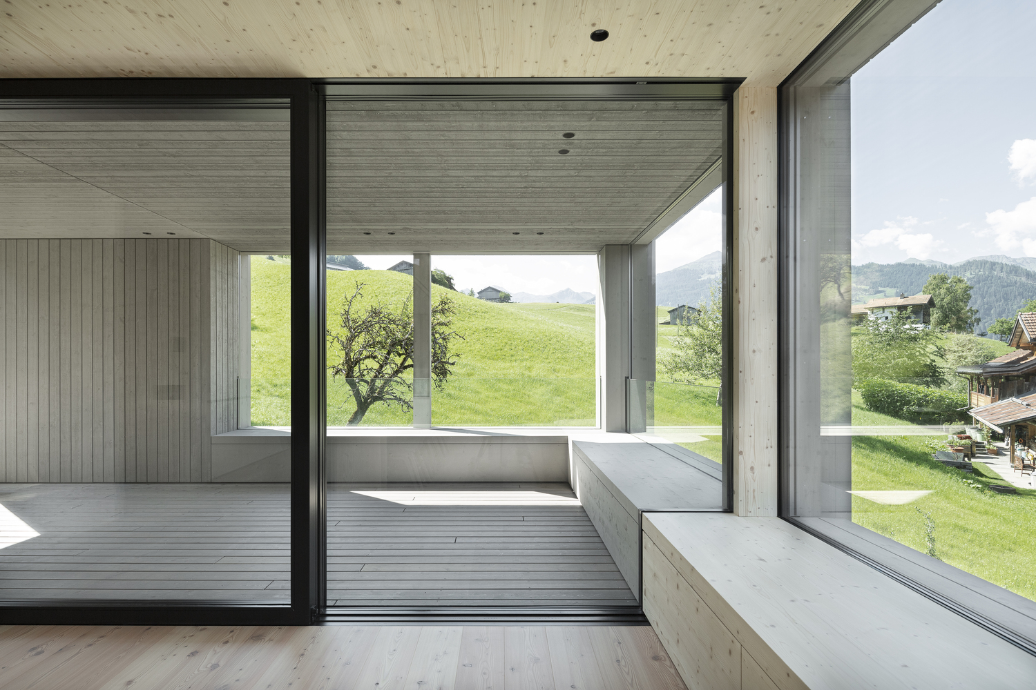 Haus Furggaleidis is a minimal home located in Buchen, Switzerland, designed by Sandro Durrer. Beautiful natural surroundings and an open farming area are all around. The volume’s roots can be found in local stables, which have been influencing the environment for years. House Furggaleidis adopts a variety of motifs and constructions while remaining true to its original intent as a modern residential structure. Strong ties to the environment and excellent terrain integration result in all rooms being configured to best suit their intended uses. The primary living areas are located in the spacious, light filled attic, which maximizes views of the beautiful outside world. The expansive covered outdoor space is connected to the house’s tectonic grid and provides easy access to the garden. The bottom level, on the other hand, creates a secure haven with its private chambers, which is appropriately reinforced by the building’s imposing facade filters. The room has more depth thanks to the gap between these filters and the floor-to-ceiling windows, which also provides natural sun protection. The entire building is encased in a large, unfinished, and pre-greyed oak formwork, which supports the structure’s serene, understated, and transparent exterior aspect.