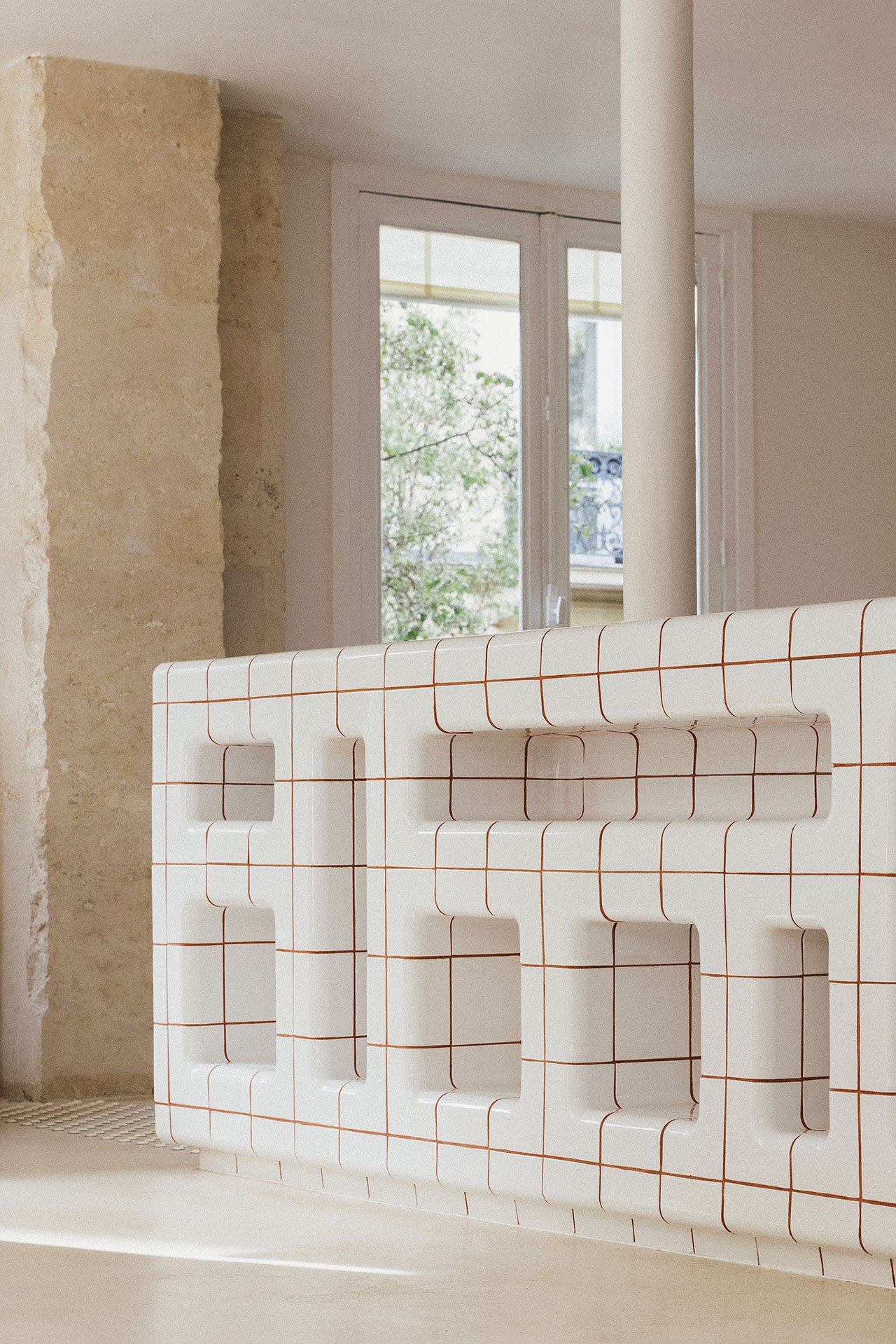 On the ground floor, the softly curved volume of the walnut reception counter echoes the voluptuous shapes of the walnut walls gently embracing a central pillar and the custom-designed armchairs and sofa upholstered in cream coloured bouclé fabric. In contrast, glossy white moulded ceramic consoles, shelves and niches, which have been painted over with a square grid in blue or red, add a dash of crisp graphic playfulness, while maintaining the prevailing aesthetic of rounded forms. Cubic pedestals in metal and wood on the other hand reflect the rectilinear geometry of the stone pillars.