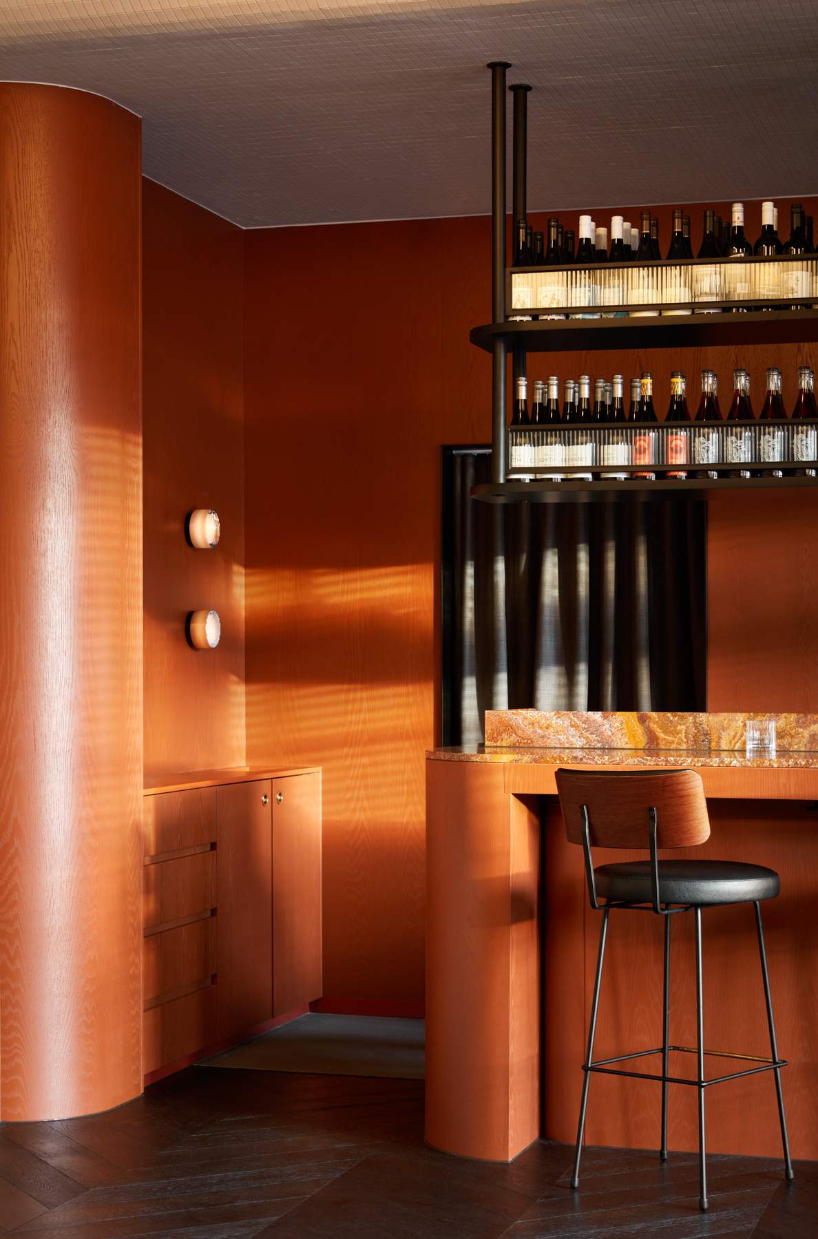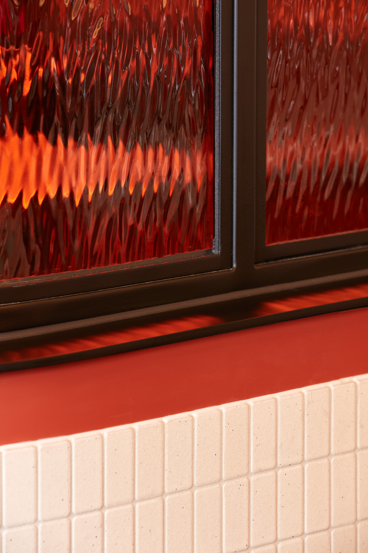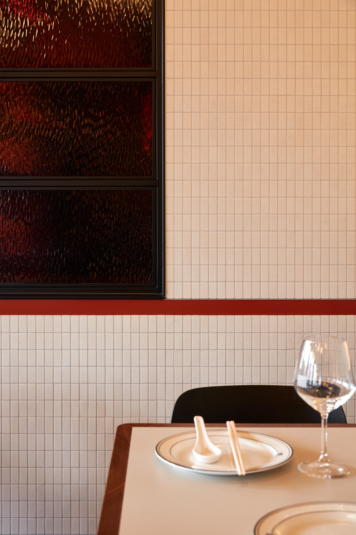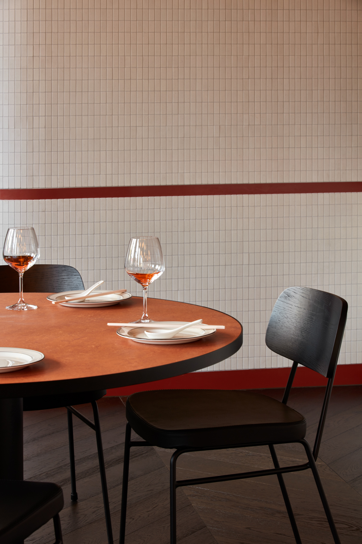 Burnt orange – or as the architects call it, “duck skin” is the prominent colour. Inspired by the golden colour of traditional roast duck, it casts a soft amber glow over the creamy tiled walls.