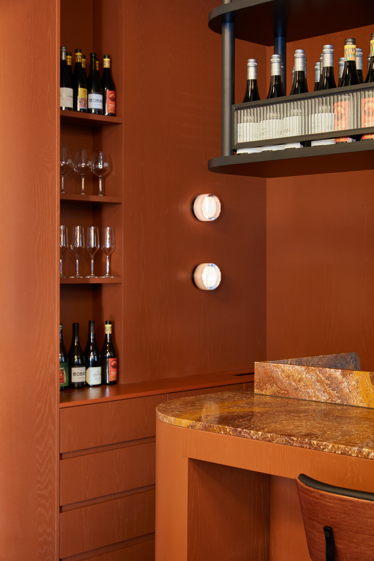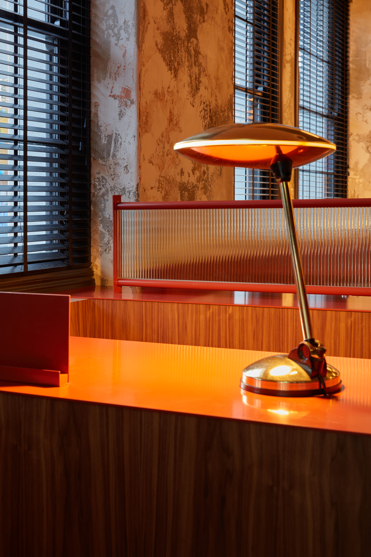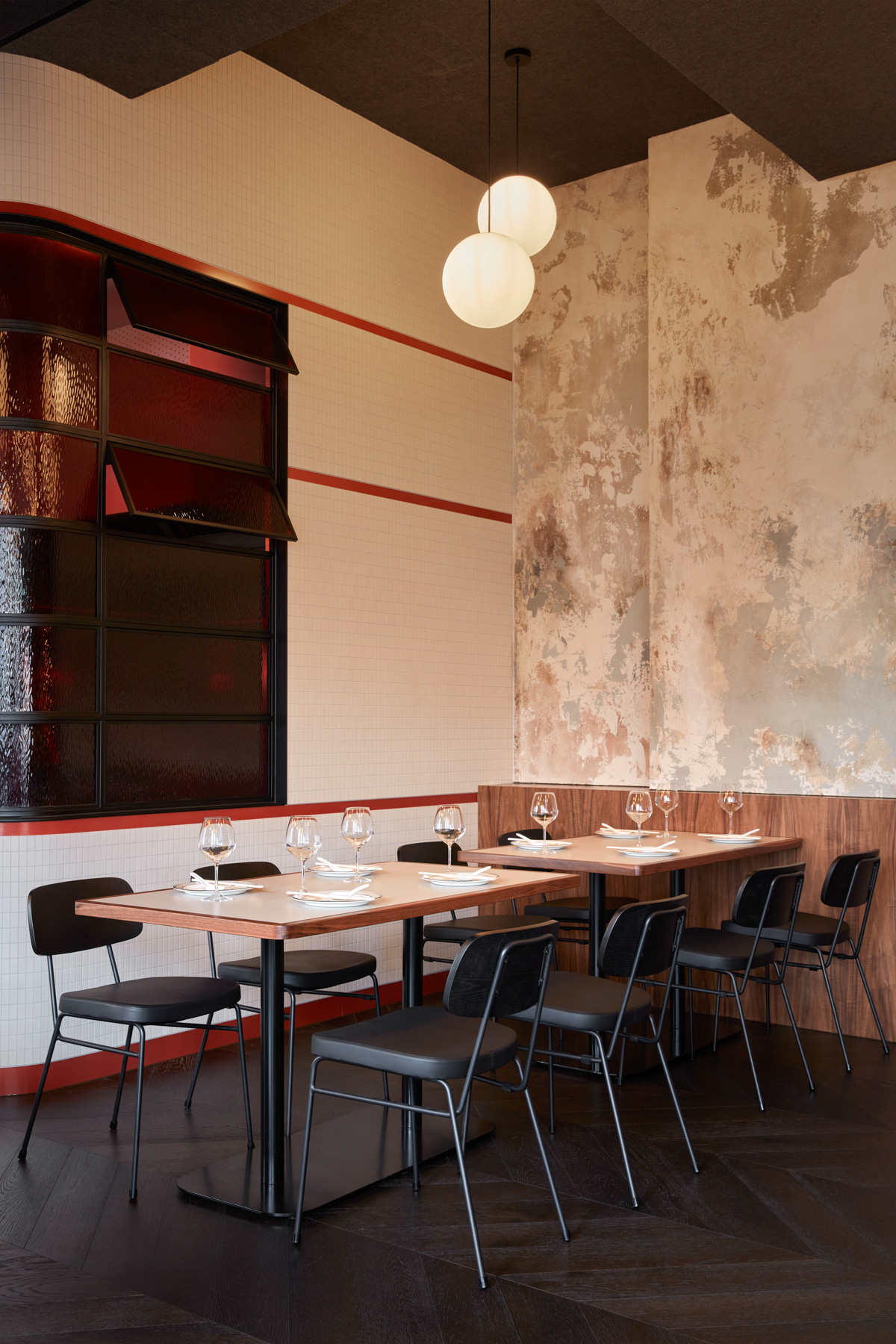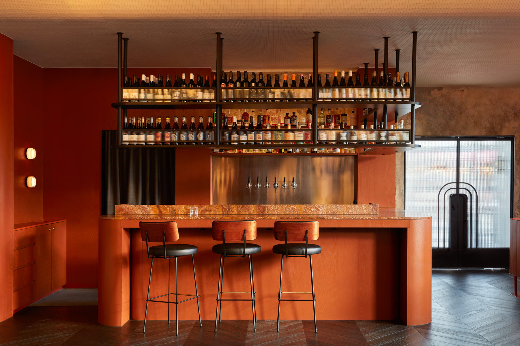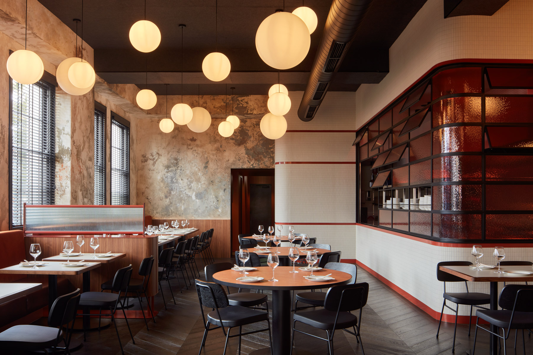 Burnt orange – or as the architects call it, “duck skin” is the prominent colour. Inspired by the golden colour of traditional roast duck, it casts a soft amber glow over the creamy tiled walls.