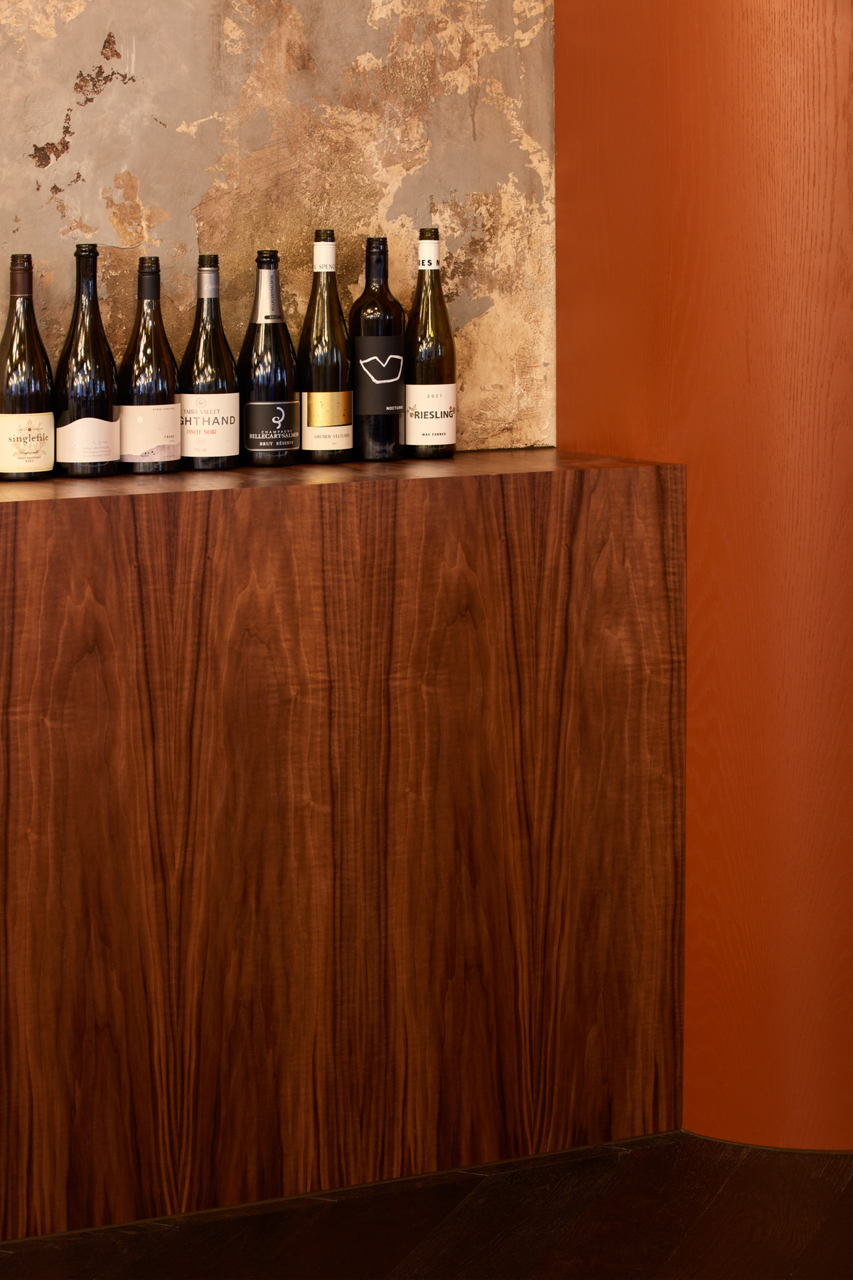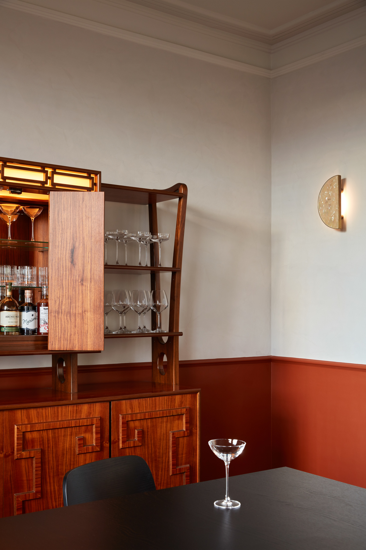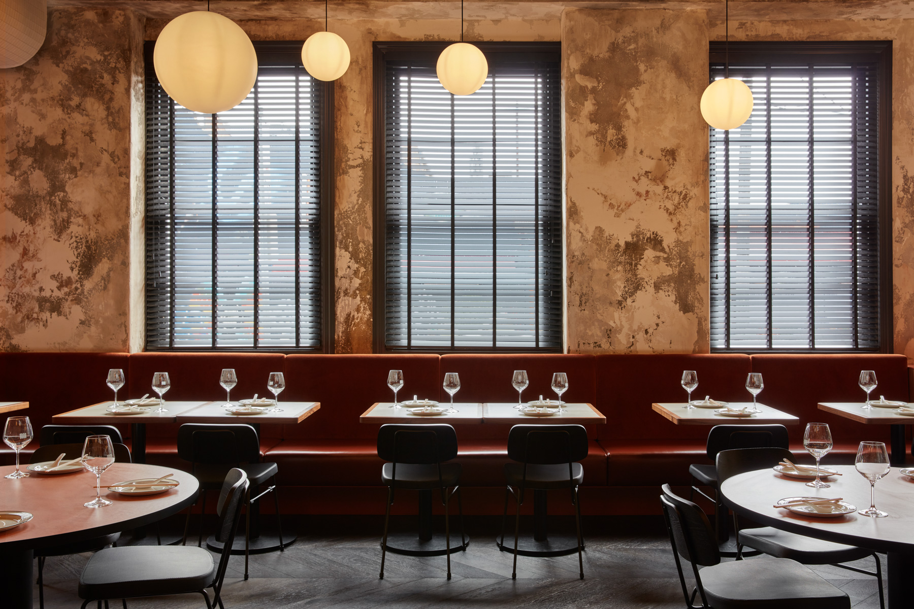 There is contrast in both texture and colour; hammered glass and curved metalwork sit alongside tiles, velvet banquettes, walnut veneer and vinyl and onyx surfaces. Burnt orange – or as the architects call it, “duck skin” is the prominent colour. Inspired by the golden colour of traditional roast duck, it casts a soft amber glow over the creamy tiled walls. White spherical pendants drop seemingly sporadically from the ceiling; they’re a fitting contemporary interpretation of the deco aesthetic and a nice reminder that every element of this space has been considered. There’s a private dining and event space upstairs, too. The design reflects that of the main restaurant (think ochre tones and 30s-style chandeliers) while high ceilings, intricate cornicing and vintage Australian furniture offer a welcomed richness.