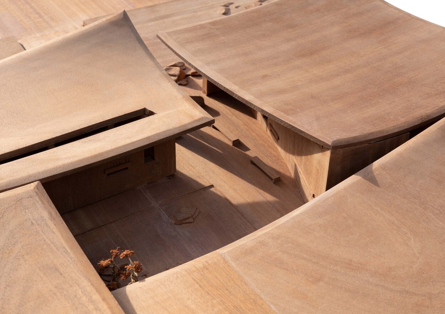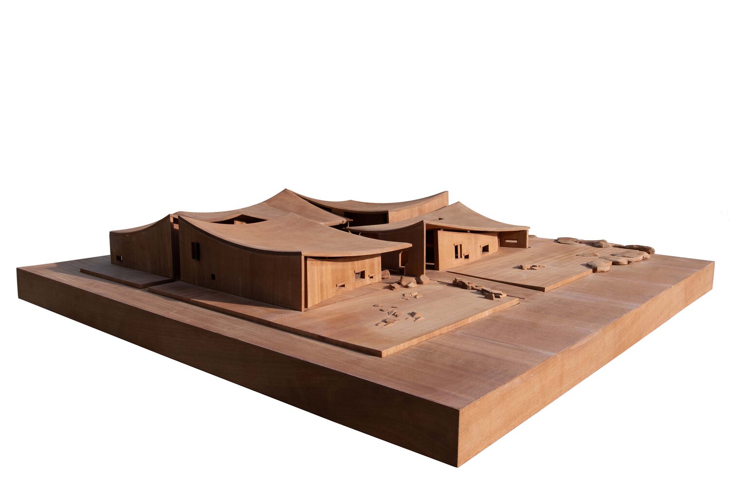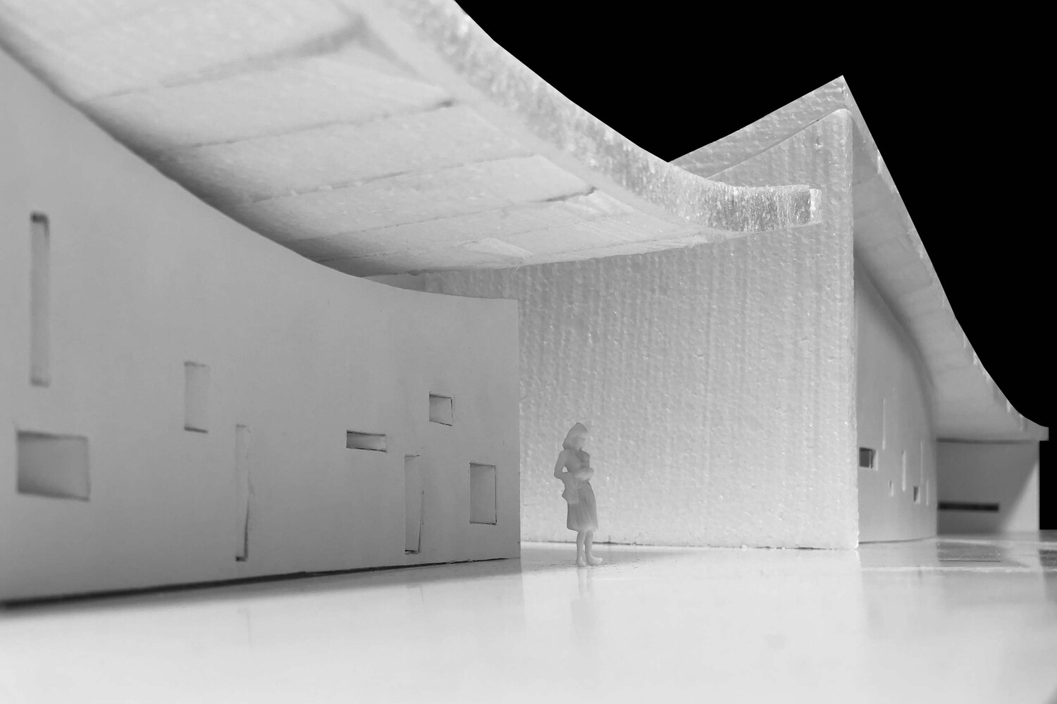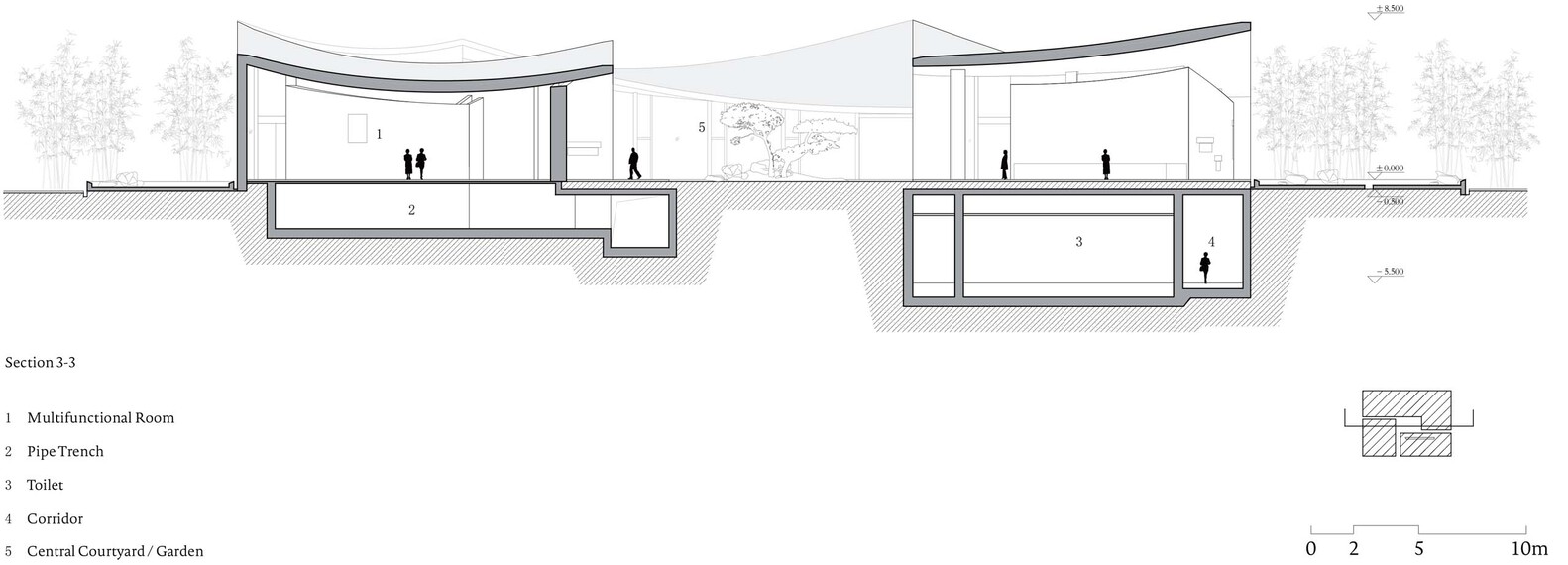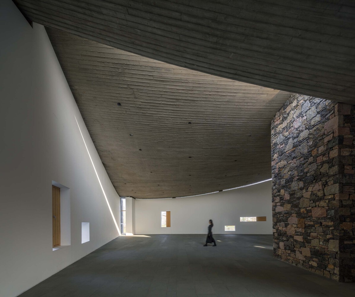 The architecture is simple and relatively rough with its material characteristics, such as concrete roofs, masonry stone walls, and so on. The hyperboloid roof sags due to gravity in nature, which also brings good tension to space. Although people are in a seemingly rectangular and simple space, due to the change of the roof, the homogeneous space becomes very tense.