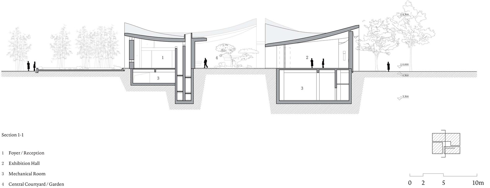 특히 지붕과 지붕이 만나는 중앙에 위치한 거대한 보이드, 중정은 전시의 오프닝 행사와 같은 프로그램 진행이 가능하다