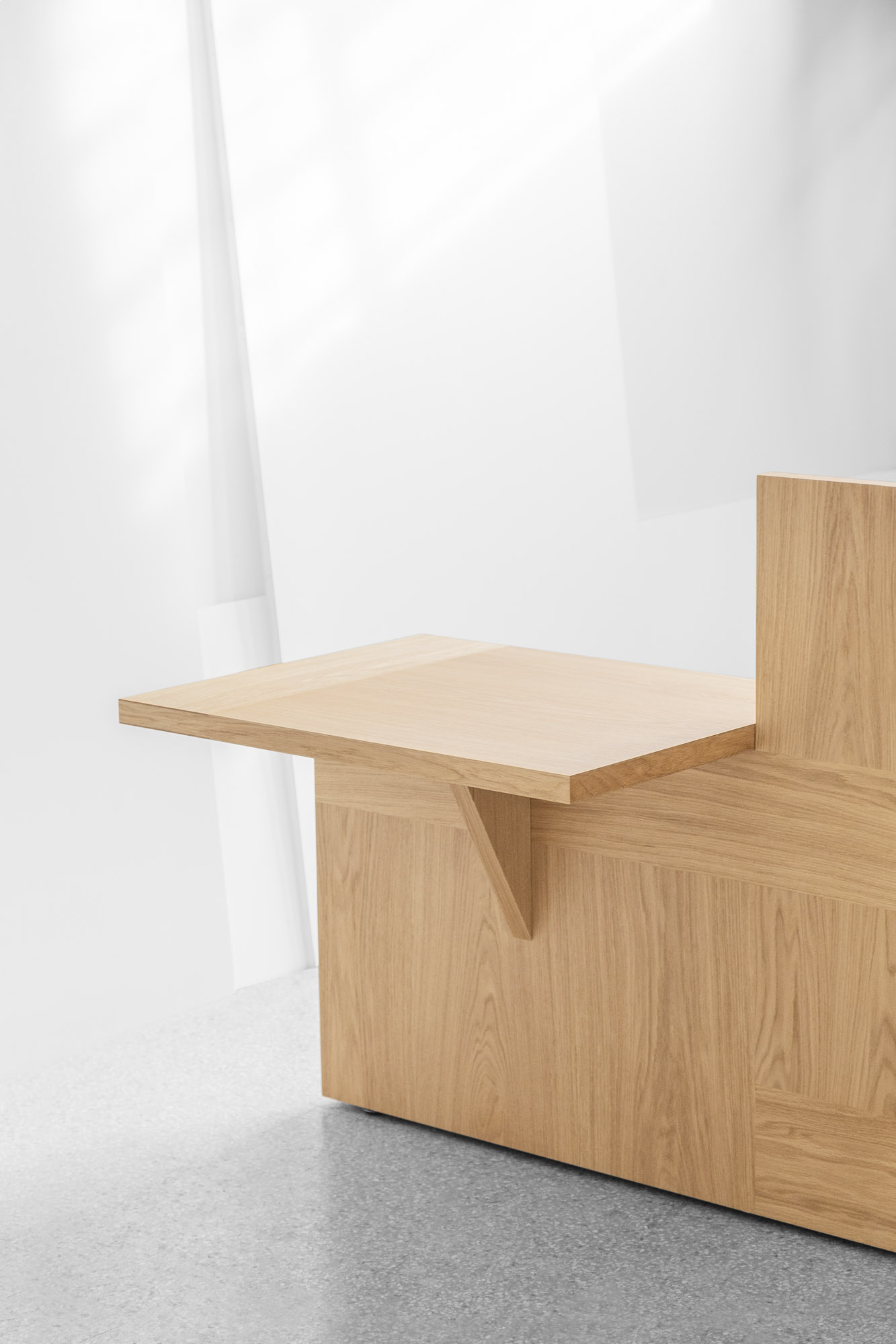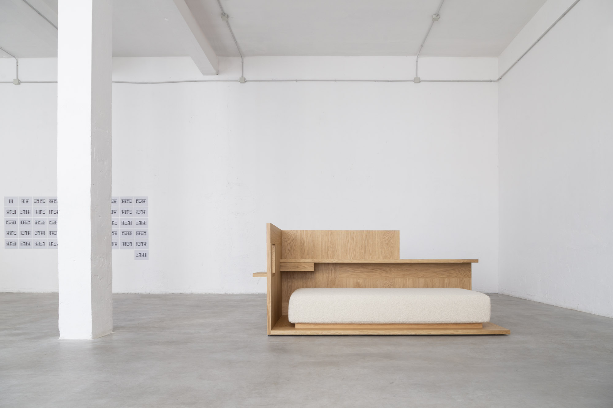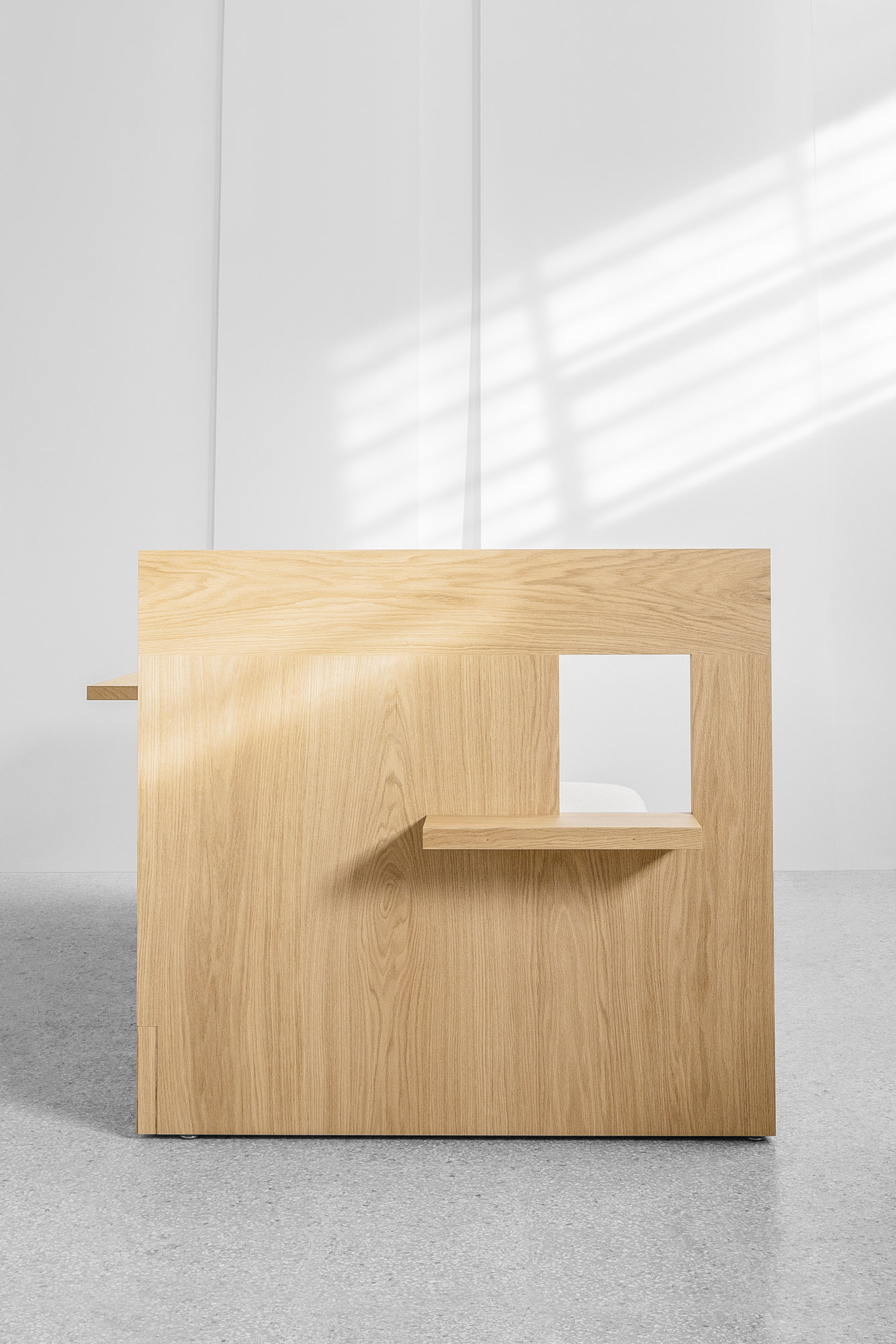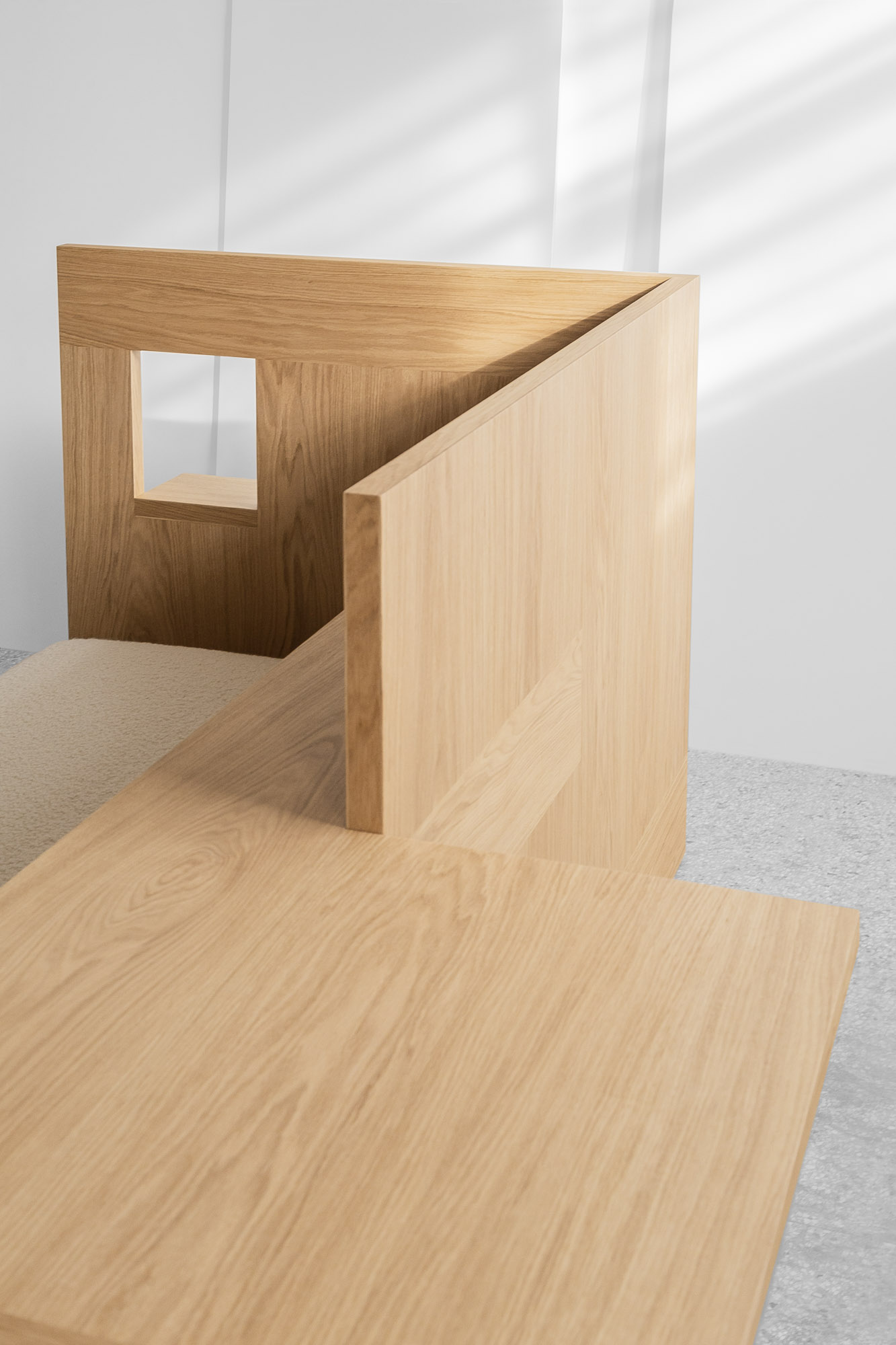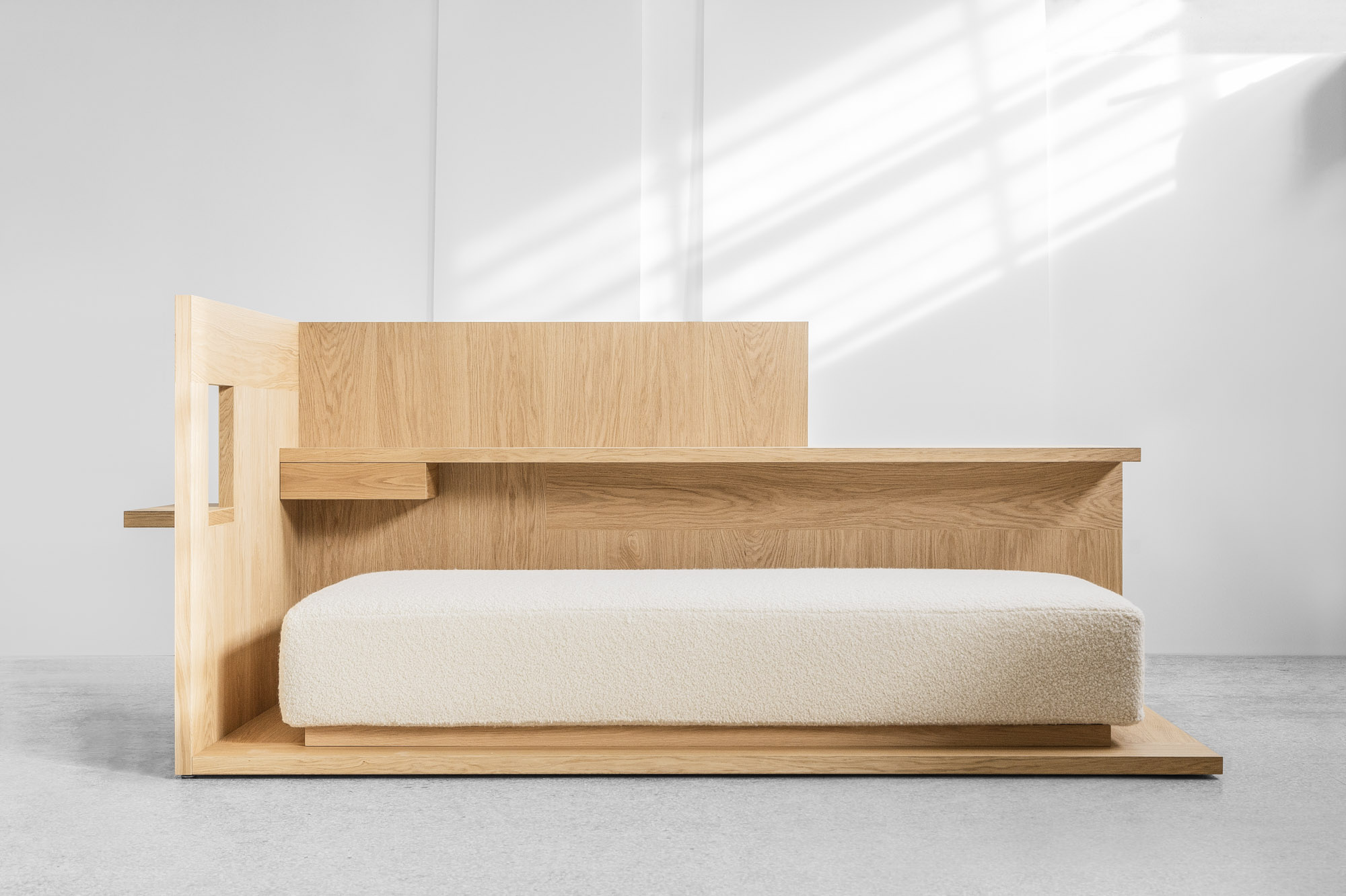 DAYBED is a minimal limited edition piece designed by Konstantin Grcic for Giustini/Stagetti. Similar to a Renaissance studiolo, the DAYBED was created as a self-contained space for reading, learning, and contemplation. A wooden box with a rectangular platform and two adjacent sides is used to contain the mattress. A little window with a ledge that extends outward is located in the wall at the top of the mattress. The longitudinal wall has a wooden shelf and drawer inside. The latter widens into a compact working space that cantilevers outward from the box. You would use it by raising a chair. The saw-cut oak veneer that is put in a specific pattern forms the fundamental structure of the DAYBED. Warmth and serenity are provided to the piece by the wool bouclé fabric that covers the mattress.