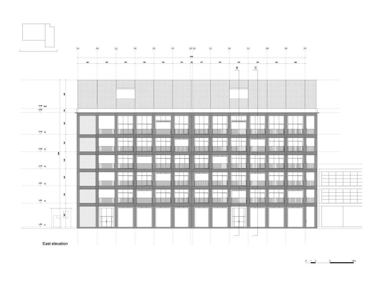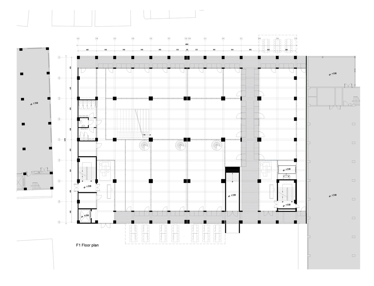 Rather than demolish and rebuild, the design sustainably renovates a disused factory building, maintaining a piece of Nantou’s history while also having lower embodied carbon emissions than a new building. The building’s original structure has been strengthened so that an extra floor could be added on top to maximize floor area. Meanwhile, the original façades have been removed, with the building’s concrete frame exposed and preserved to show traces of the building’s history. The new façade is set back from the edge of the structure, creating open loggias that wrap around the whole building. These allow for circulation and enable the chance encounters with colleagues that make for a dynamic creative environment.