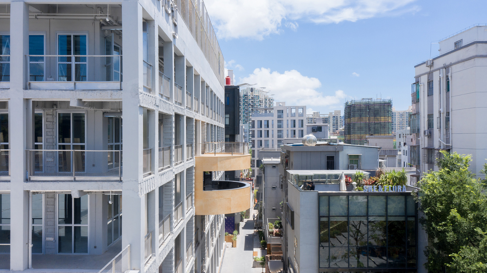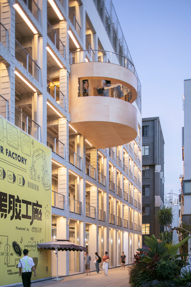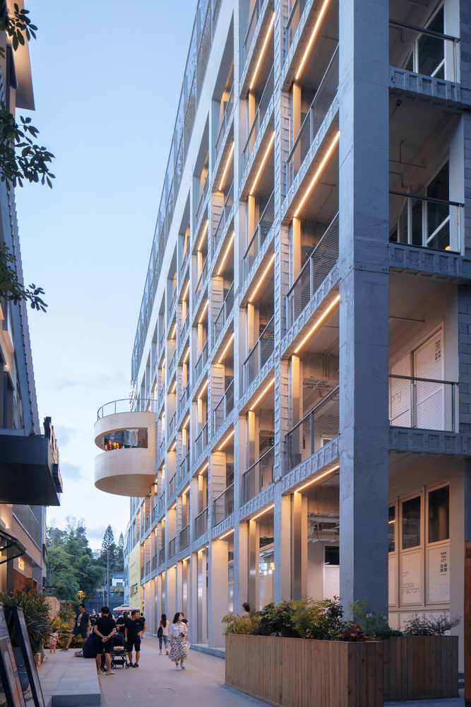 Facing a small public square on the ground floor, a protruding tube like structure clad in wood marks the entrance to the public staircase that carves its way through the building. Inside, the staircase is clad in mirrors and festooned with bright neon signs, creating an aesthetic reminder of the early days of Shenzhen’s urbanization. On the fourth floor, this staircase protrudes out the other side of the building – a chance to take in a view the surrounding rooftops – before turning and continuing up to the roof.