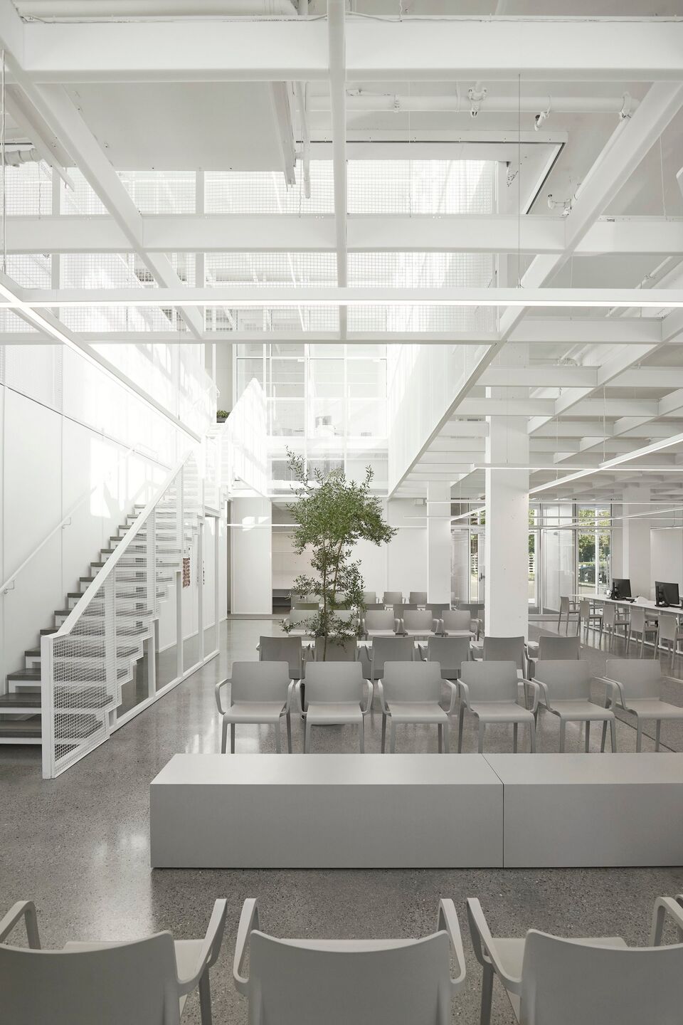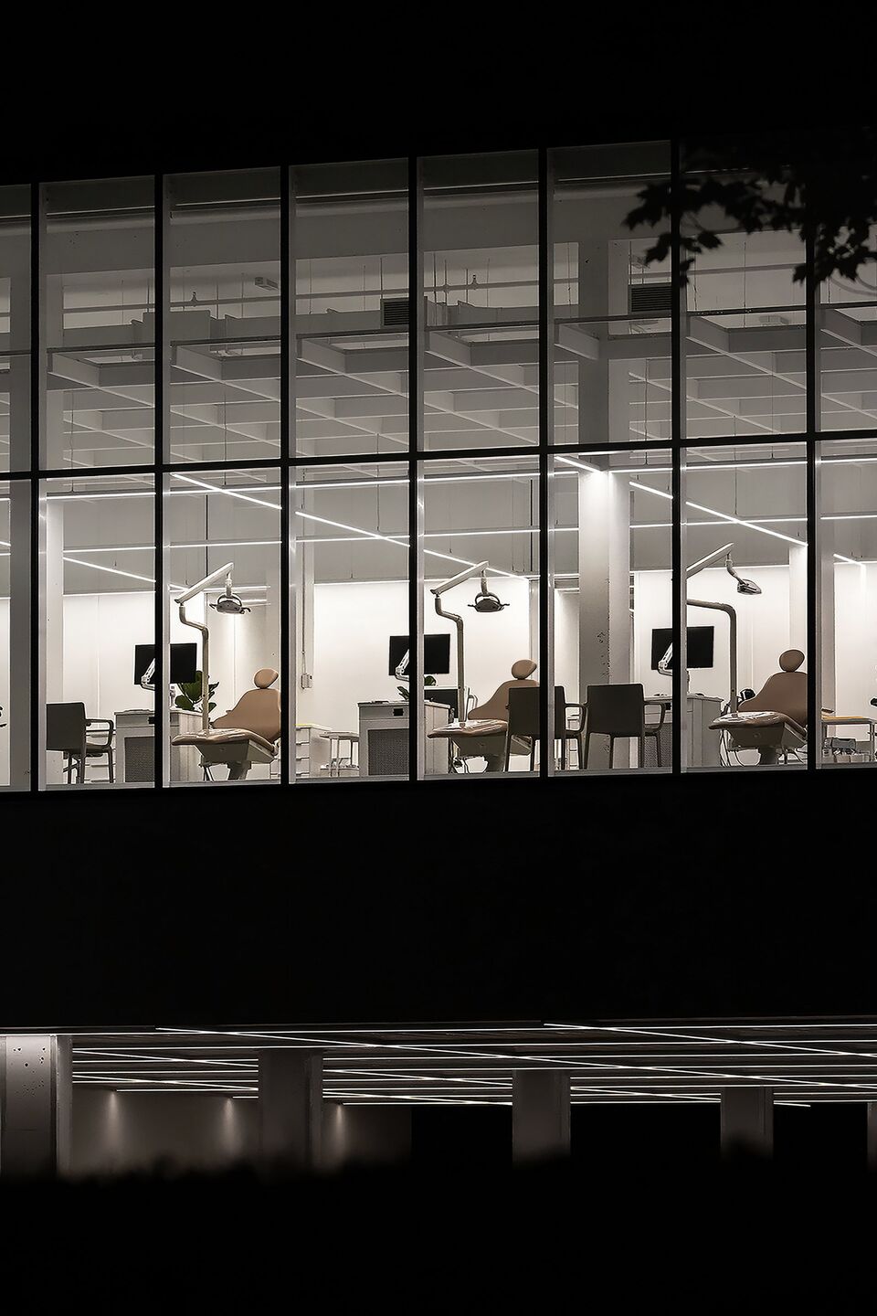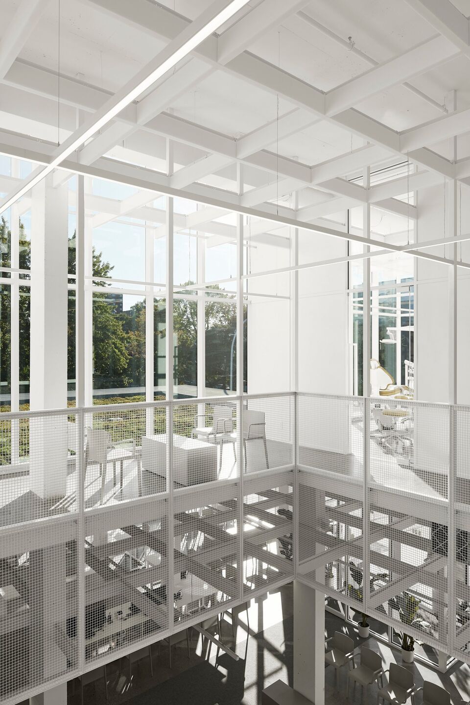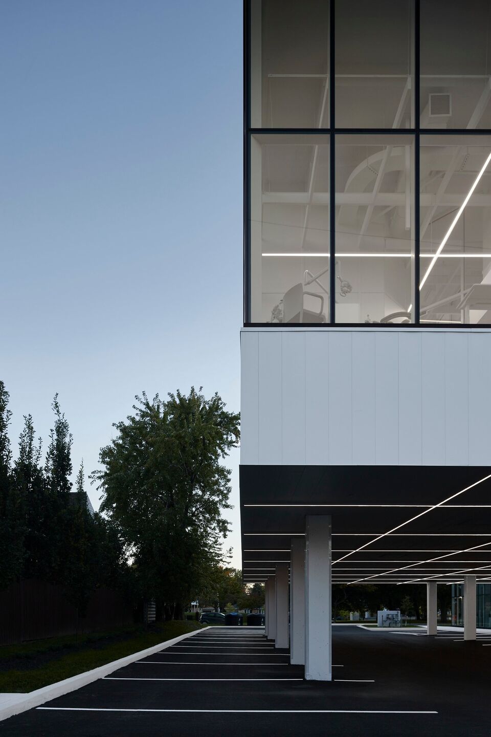 With natural elements being recognized as factors that reduce psychophysiological stress, the architectural proposal maximizes sunshine, luminosity, and the presence of vegetation. Covered in curtain walls, featuring ultra clear glass surfaces with high-performance low-emissivity film, the clinic is bathed in an enveloping light that provides a soothing atmosphere. Transparency creates visual permeability on both the green and urban environment, with seasonal changes and weather moods, as well as pedestrian flows, providing benefits for both clients and the entire clinic team. In correlation, a permanent connection with the exterior also provides an openness on the professional activities and interactions taking place inside of the clinic.