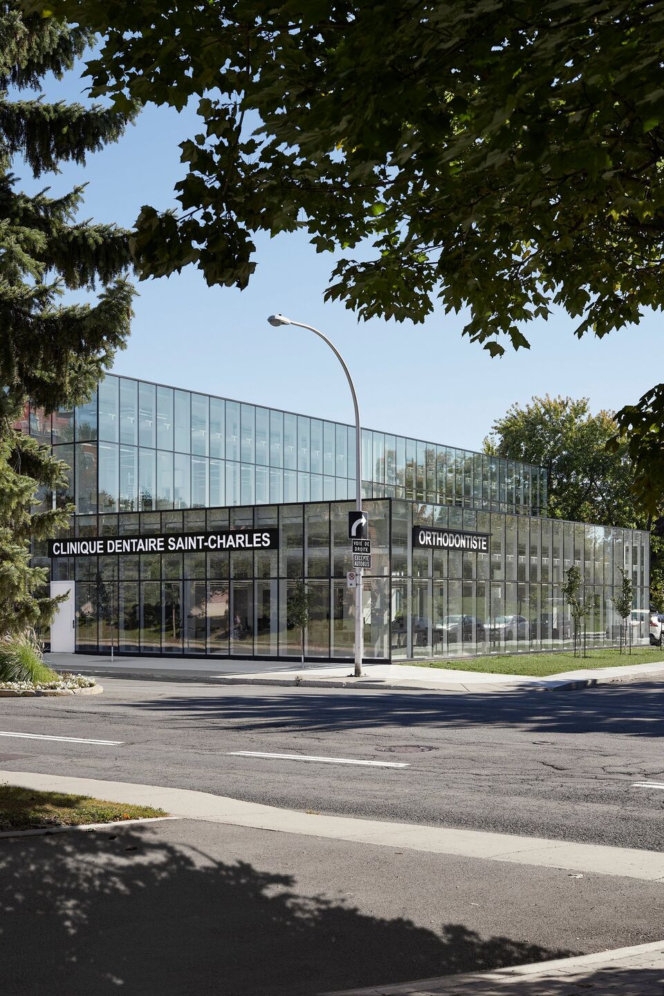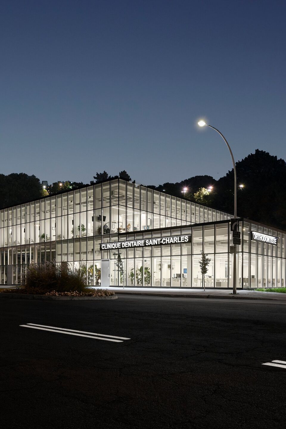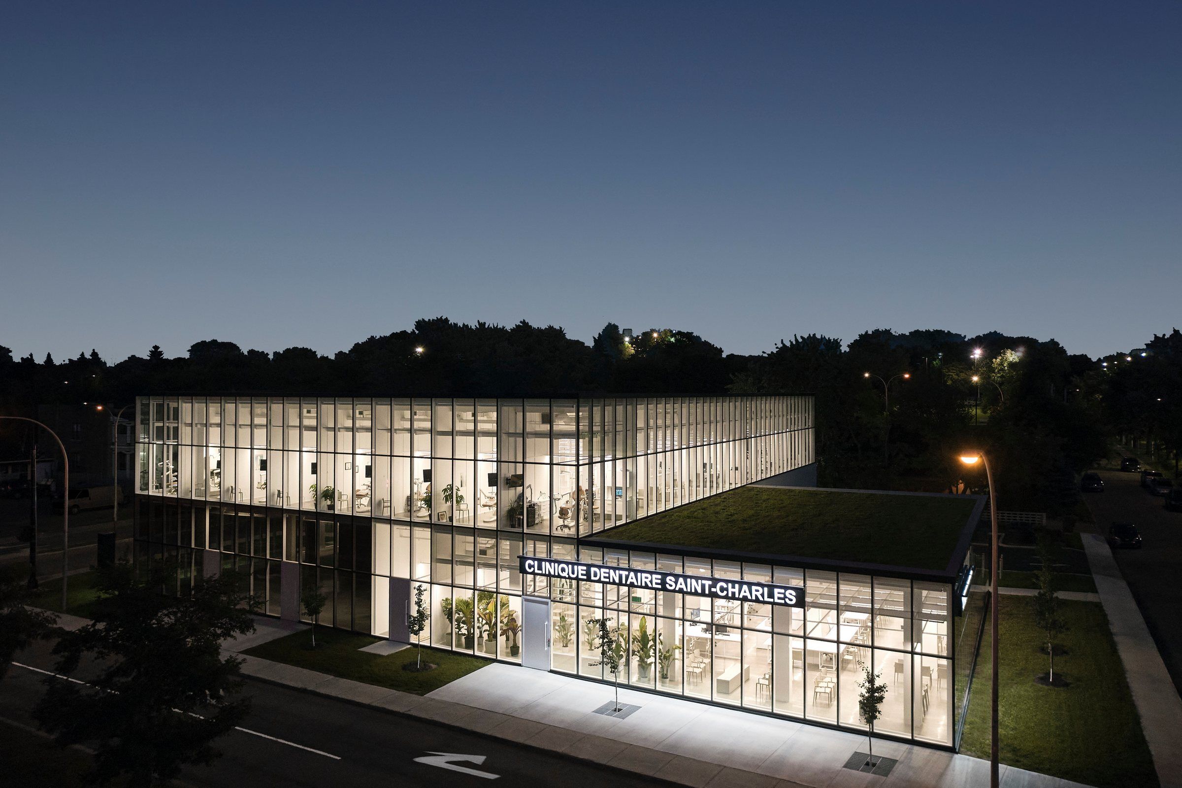 At the entrance to Vieux Longueuil, situated between its residential and commercial areas, on a piece of land left uncultivated for many years, Studio Jean Verville architects has erected a 2,600 square meter dental complex based on the concept of biophilia.