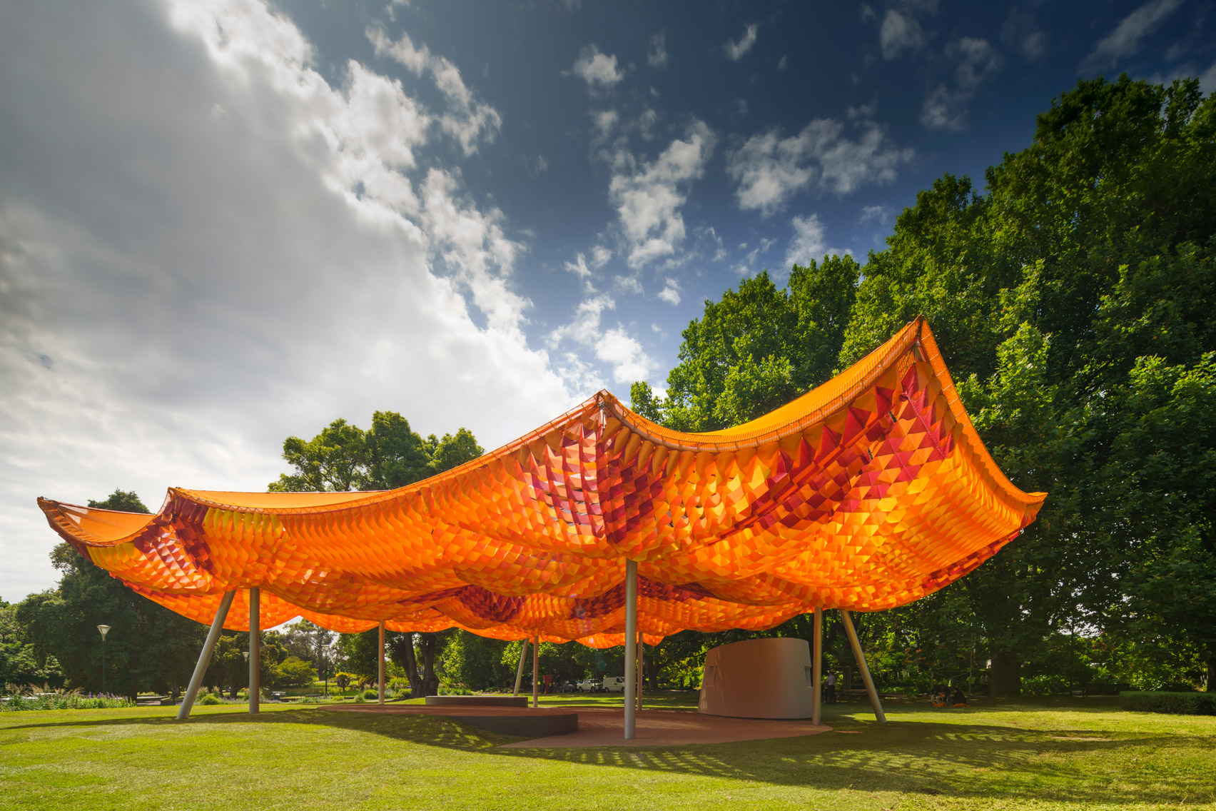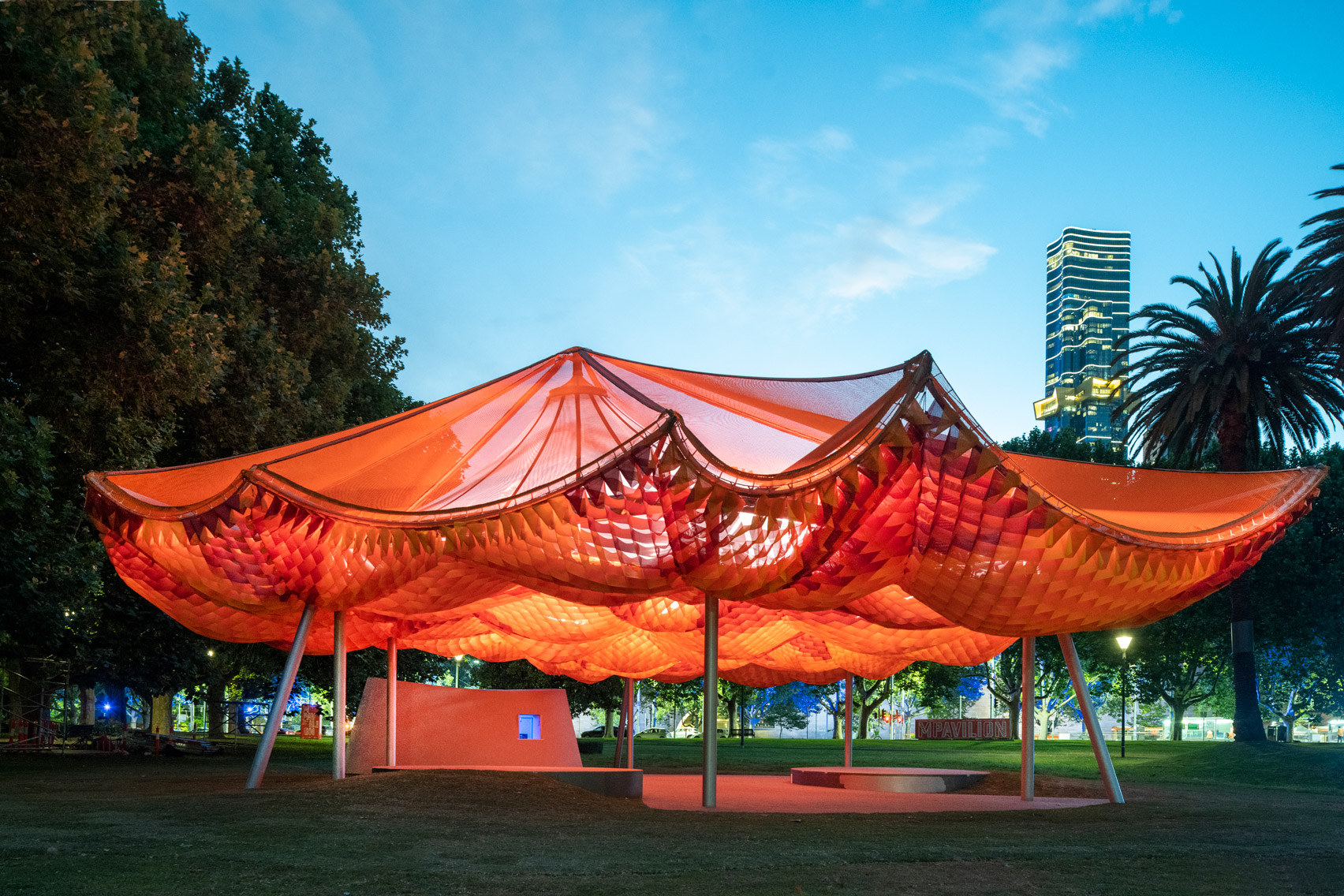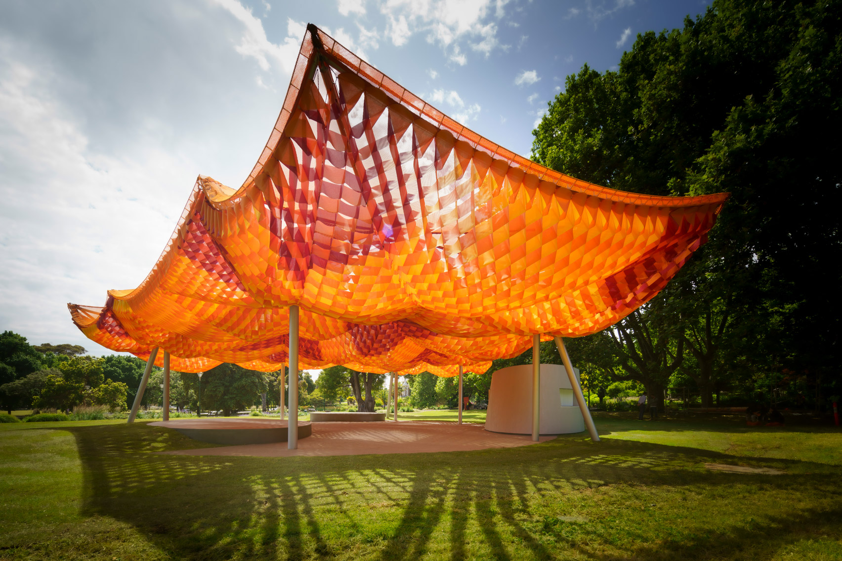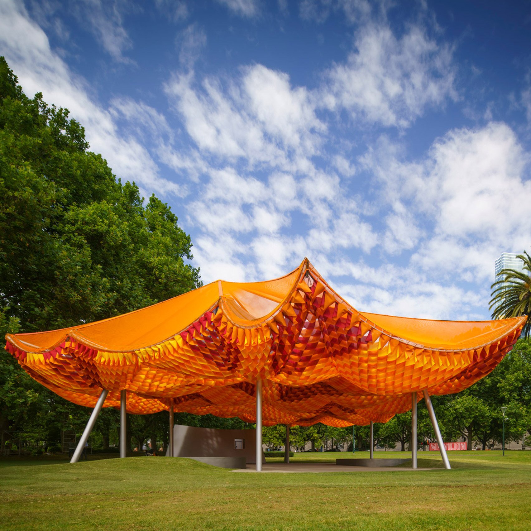 Topped with a bright orange canopy, the pavilion was designed to celebrate outdoor life in the city of Melbourne, while mimicking the feeling of being underneath a tree.
