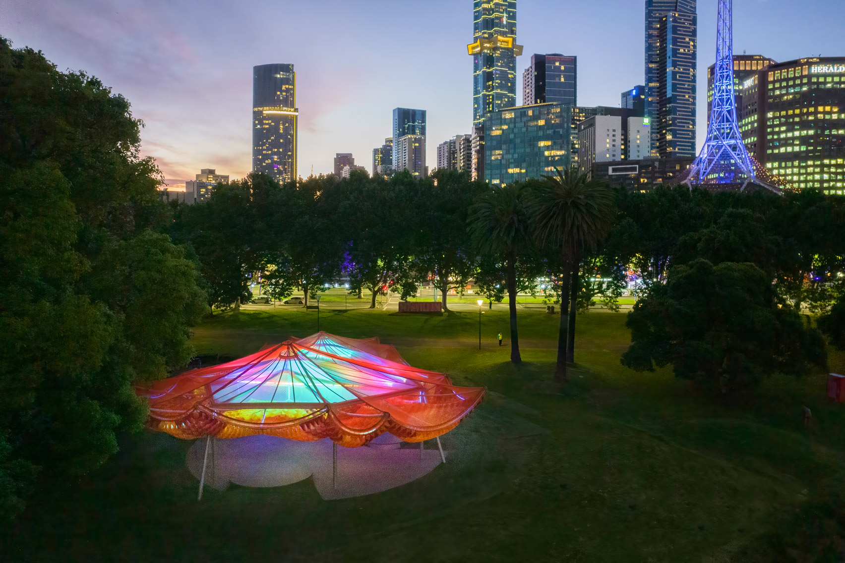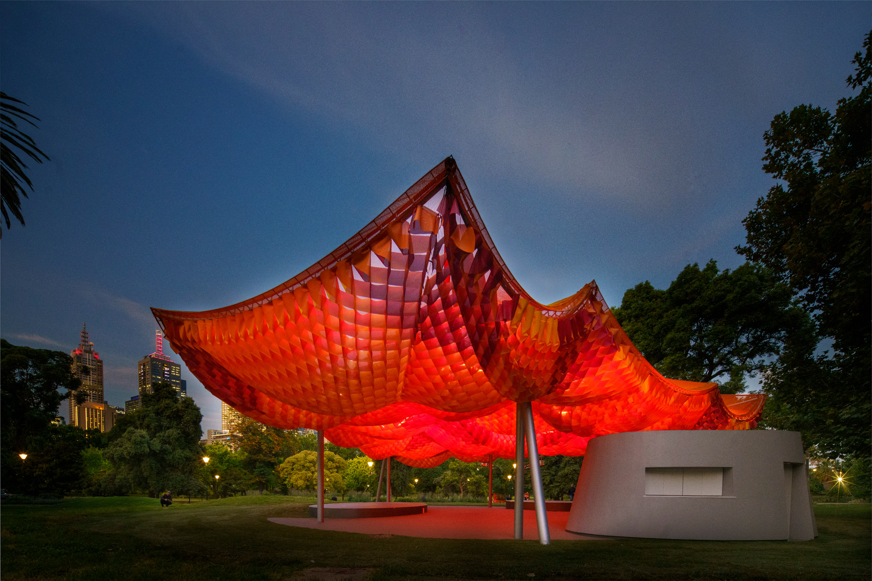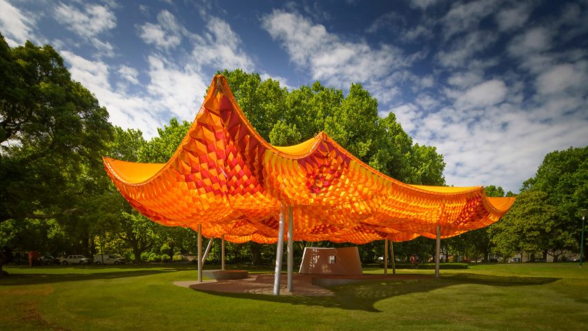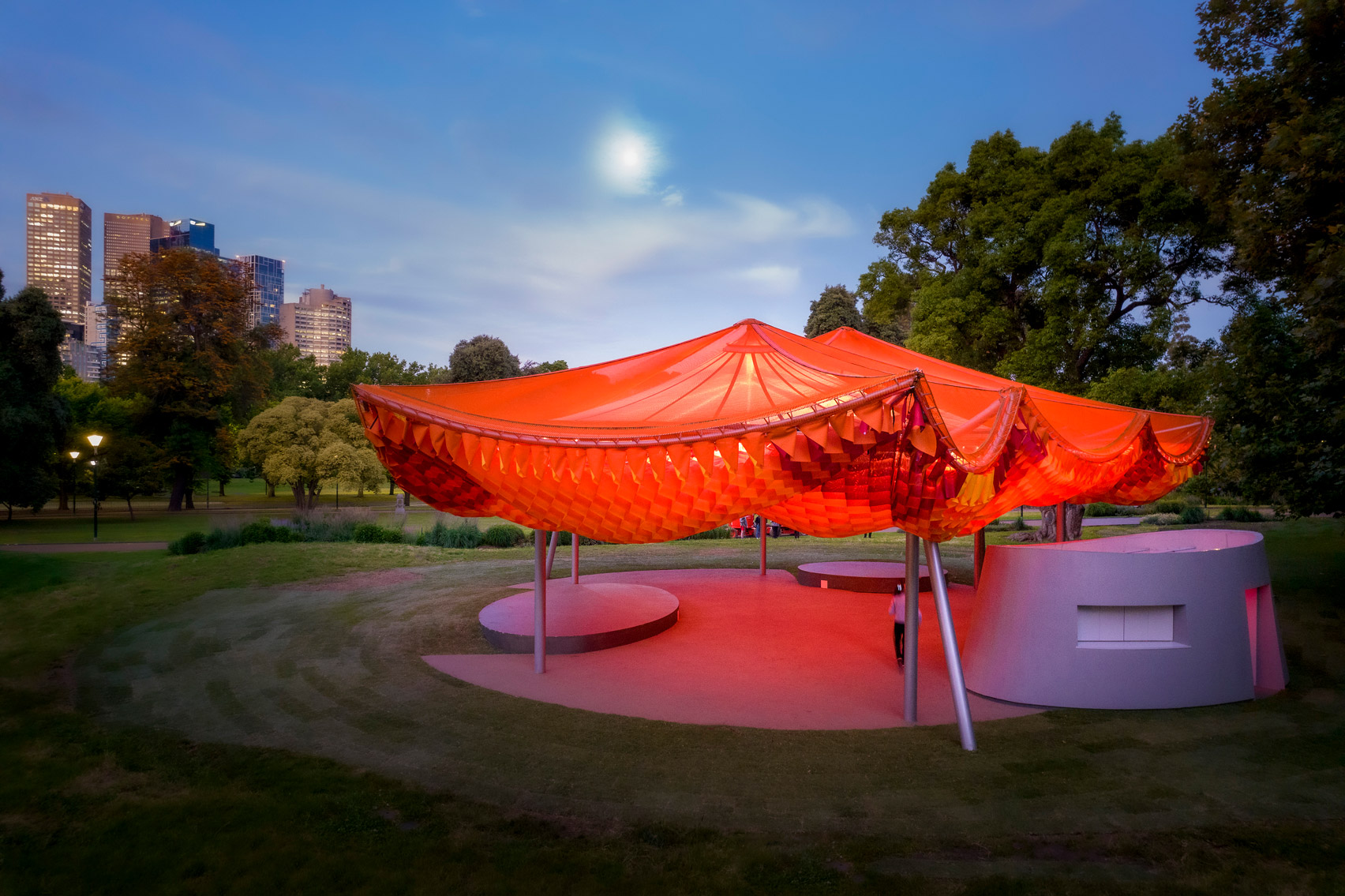 Topped with a bright orange canopy, the pavilion was designed to celebrate outdoor life in the city of Melbourne, while mimicking the feeling of being underneath a tree.