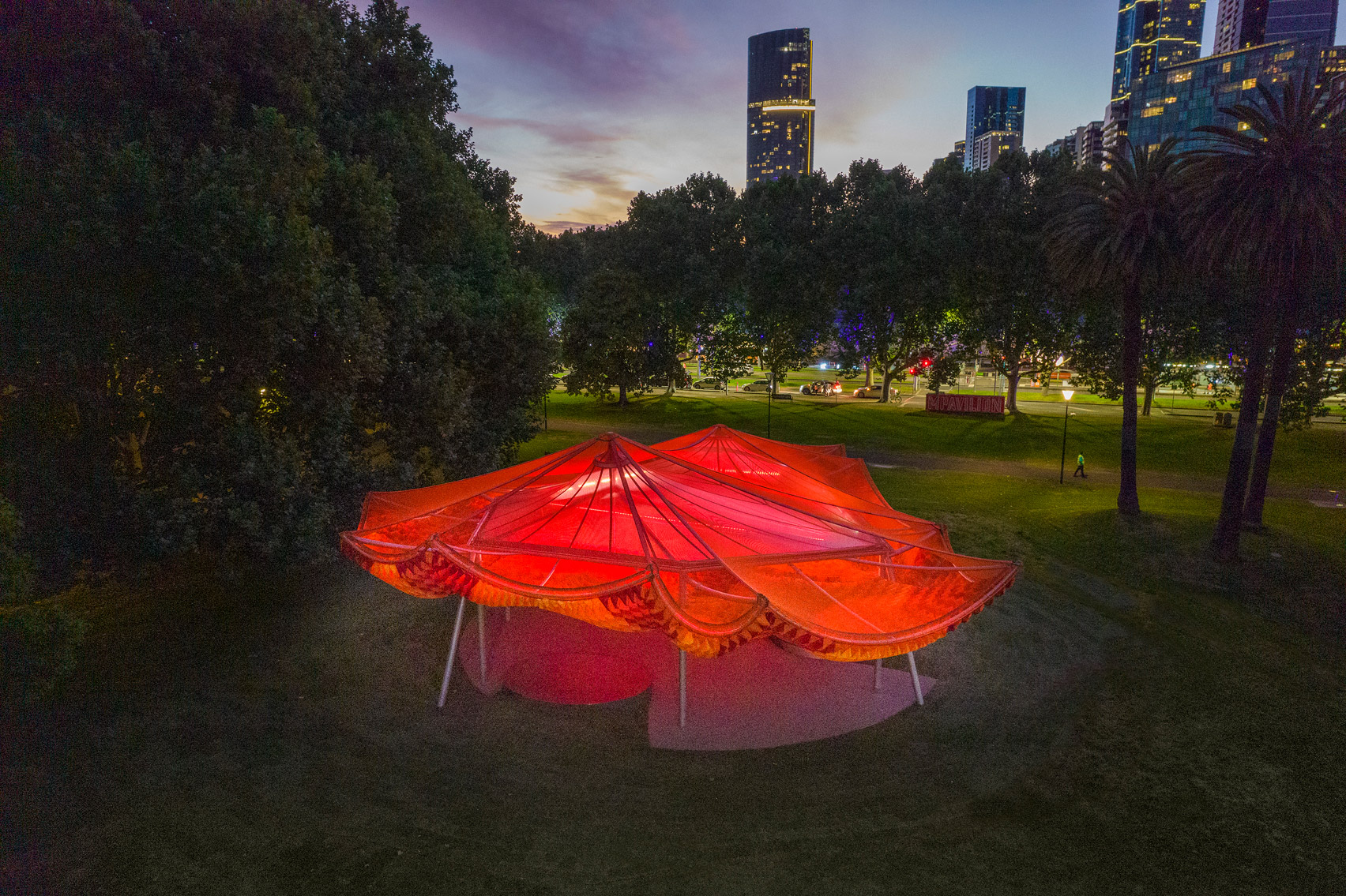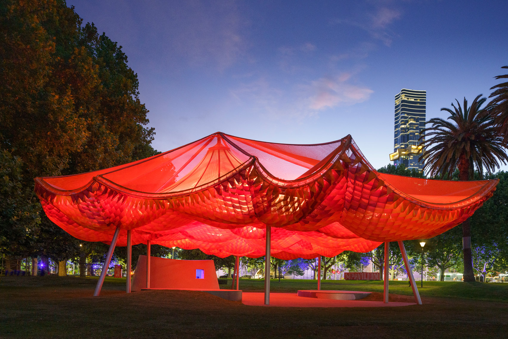All(zone) unveils bright orange fabric MPavilion in Melbourne