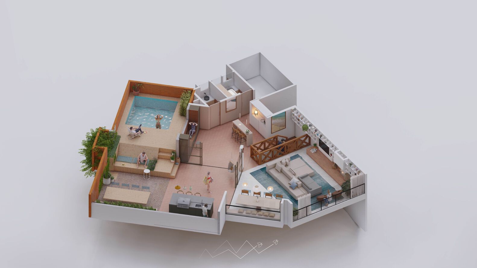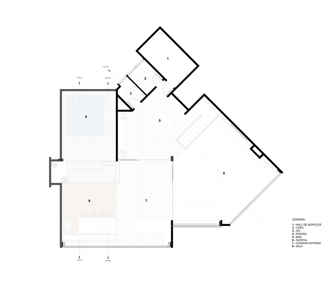 The aim is for such furniture and objects to be highlighted and valued amid walls and floors in neutral and light tones. In the external area, the original pool was separated by a flower box from the common area, creating a physical barrier between the spaces. For the area, a deck in the form of a grandstand was proposed in order to connect the pool level with the level of the external gourmet area, thus creating a fluid and continuous space for different uses. In addition, the deck's 45º shape is aligned with the sun for use as a lounger.