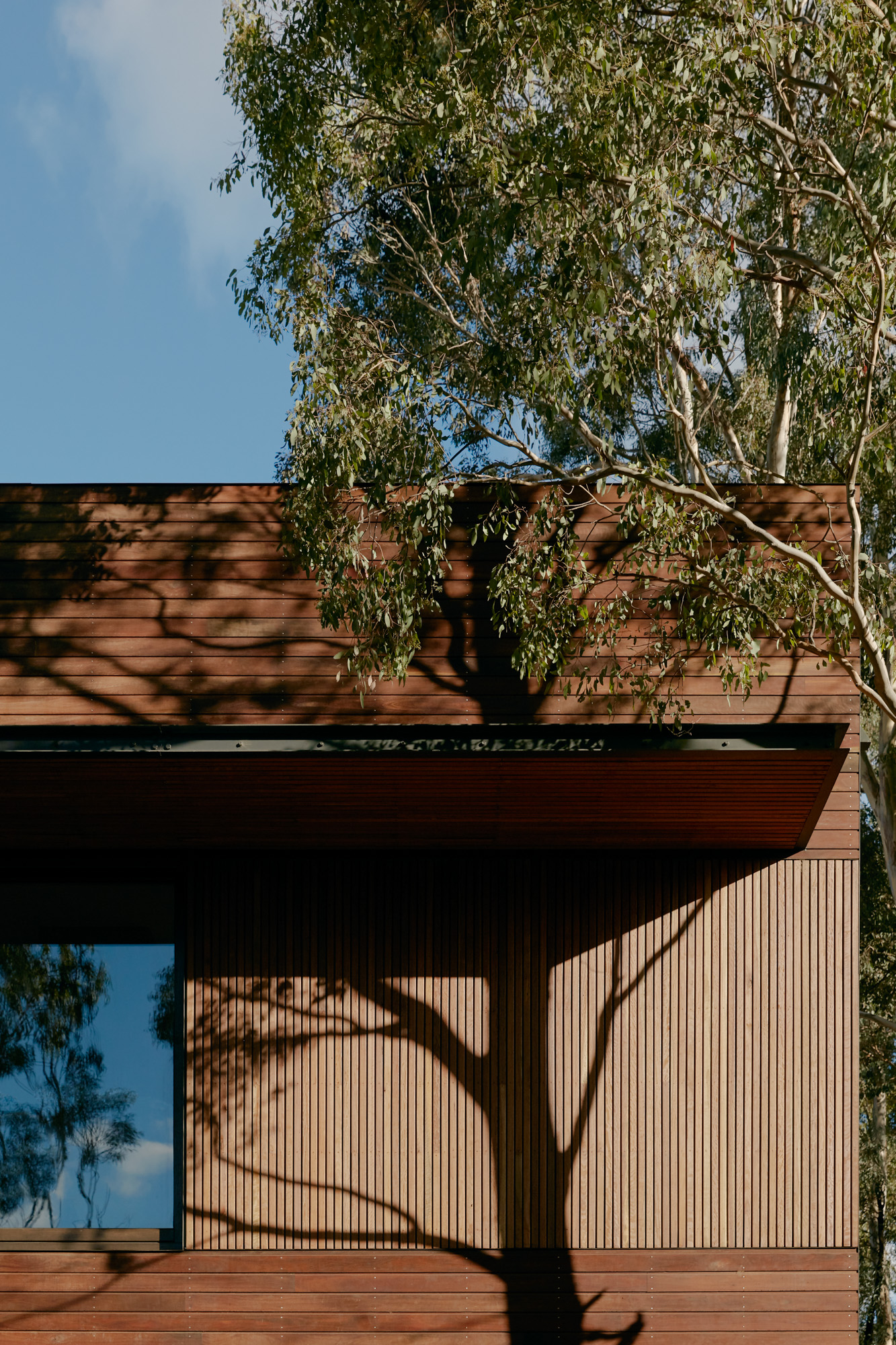 The resulting home is primal and elemental – a building that, in coexisting with the natural environment, amplifies the experience of it, and supports the client’s prioritisation of sustainability in every aspect of his life. In response to the steeply sloping site, the house is broken down into three pavilions that step down along the contour of the land, carefully preserving the existing mature gum trees. “Rather than looking at how we could make the site fit around a house, we looked at how the house could fit organically into the site,” explains Madeline. The primary outlook over the creek is to the west, so the design sought to open the house to this direction while providing shading and ventilation to ensure thermal comfort without the need for mechanical cooling.