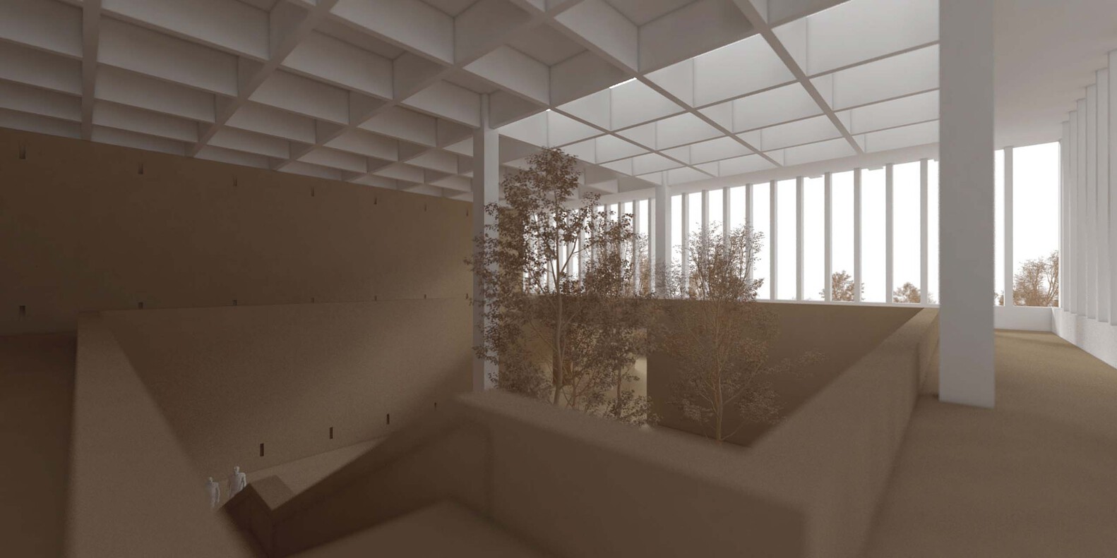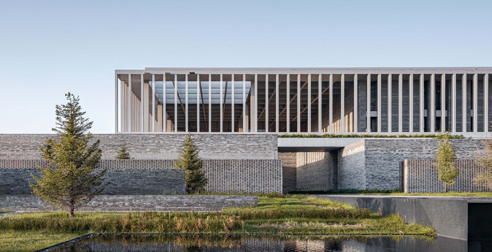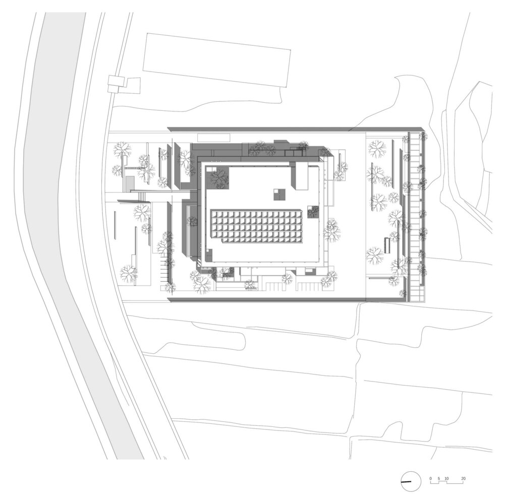 The surroundings of the project offered very low quality with newly constructed industrial buildings, dry landscape, and coal mines and it seemed interesting to develop the factory as an introverted building that would recreate its own natural environment. Besides satisfying all functional requirements, we thought of the project as a building that stimulates the human senses, that would propose a surprising experience to the visitor. The idea was to use a system of brick walls to enclose and hide the various technical spaces of the factory into an opaque ground floor and to set up, a simple concrete volume on the top of it, to host all the public spaces of the program. Patios and large gardens will pierce the whole building, to provide natural light while creating impressive spatial dilatations within the factory. Central production spaces will also get natural light from concrete sheds, opening the roof to the north light.