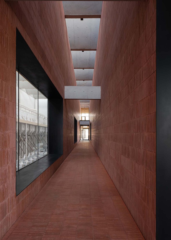 The system of brick walls starts from the front of the factory, where a landscape area is voluntarily left open to the use of the local community with benches and water pools for kids to play. Brick walls grow slowly from benches shape to become the propriety fence of the factory and later, the façade of the whole building. The shape taken by the brick walls will form and define the different entrances of the factory, each of them with a specific function: The raw materials delivery, the products loading, the staff, and the visitor entry. Separated into distinct paths, staff and visitors will never crossways inside the factory and while the workers will enjoy a functional organization, the visitor, will go through a planned spatial experience. For one moment only, the production line is showcased to the visitor in an elevated corridor overlooking the workshop.