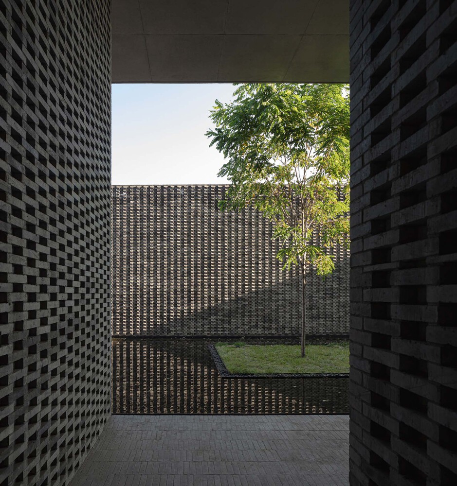 The dormitory for employees was set up in the back of the factory and conceived as an invisible architecture. The brick fence wall was thickened to host the building and patios were created to bring light to the rooms while preserving their intimacy. The space between the factory and the dorm becomes a garden in which a concrete table and square seats were set up.