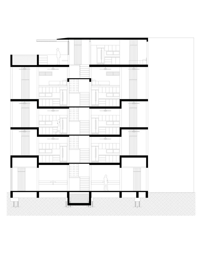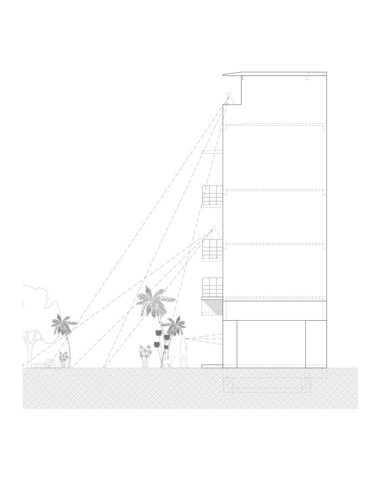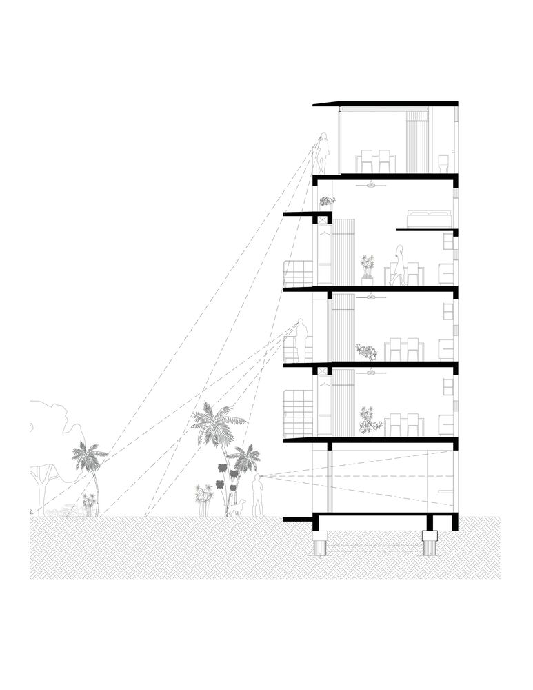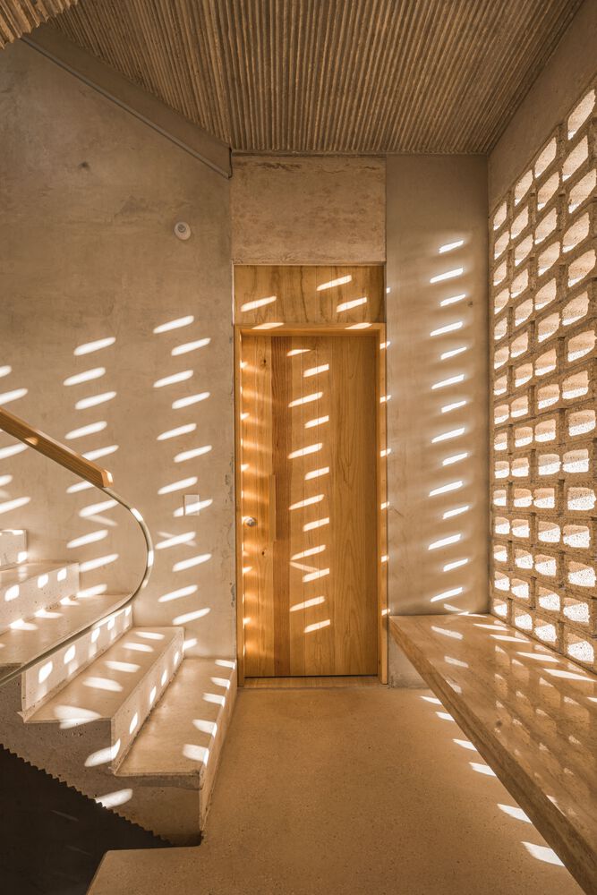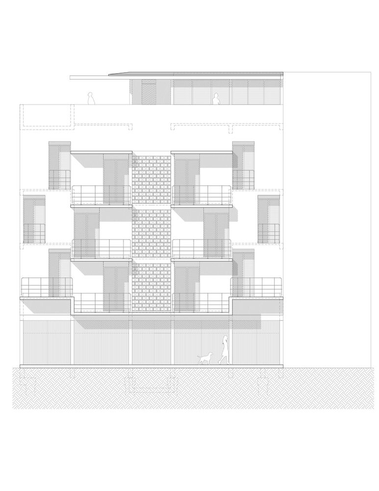 The apartments, regardless of their size, are dignified, and well lit, with natural ventilation and a perception of spaciousness. In addition to the implementation of solar cells and motion sensors, various passive technologies guarantee the proper functioning of the home. On the last level, in a cool and illuminated common space for living together, protected by an apparent concrete slab, the context that surrounds the building can be appreciated: the views include the neighborhood, the sea, the neighboring golf course, the rooftops of other households.