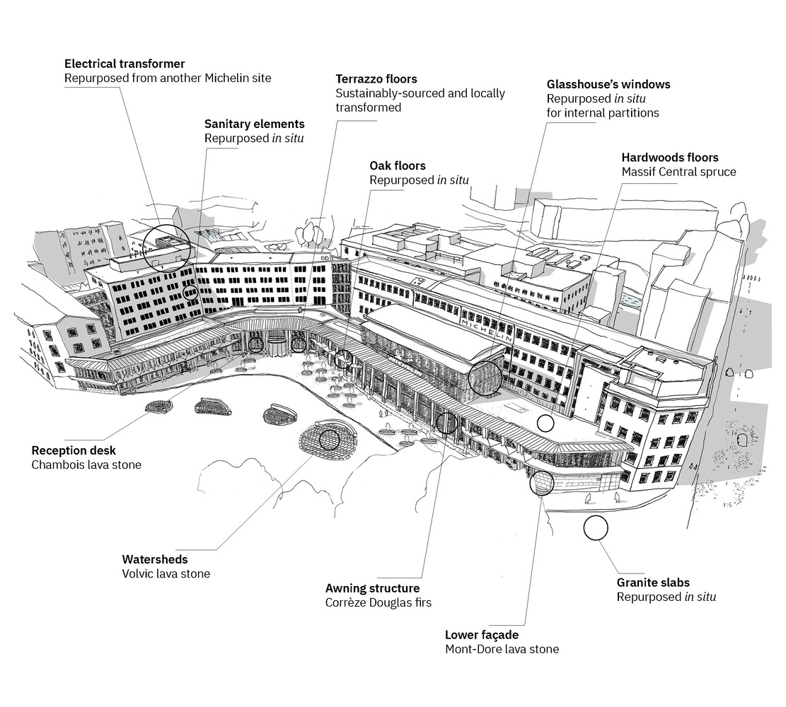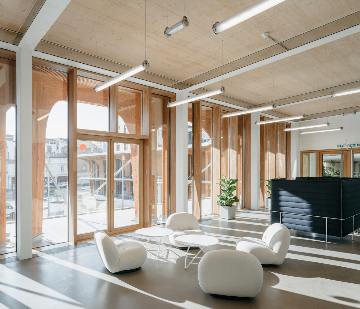 Implanted on the Carmes site of Clermont Ferrand since the company’s inception in the late 19th century, Michelin’s Canopy acquired its status as the company's headquarters in the 2000s. The project, delivered in 2021, and carried out in partnership between Encore Heureux Architectes, Construire, and Base, aims to embody the image of the group in a welcoming, unique, and cohesive space while inserting itself in an emblematic public square. The headquarters’ innovative new reception area symbolizes Michelin’s reinvention, conceived to face 21st-century challenges head-on; a design and operation that were conceptualized from a circular economy perspective, mindful of environmental impacts.
