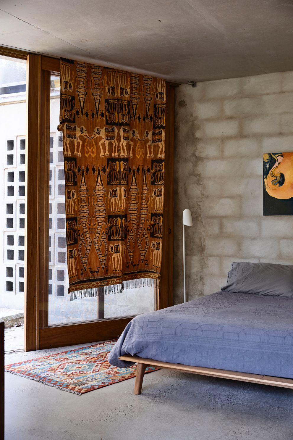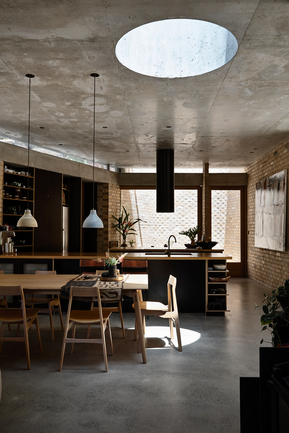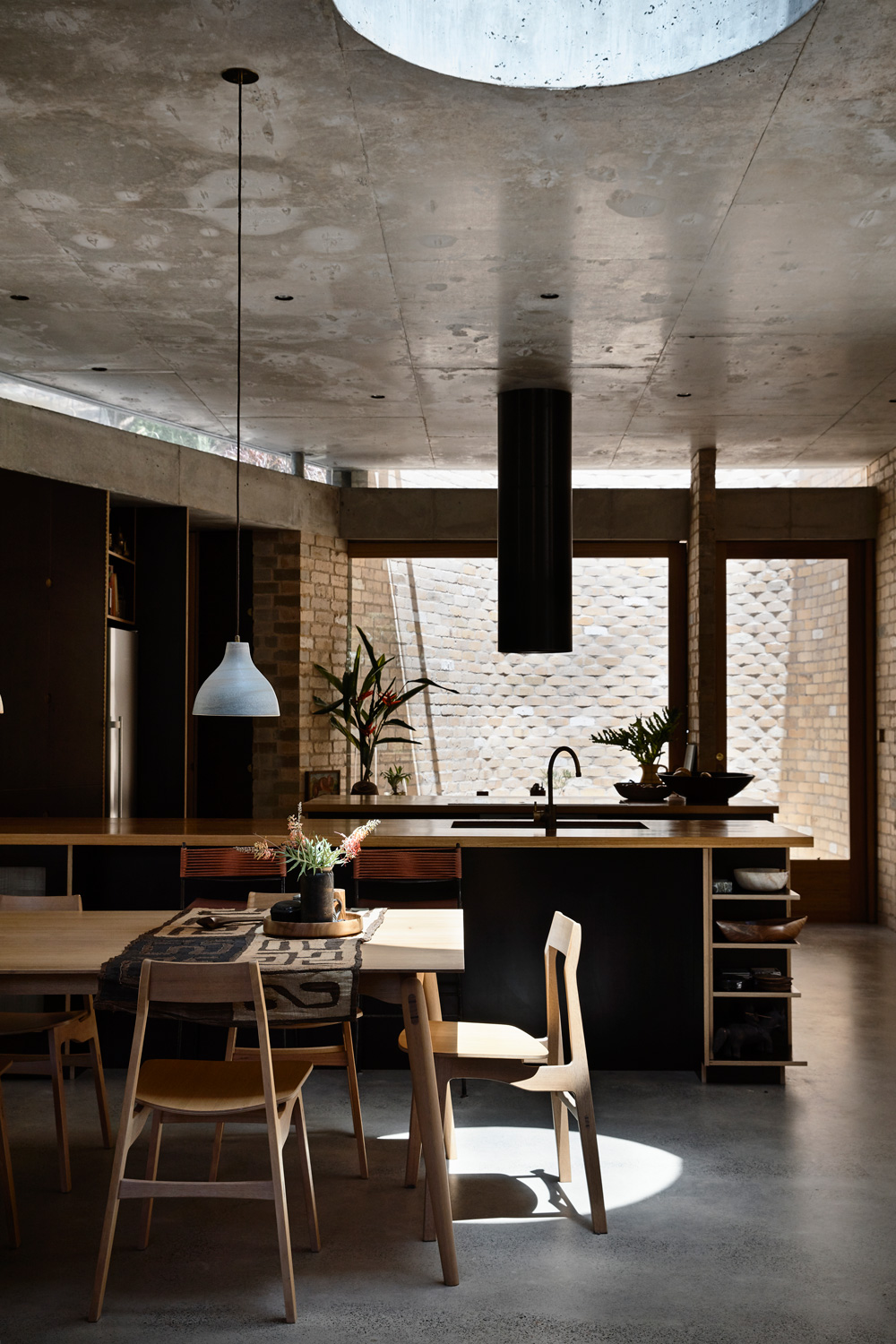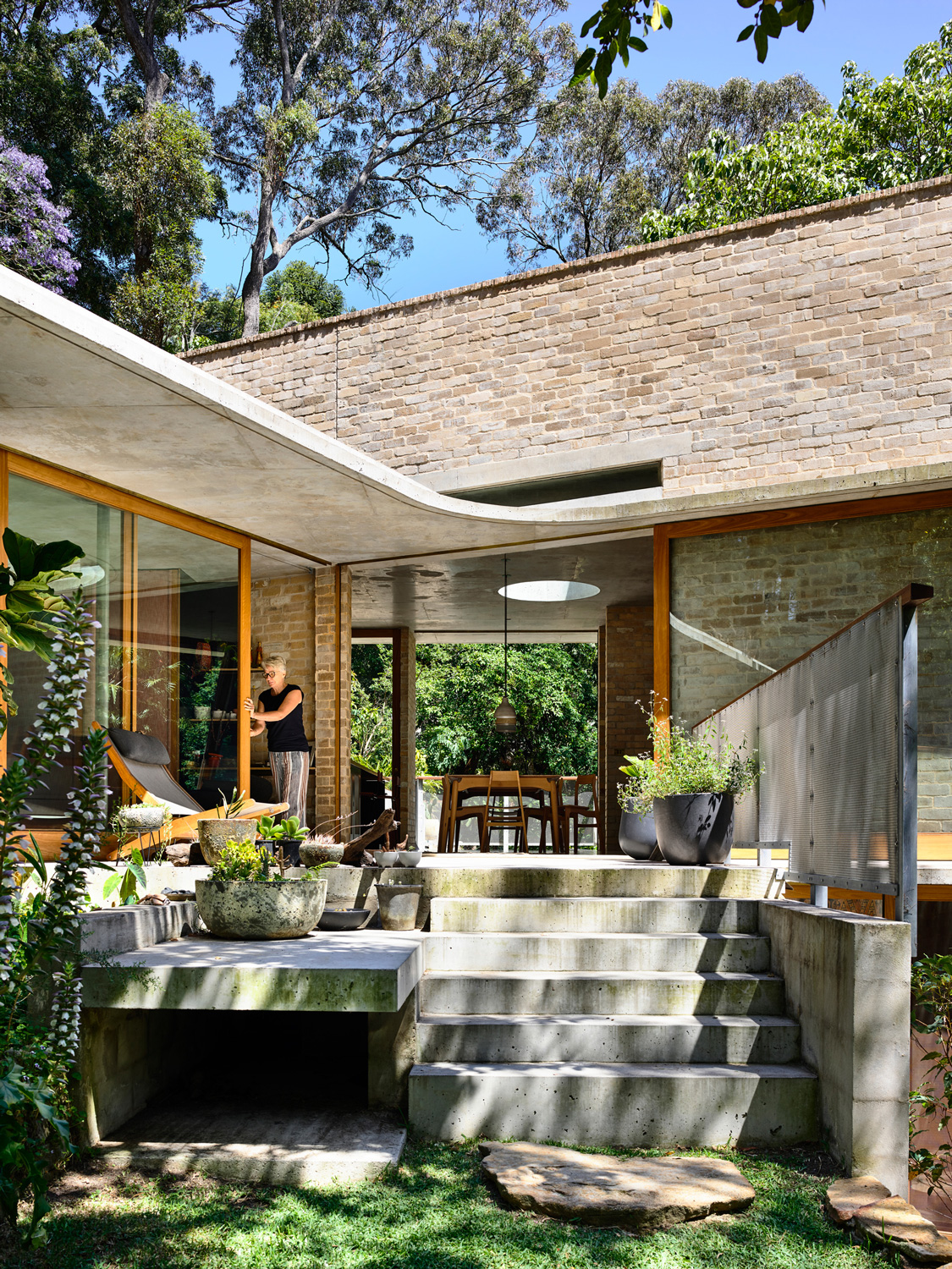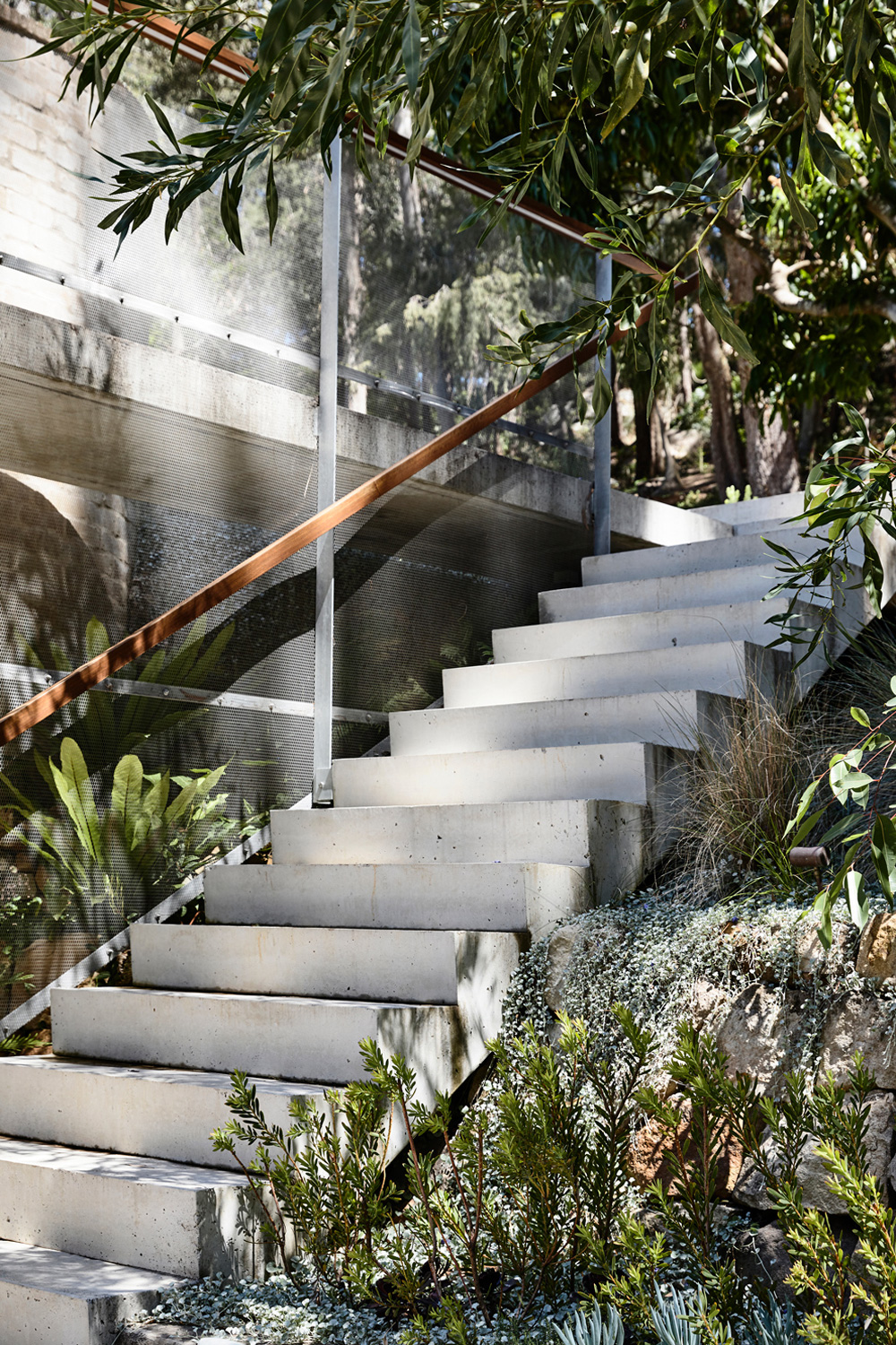 On such a steep landscape, flat land is at a premium, explains Peter Stutchbury, who designed the house along with architects Emma Trask and Belinda Koopman. A flat plateau offers space that can be used for recreation, whether in the form of vegetable gardens, somewhere to sit outdoors in the sun, a backyard cricket pitch, or a place to gather with friends and family. In order to devote the flat area of the land to recreation, it was consequential to site the building into the hill itself, acting as stairs between the plateau and the creek. “The creek is incredibly beautiful,” says Peter. “The noise, the smell and the coolness that comes from it are a real asset to the site. What’s very typical of our work is the connection with land and a respect of land and we felt that if we could construct a building that bridged from the plateau down to the creek, we could initiate this connection.”